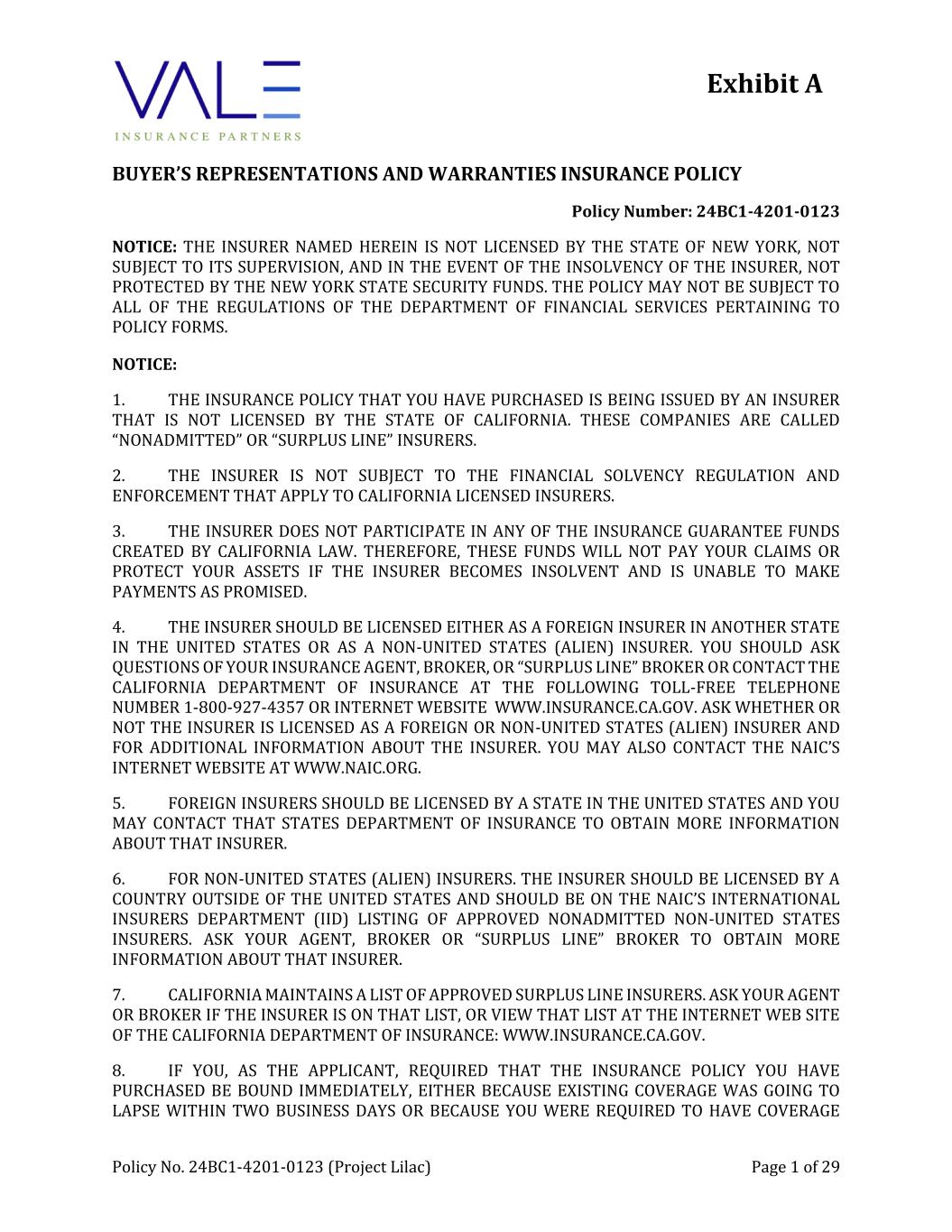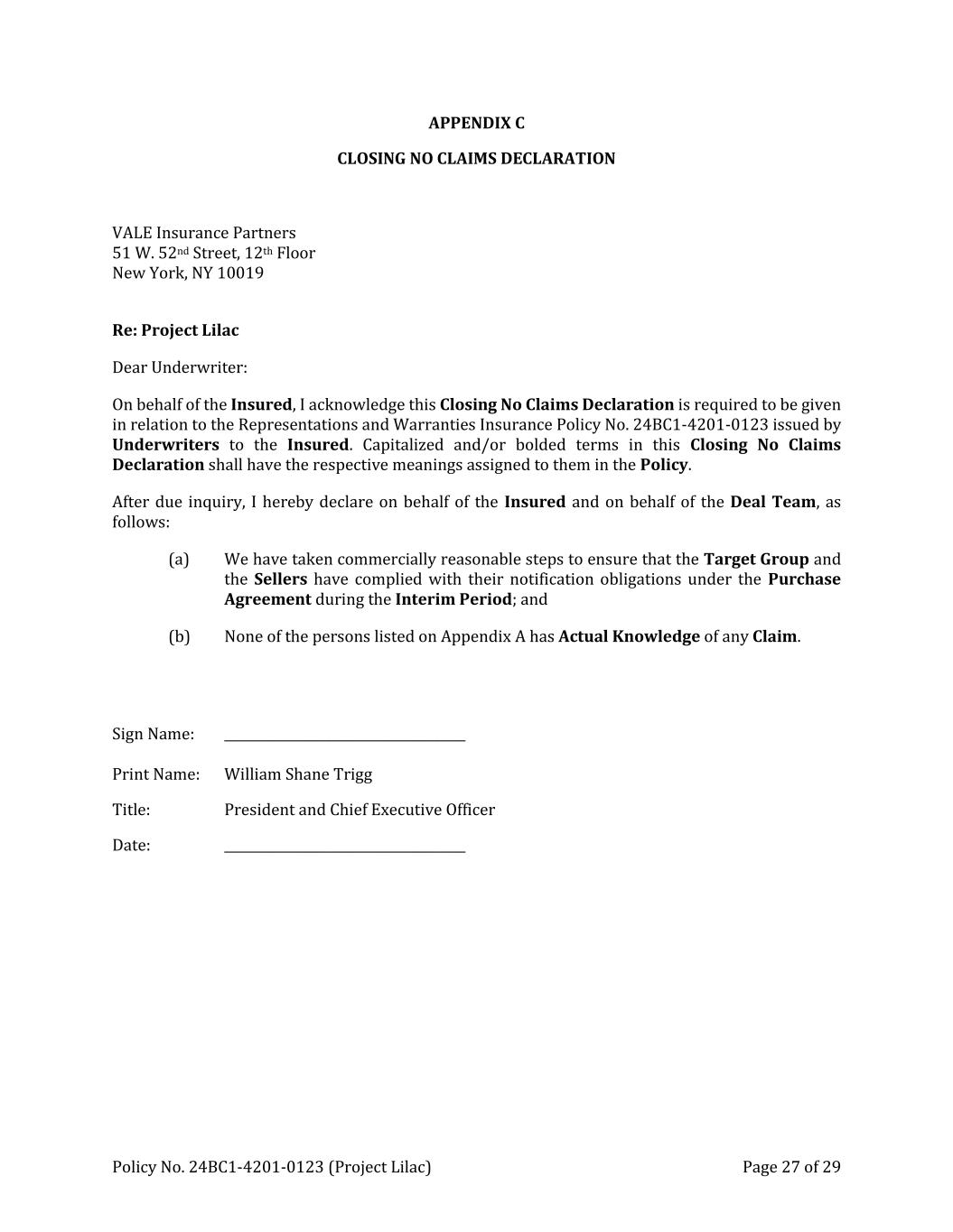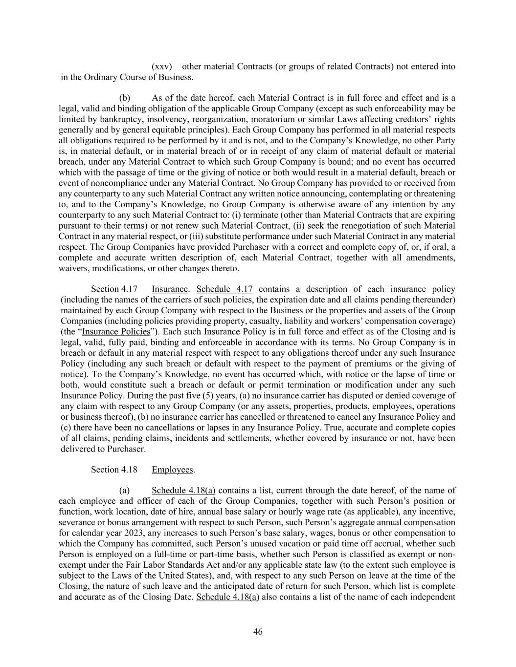 46 (xxv) other material Contracts (or groups of related Contracts) not entered into in the Ordinary Course of Business. (b) As of the date hereof, each Material Contract is in full force and effect and is a legal, valid and binding obligation of the applicable Group Company (except as such enforceability may be limited by bankruptcy, insolvency, reorganization, moratorium or similar Laws affecting creditors’ rights generally and by general equitable principles). Each Group Company has performed in all material respects all obligations required to be performed by it and is not, and to the Company’s Knowledge, no other Party is, in material default, or in material breach of or in receipt of any claim of material default or material breach, under any Material Contract to which such Group Company is bound; and no event has occurred which with the passage of time or the giving of notice or both would result in a material default, breach or event of noncompliance under any Material Contract. No Group Company has provided to or received from any counterparty to any such Material Contract any written notice announcing, contemplating or threatening to, and to the Company’s Knowledge, no Group Company is otherwise aware of any intention by any counterparty to any such Material Contract to: (i) terminate (other than Material Contracts that are expiring pursuant to their terms) or not renew such Material Contract, (ii) seek the renegotiation of such Material Contract in any material respect, or (iii) substitute performance under such Material Contract in any material respect. The Group Companies have provided Purchaser with a correct and complete copy of, or, if oral, a complete and accurate written description of, each Material Contract, together with all amendments, waivers, modifications, or other changes thereto. Section 4.17 Insurance. Schedule 4.17 contains a description of each insurance policy (including the names of the carriers of such policies, the expiration date and all claims pending thereunder) maintained by each Group Company with respect to the Business or the properties and assets of the Group Companies (including policies providing property, casualty, liability and workers’ compensation coverage) (the “Insurance Policies”). Each such Insurance Policy is in full force and effect as of the Closing and is legal, valid, fully paid, binding and enforceable in accordance with its terms. No Group Company is in breach or default in any material respect with respect to any obligations thereof under any such Insurance Policy (including any such breach or default with respect to the payment of premiums or the giving of notice). To the Company’s Knowledge, no event has occurred which, with notice or the lapse of time or both, would constitute such a breach or default or permit termination or modification under any such Insurance Policy. During the past five (5) years, (a) no insurance carrier has disputed or denied coverage of any claim with respect to any Group Company (or any assets, properties, products, employees, operations or business thereof), (b) no insurance carrier has cancelled or threatened to cancel any Insurance Policy and (c) there have been no cancellations or lapses in any Insurance Policy. True, accurate and complete copies of all claims, pending claims, incidents and settlements, whether covered by insurance or not, have been delivered to Purchaser. Section 4.18 Employees. (a) Schedule 4.18(a) contains a list, current through the date hereof, of the name of each employee and officer of each of the Group Companies, together with such Person’s position or function, work location, date of hire, annual base salary or hourly wage rate (as applicable), any incentive, severance or bonus arrangement with respect to such Person, such Person’s aggregate annual compensation for calendar year 2023, any increases to such Person’s base salary, wages, bonus or other compensation to which the Company has committed, such Person’s unused vacation or paid time off accrual, whether such Person is employed on a full-time or part-time basis, whether such Person is classified as exempt or non- exempt under the Fair Labor Standards Act and/or any applicable state law (to the extent such employee is subject to the Laws of the United States), and, with respect to any such Person on leave at the time of the Closing, the nature of such leave and the anticipated date of return for such Person, which list is complete and accurate as of the Closing Date. Schedule 4.18(a) also contains a list of the name of each independent