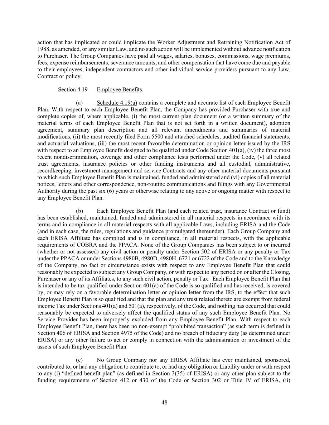 48 action that has implicated or could implicate the Worker Adjustment and Retraining Notification Act of 1988, as amended, or any similar Law, and no such action will be implemented without advance notification to Purchaser. The Group Companies have paid all wages, salaries, bonuses, commissions, wage premiums, fees, expense reimbursements, severance amounts, and other compensation that have come due and payable to their employees, independent contractors and other individual service providers pursuant to any Law, Contract or policy. Section 4.19 Employee Benefits. (a) Schedule 4.19(a) contains a complete and accurate list of each Employee Benefit Plan. With respect to each Employee Benefit Plan, the Company has provided Purchaser with true and complete copies of, where applicable, (i) the most current plan document (or a written summary of the material terms of each Employee Benefit Plan that is not set forth in a written document), adoption agreement, summary plan description and all relevant amendments and summaries of material modifications, (ii) the most recently filed Form 5500 and attached schedules, audited financial statements, and actuarial valuations, (iii) the most recent favorable determination or opinion letter issued by the IRS with respect to an Employee Benefit designed to be qualified under Code Section 401(a), (iv) the three most recent nondiscrimination, coverage and other compliance tests performed under the Code, (v) all related trust agreements, insurance policies or other funding instruments and all custodial, administrative, recordkeeping, investment management and service Contracts and any other material documents pursuant to which such Employee Benefit Plan is maintained, funded and administered and (vi) copies of all material notices, letters and other correspondence, non-routine communications and filings with any Governmental Authority during the past six (6) years or otherwise relating to any active or ongoing matter with respect to any Employee Benefit Plan. (b) Each Employee Benefit Plan (and each related trust, insurance Contract or fund) has been established, maintained, funded and administered in all material respects in accordance with its terms and in compliance in all material respects with all applicable Laws, including ERISA and the Code (and in each case, the rules, regulations and guidance promulgated thereunder). Each Group Company and each ERISA Affiliate has complied and is in compliance, in all material respects, with the applicable requirements of COBRA and the PPACA. None of the Group Companies has been subject to or incurred (whether or not assessed) any civil action or penalty under Section 502 of ERISA or any penalty or Tax under the PPACA or under Sections 4980B, 4980D, 4980H, 6721 or 6722 of the Code and to the Knowledge of the Company, no fact or circumstance exists with respect to any Employee Benefit Plan that could reasonably be expected to subject any Group Company, or with respect to any period on or after the Closing, Purchaser or any of its Affiliates, to any such civil action, penalty or Tax. Each Employee Benefit Plan that is intended to be tax qualified under Section 401(a) of the Code is so qualified and has received, is covered by, or may rely on a favorable determination letter or opinion letter from the IRS, to the effect that such Employee Benefit Plan is so qualified and that the plan and any trust related thereto are exempt from federal income Tax under Sections 401(a) and 501(a), respectively, of the Code, and nothing has occurred that could reasonably be expected to adversely affect the qualified status of any such Employee Benefit Plan. No Service Provider has been improperly excluded from any Employee Benefit Plan. With respect to each Employee Benefit Plan, there has been no non-exempt “prohibited transaction” (as such term is defined in Section 406 of ERISA and Section 4975 of the Code) and no breach of fiduciary duty (as determined under ERISA) or any other failure to act or comply in connection with the administration or investment of the assets of such Employee Benefit Plan. (c) No Group Company nor any ERISA Affiliate has ever maintained, sponsored, contributed to, or had any obligation to contribute to, or had any obligation or Liability under or with respect to any (i) “defined benefit plan” (as defined in Section 3(35) of ERISA) or any other plan subject to the funding requirements of Section 412 or 430 of the Code or Section 302 or Title IV of ERISA, (ii)