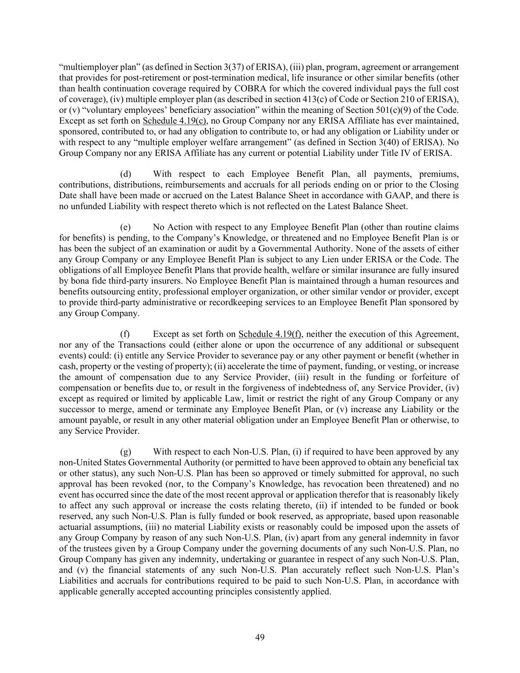 49 “multiemployer plan” (as defined in Section 3(37) of ERISA), (iii) plan, program, agreement or arrangement that provides for post-retirement or post-termination medical, life insurance or other similar benefits (other than health continuation coverage required by COBRA for which the covered individual pays the full cost of coverage), (iv) multiple employer plan (as described in section 413(c) of Code or Section 210 of ERISA), or (v) “voluntary employees’ beneficiary association” within the meaning of Section 501(c)(9) of the Code. Except as set forth on Schedule 4.19(c), no Group Company nor any ERISA Affiliate has ever maintained, sponsored, contributed to, or had any obligation to contribute to, or had any obligation or Liability under or with respect to any “multiple employer welfare arrangement” (as defined in Section 3(40) of ERISA). No Group Company nor any ERISA Affiliate has any current or potential Liability under Title IV of ERISA. (d) With respect to each Employee Benefit Plan, all payments, premiums, contributions, distributions, reimbursements and accruals for all periods ending on or prior to the Closing Date shall have been made or accrued on the Latest Balance Sheet in accordance with GAAP, and there is no unfunded Liability with respect thereto which is not reflected on the Latest Balance Sheet. (e) No Action with respect to any Employee Benefit Plan (other than routine claims for benefits) is pending, to the Company’s Knowledge, or threatened and no Employee Benefit Plan is or has been the subject of an examination or audit by a Governmental Authority. None of the assets of either any Group Company or any Employee Benefit Plan is subject to any Lien under ERISA or the Code. The obligations of all Employee Benefit Plans that provide health, welfare or similar insurance are fully insured by bona fide third-party insurers. No Employee Benefit Plan is maintained through a human resources and benefits outsourcing entity, professional employer organization, or other similar vendor or provider, except to provide third-party administrative or recordkeeping services to an Employee Benefit Plan sponsored by any Group Company. (f) Except as set forth on Schedule 4.19(f), neither the execution of this Agreement, nor any of the Transactions could (either alone or upon the occurrence of any additional or subsequent events) could: (i) entitle any Service Provider to severance pay or any other payment or benefit (whether in cash, property or the vesting of property); (ii) accelerate the time of payment, funding, or vesting, or increase the amount of compensation due to any Service Provider, (iii) result in the funding or forfeiture of compensation or benefits due to, or result in the forgiveness of indebtedness of, any Service Provider, (iv) except as required or limited by applicable Law, limit or restrict the right of any Group Company or any successor to merge, amend or terminate any Employee Benefit Plan, or (v) increase any Liability or the amount payable, or result in any other material obligation under an Employee Benefit Plan or otherwise, to any Service Provider. (g) With respect to each Non-U.S. Plan, (i) if required to have been approved by any non-United States Governmental Authority (or permitted to have been approved to obtain any beneficial tax or other status), any such Non-U.S. Plan has been so approved or timely submitted for approval, no such approval has been revoked (nor, to the Company’s Knowledge, has revocation been threatened) and no event has occurred since the date of the most recent approval or application therefor that is reasonably likely to affect any such approval or increase the costs relating thereto, (ii) if intended to be funded or book reserved, any such Non-U.S. Plan is fully funded or book reserved, as appropriate, based upon reasonable actuarial assumptions, (iii) no material Liability exists or reasonably could be imposed upon the assets of any Group Company by reason of any such Non-U.S. Plan, (iv) apart from any general indemnity in favor of the trustees given by a Group Company under the governing documents of any such Non-U.S. Plan, no Group Company has given any indemnity, undertaking or guarantee in respect of any such Non-U.S. Plan, and (v) the financial statements of any such Non-U.S. Plan accurately reflect such Non-U.S. Plan’s Liabilities and accruals for contributions required to be paid to such Non-U.S. Plan, in accordance with applicable generally accepted accounting principles consistently applied.