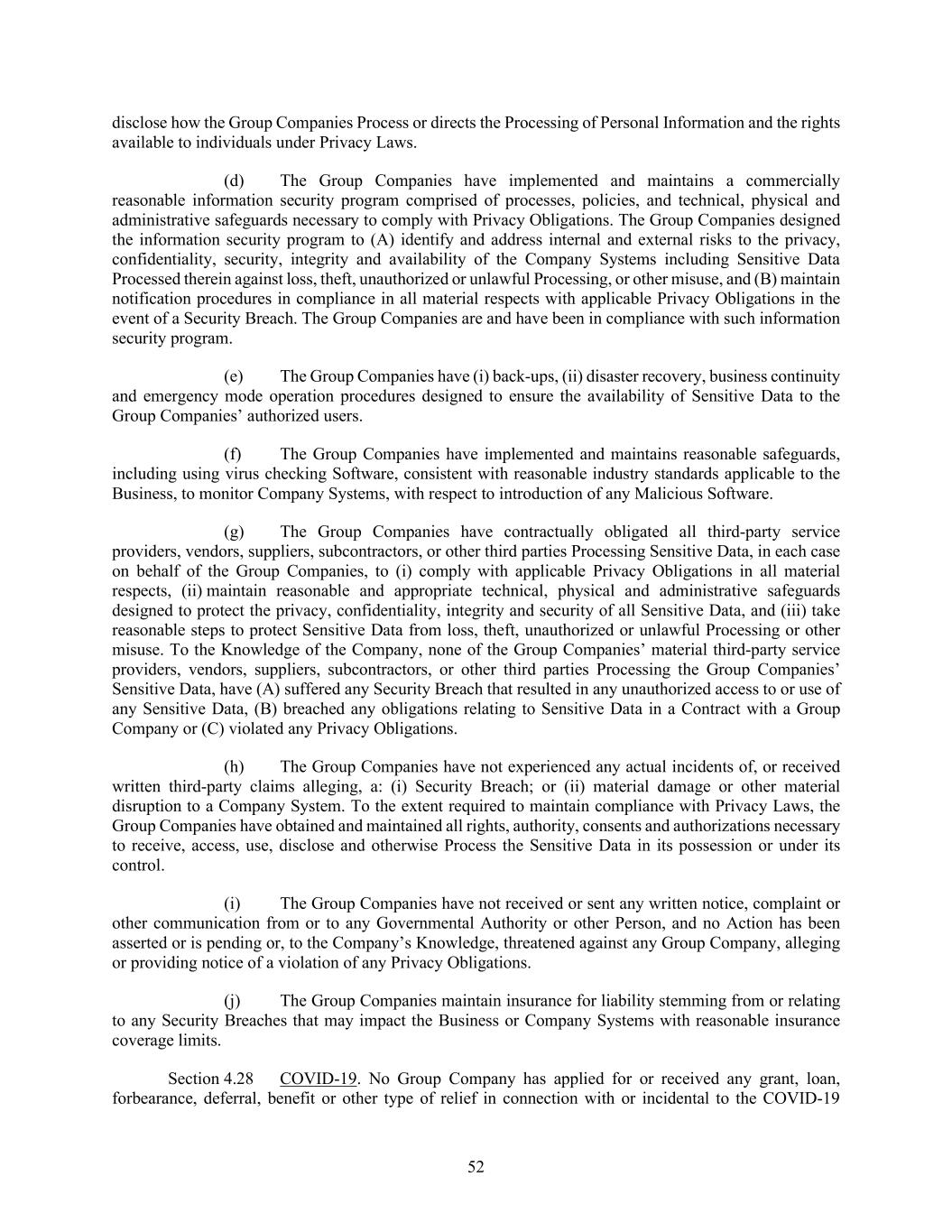 52 disclose how the Group Companies Process or directs the Processing of Personal Information and the rights available to individuals under Privacy Laws. (d) The Group Companies have implemented and maintains a commercially reasonable information security program comprised of processes, policies, and technical, physical and administrative safeguards necessary to comply with Privacy Obligations. The Group Companies designed the information security program to (A) identify and address internal and external risks to the privacy, confidentiality, security, integrity and availability of the Company Systems including Sensitive Data Processed therein against loss, theft, unauthorized or unlawful Processing, or other misuse, and (B) maintain notification procedures in compliance in all material respects with applicable Privacy Obligations in the event of a Security Breach. The Group Companies are and have been in compliance with such information security program. (e) The Group Companies have (i) back-ups, (ii) disaster recovery, business continuity and emergency mode operation procedures designed to ensure the availability of Sensitive Data to the Group Companies’ authorized users. (f) The Group Companies have implemented and maintains reasonable safeguards, including using virus checking Software, consistent with reasonable industry standards applicable to the Business, to monitor Company Systems, with respect to introduction of any Malicious Software. (g) The Group Companies have contractually obligated all third-party service providers, vendors, suppliers, subcontractors, or other third parties Processing Sensitive Data, in each case on behalf of the Group Companies, to (i) comply with applicable Privacy Obligations in all material respects, (ii) maintain reasonable and appropriate technical, physical and administrative safeguards designed to protect the privacy, confidentiality, integrity and security of all Sensitive Data, and (iii) take reasonable steps to protect Sensitive Data from loss, theft, unauthorized or unlawful Processing or other misuse. To the Knowledge of the Company, none of the Group Companies’ material third-party service providers, vendors, suppliers, subcontractors, or other third parties Processing the Group Companies’ Sensitive Data, have (A) suffered any Security Breach that resulted in any unauthorized access to or use of any Sensitive Data, (B) breached any obligations relating to Sensitive Data in a Contract with a Group Company or (C) violated any Privacy Obligations. (h) The Group Companies have not experienced any actual incidents of, or received written third-party claims alleging, a: (i) Security Breach; or (ii) material damage or other material disruption to a Company System. To the extent required to maintain compliance with Privacy Laws, the Group Companies have obtained and maintained all rights, authority, consents and authorizations necessary to receive, access, use, disclose and otherwise Process the Sensitive Data in its possession or under its control. (i) The Group Companies have not received or sent any written notice, complaint or other communication from or to any Governmental Authority or other Person, and no Action has been asserted or is pending or, to the Company’s Knowledge, threatened against any Group Company, alleging or providing notice of a violation of any Privacy Obligations. (j) The Group Companies maintain insurance for liability stemming from or relating to any Security Breaches that may impact the Business or Company Systems with reasonable insurance coverage limits. Section 4.28 COVID-19. No Group Company has applied for or received any grant, loan, forbearance, deferral, benefit or other type of relief in connection with or incidental to the COVID-19
