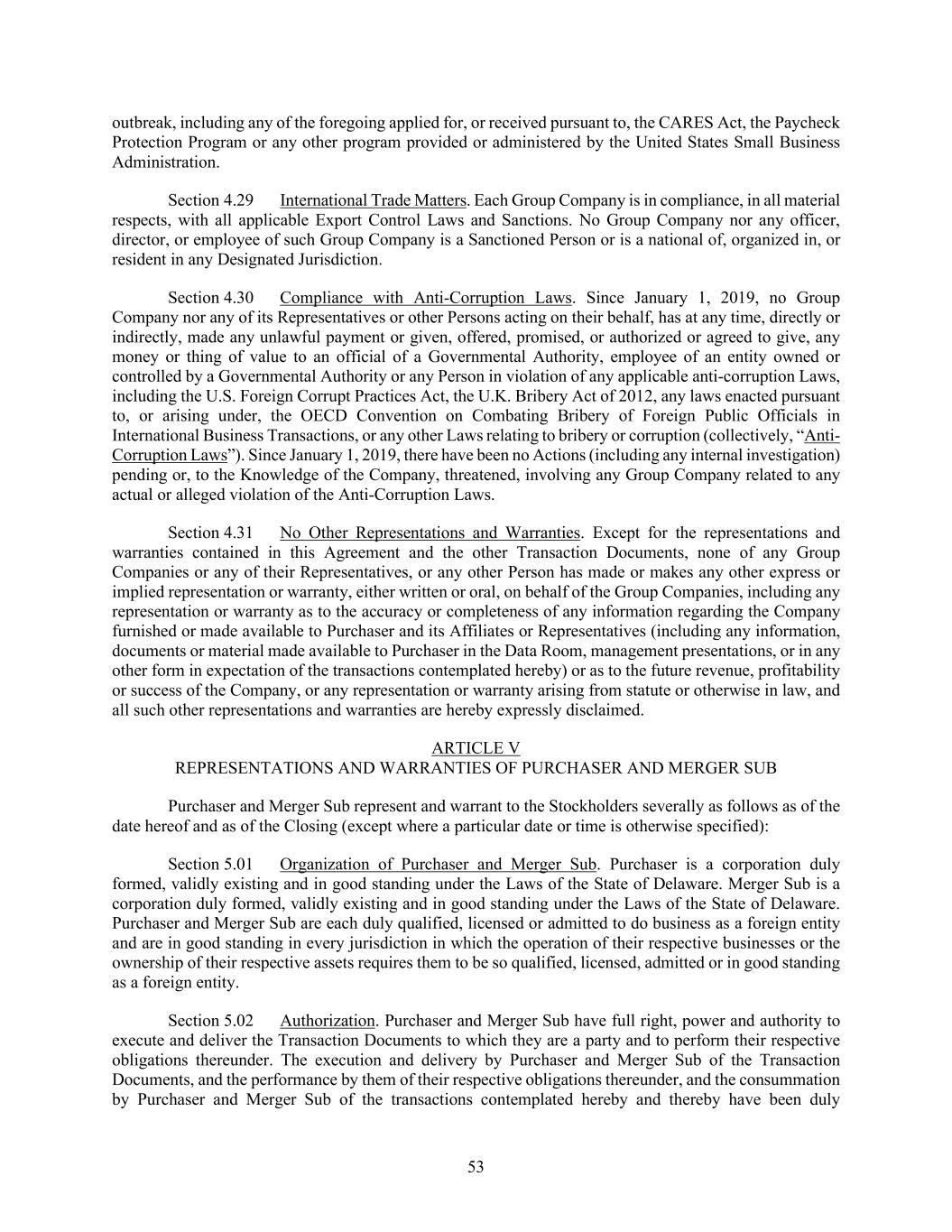 53 outbreak, including any of the foregoing applied for, or received pursuant to, the CARES Act, the Paycheck Protection Program or any other program provided or administered by the United States Small Business Administration. Section 4.29 International Trade Matters. Each Group Company is in compliance, in all material respects, with all applicable Export Control Laws and Sanctions. No Group Company nor any officer, director, or employee of such Group Company is a Sanctioned Person or is a national of, organized in, or resident in any Designated Jurisdiction. Section 4.30 Compliance with Anti-Corruption Laws. Since January 1, 2019, no Group Company nor any of its Representatives or other Persons acting on their behalf, has at any time, directly or indirectly, made any unlawful payment or given, offered, promised, or authorized or agreed to give, any money or thing of value to an official of a Governmental Authority, employee of an entity owned or controlled by a Governmental Authority or any Person in violation of any applicable anti-corruption Laws, including the U.S. Foreign Corrupt Practices Act, the U.K. Bribery Act of 2012, any laws enacted pursuant to, or arising under, the OECD Convention on Combating Bribery of Foreign Public Officials in International Business Transactions, or any other Laws relating to bribery or corruption (collectively, “Anti- Corruption Laws”). Since January 1, 2019, there have been no Actions (including any internal investigation) pending or, to the Knowledge of the Company, threatened, involving any Group Company related to any actual or alleged violation of the Anti-Corruption Laws. Section 4.31 No Other Representations and Warranties. Except for the representations and warranties contained in this Agreement and the other Transaction Documents, none of any Group Companies or any of their Representatives, or any other Person has made or makes any other express or implied representation or warranty, either written or oral, on behalf of the Group Companies, including any representation or warranty as to the accuracy or completeness of any information regarding the Company furnished or made available to Purchaser and its Affiliates or Representatives (including any information, documents or material made available to Purchaser in the Data Room, management presentations, or in any other form in expectation of the transactions contemplated hereby) or as to the future revenue, profitability or success of the Company, or any representation or warranty arising from statute or otherwise in law, and all such other representations and warranties are hereby expressly disclaimed. ARTICLE V REPRESENTATIONS AND WARRANTIES OF PURCHASER AND MERGER SUB Purchaser and Merger Sub represent and warrant to the Stockholders severally as follows as of the date hereof and as of the Closing (except where a particular date or time is otherwise specified): Section 5.01 Organization of Purchaser and Merger Sub. Purchaser is a corporation duly formed, validly existing and in good standing under the Laws of the State of Delaware. Merger Sub is a corporation duly formed, validly existing and in good standing under the Laws of the State of Delaware. Purchaser and Merger Sub are each duly qualified, licensed or admitted to do business as a foreign entity and are in good standing in every jurisdiction in which the operation of their respective businesses or the ownership of their respective assets requires them to be so qualified, licensed, admitted or in good standing as a foreign entity. Section 5.02 Authorization. Purchaser and Merger Sub have full right, power and authority to execute and deliver the Transaction Documents to which they are a party and to perform their respective obligations thereunder. The execution and delivery by Purchaser and Merger Sub of the Transaction Documents, and the performance by them of their respective obligations thereunder, and the consummation by Purchaser and Merger Sub of the transactions contemplated hereby and thereby have been duly