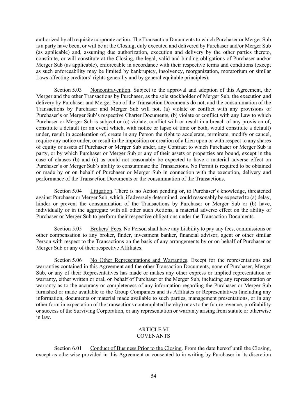 54 authorized by all requisite corporate action. The Transaction Documents to which Purchaser or Merger Sub is a party have been, or will be at the Closing, duly executed and delivered by Purchaser and/or Merger Sub (as applicable) and, assuming due authorization, execution and delivery by the other parties thereto, constitute, or will constitute at the Closing, the legal, valid and binding obligations of Purchaser and/or Merger Sub (as applicable), enforceable in accordance with their respective terms and conditions (except as such enforceability may be limited by bankruptcy, insolvency, reorganization, moratorium or similar Laws affecting creditors’ rights generally and by general equitable principles). Section 5.03 Noncontravention. Subject to the approval and adoption of this Agreement, the Merger and the other Transactions by Purchaser, as the sole stockholder of Merger Sub, the execution and delivery by Purchaser and Merger Sub of the Transaction Documents do not, and the consummation of the Transactions by Purchaser and Merger Sub will not, (a) violate or conflict with any provisions of Purchaser’s or Merger Sub’s respective Charter Documents, (b) violate or conflict with any Law to which Purchaser or Merger Sub is subject or (c) violate, conflict with or result in a breach of any provision of, constitute a default (or an event which, with notice or lapse of time or both, would constitute a default) under, result in acceleration of, create in any Person the right to accelerate, terminate, modify or cancel, require any notice under, or result in the imposition or creation of a Lien upon or with respect to any shares of equity or assets of Purchaser or Merger Sub under, any Contract to which Purchaser or Merger Sub is party, or by which Purchaser or Merger Sub or any of their assets or properties are bound, except in the case of clauses (b) and (c) as could not reasonably be expected to have a material adverse effect on Purchaser’s or Merger Sub’s ability to consummate the Transactions. No Permit is required to be obtained or made by or on behalf of Purchaser or Merger Sub in connection with the execution, delivery and performance of the Transaction Documents or the consummation of the Transactions. Section 5.04 Litigation. There is no Action pending or, to Purchaser’s knowledge, threatened against Purchaser or Merger Sub, which, if adversely determined, could reasonably be expected to (a) delay, hinder or prevent the consummation of the Transactions by Purchaser or Merger Sub or (b) have, individually or in the aggregate with all other such Actions, a material adverse effect on the ability of Purchaser or Merger Sub to perform their respective obligations under the Transaction Documents. Section 5.05 Brokers’ Fees. No Person shall have any Liability to pay any fees, commissions or other compensation to any broker, finder, investment banker, financial advisor, agent or other similar Person with respect to the Transactions on the basis of any arrangements by or on behalf of Purchaser or Merger Sub or any of their respective Affiliates. Section 5.06 No Other Representations and Warranties. Except for the representations and warranties contained in this Agreement and the other Transaction Documents, none of Purchaser, Merger Sub, or any of their Representatives has made or makes any other express or implied representation or warranty, either written or oral, on behalf of Purchaser or the Merger Sub, including any representation or warranty as to the accuracy or completeness of any information regarding the Purchaser or Merger Sub furnished or made available to the Group Companies and its Affiliates or Representatives (including any information, documents or material made available to such parties, management presentations, or in any other form in expectation of the transactions contemplated hereby) or as to the future revenue, profitability or success of the Surviving Corporation, or any representation or warranty arising from statute or otherwise in law. ARTICLE VI COVENANTS Section 6.01 Conduct of Business Prior to the Closing. From the date hereof until the Closing, except as otherwise provided in this Agreement or consented to in writing by Purchaser in its discretion