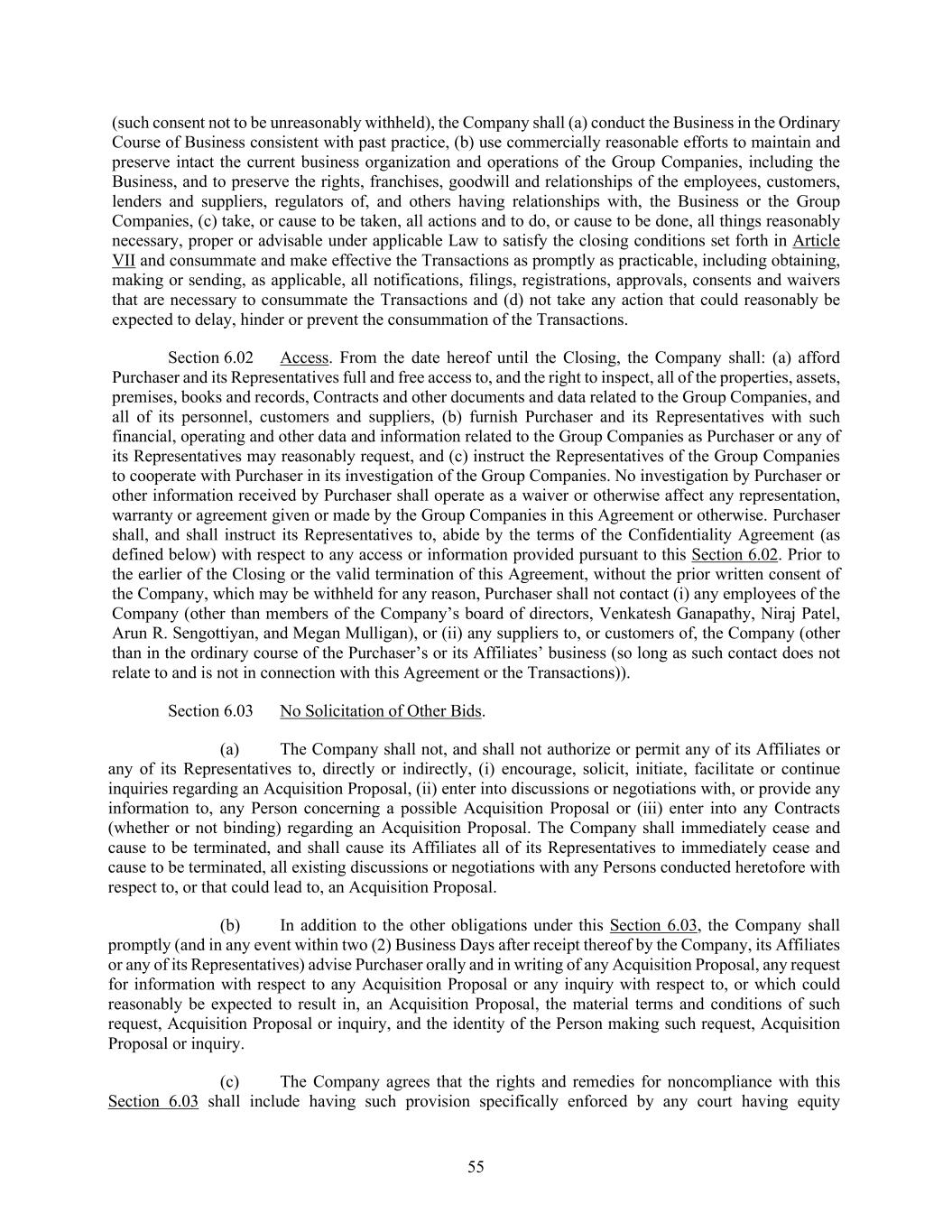 55 (such consent not to be unreasonably withheld), the Company shall (a) conduct the Business in the Ordinary Course of Business consistent with past practice, (b) use commercially reasonable efforts to maintain and preserve intact the current business organization and operations of the Group Companies, including the Business, and to preserve the rights, franchises, goodwill and relationships of the employees, customers, lenders and suppliers, regulators of, and others having relationships with, the Business or the Group Companies, (c) take, or cause to be taken, all actions and to do, or cause to be done, all things reasonably necessary, proper or advisable under applicable Law to satisfy the closing conditions set forth in Article VII and consummate and make effective the Transactions as promptly as practicable, including obtaining, making or sending, as applicable, all notifications, filings, registrations, approvals, consents and waivers that are necessary to consummate the Transactions and (d) not take any action that could reasonably be expected to delay, hinder or prevent the consummation of the Transactions. Section 6.02 Access. From the date hereof until the Closing, the Company shall: (a) afford Purchaser and its Representatives full and free access to, and the right to inspect, all of the properties, assets, premises, books and records, Contracts and other documents and data related to the Group Companies, and all of its personnel, customers and suppliers, (b) furnish Purchaser and its Representatives with such financial, operating and other data and information related to the Group Companies as Purchaser or any of its Representatives may reasonably request, and (c) instruct the Representatives of the Group Companies to cooperate with Purchaser in its investigation of the Group Companies. No investigation by Purchaser or other information received by Purchaser shall operate as a waiver or otherwise affect any representation, warranty or agreement given or made by the Group Companies in this Agreement or otherwise. Purchaser shall, and shall instruct its Representatives to, abide by the terms of the Confidentiality Agreement (as defined below) with respect to any access or information provided pursuant to this Section 6.02. Prior to the earlier of the Closing or the valid termination of this Agreement, without the prior written consent of the Company, which may be withheld for any reason, Purchaser shall not contact (i) any employees of the Company (other than members of the Company’s board of directors, Venkatesh Ganapathy, Niraj Patel, Arun R. Sengottiyan, and Megan Mulligan), or (ii) any suppliers to, or customers of, the Company (other than in the ordinary course of the Purchaser’s or its Affiliates’ business (so long as such contact does not relate to and is not in connection with this Agreement or the Transactions)). Section 6.03 No Solicitation of Other Bids. (a) The Company shall not, and shall not authorize or permit any of its Affiliates or any of its Representatives to, directly or indirectly, (i) encourage, solicit, initiate, facilitate or continue inquiries regarding an Acquisition Proposal, (ii) enter into discussions or negotiations with, or provide any information to, any Person concerning a possible Acquisition Proposal or (iii) enter into any Contracts (whether or not binding) regarding an Acquisition Proposal. The Company shall immediately cease and cause to be terminated, and shall cause its Affiliates all of its Representatives to immediately cease and cause to be terminated, all existing discussions or negotiations with any Persons conducted heretofore with respect to, or that could lead to, an Acquisition Proposal. (b) In addition to the other obligations under this Section 6.03, the Company shall promptly (and in any event within two (2) Business Days after receipt thereof by the Company, its Affiliates or any of its Representatives) advise Purchaser orally and in writing of any Acquisition Proposal, any request for information with respect to any Acquisition Proposal or any inquiry with respect to, or which could reasonably be expected to result in, an Acquisition Proposal, the material terms and conditions of such request, Acquisition Proposal or inquiry, and the identity of the Person making such request, Acquisition Proposal or inquiry. (c) The Company agrees that the rights and remedies for noncompliance with this Section 6.03 shall include having such provision specifically enforced by any court having equity