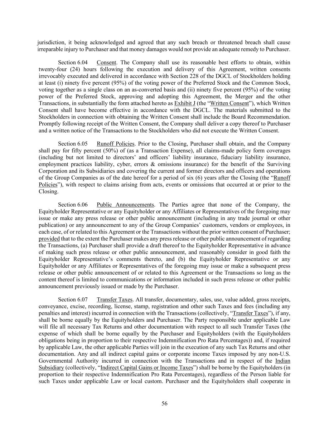 56 jurisdiction, it being acknowledged and agreed that any such breach or threatened breach shall cause irreparable injury to Purchaser and that money damages would not provide an adequate remedy to Purchaser. Section 6.04 Consent. The Company shall use its reasonable best efforts to obtain, within twenty-four (24) hours following the execution and delivery of this Agreement, written consents irrevocably executed and delivered in accordance with Section 228 of the DGCL of Stockholders holding at least (i) ninety five percent (95%) of the voting power of the Preferred Stock and the Common Stock, voting together as a single class on an as-converted basis and (ii) ninety five percent (95%) of the voting power of the Preferred Stock, approving and adopting this Agreement, the Merger and the other Transactions, in substantially the form attached hereto as Exhibit J (the “Written Consent”), which Written Consent shall have become effective in accordance with the DGCL. The materials submitted to the Stockholders in connection with obtaining the Written Consent shall include the Board Recommendation. Promptly following receipt of the Written Consent, the Company shall deliver a copy thereof to Purchaser and a written notice of the Transactions to the Stockholders who did not execute the Written Consent. Section 6.05 Runoff Policies. Prior to the Closing, Purchaser shall obtain, and the Company shall pay for fifty percent (50%) of (as a Transaction Expense), all claims-made policy form coverages (including but not limited to directors’ and officers’ liability insurance, fiduciary liability insurance, employment practices liability, cyber, errors & omissions insurance) for the benefit of the Surviving Corporation and its Subsidiaries and covering the current and former directors and officers and operations of the Group Companies as of the date hereof for a period of six (6) years after the Closing (the “Runoff Policies”), with respect to claims arising from acts, events or omissions that occurred at or prior to the Closing. Section 6.06 Public Announcements. The Parties agree that none of the Company, the Equityholder Representative or any Equityholder or any Affiliates or Representatives of the foregoing may issue or make any press release or other public announcement (including in any trade journal or other publication) or any announcement to any of the Group Companies’ customers, vendors or employees, in each case, of or related to this Agreement or the Transactions without the prior written consent of Purchaser; provided that to the extent the Purchaser makes any press release or other public announcement of regarding the Transactions, (a) Purchaser shall provide a draft thereof to the Equityholder Representative in advance of making such press release or other public announcement, and reasonably consider in good faith the Equityholder Representative’s comments thereto, and (b) the Equityholder Representative or any Equityholder or any Affiliates or Representatives of the foregoing may issue or make a subsequent press release or other public announcement of or related to this Agreement or the Transactions so long as the content thereof is limited to communications or information included in such press release or other public announcement previously issued or made by the Purchaser. Section 6.07 Transfer Taxes. All transfer, documentary, sales, use, value added, gross receipts, conveyance, excise, recording, license, stamp, registration and other such Taxes and fees (including any penalties and interest) incurred in connection with the Transactions (collectively, “Transfer Taxes”), if any, shall be borne equally by the Equityholders and Purchaser. The Party responsible under applicable Law will file all necessary Tax Returns and other documentation with respect to all such Transfer Taxes (the expense of which shall be borne equally by the Purchaser and Equityholders (with the Equityholders obligations being in proportion to their respective Indemnification Pro Rata Percentages)) and, if required by applicable Law, the other applicable Parties will join in the execution of any such Tax Returns and other documentation. Any and all indirect capital gains or corporate income Taxes imposed by any non-U.S. Governmental Authority incurred in connection with the Transactions and in respect of the Indian Subsidiary (collectively, “Indirect Capital Gains or Income Taxes”) shall be borne by the Equityholders (in proportion to their respective Indemnification Pro Rata Percentages), regardless of the Person liable for such Taxes under applicable Law or local custom. Purchaser and the Equityholders shall cooperate in
