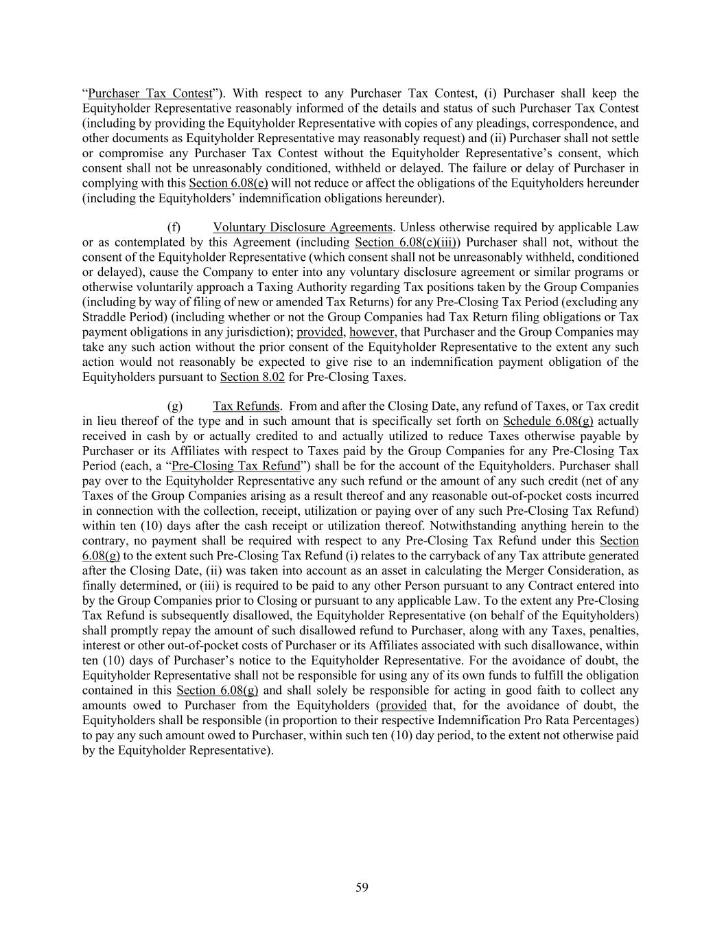 59 “Purchaser Tax Contest”). With respect to any Purchaser Tax Contest, (i) Purchaser shall keep the Equityholder Representative reasonably informed of the details and status of such Purchaser Tax Contest (including by providing the Equityholder Representative with copies of any pleadings, correspondence, and other documents as Equityholder Representative may reasonably request) and (ii) Purchaser shall not settle or compromise any Purchaser Tax Contest without the Equityholder Representative’s consent, which consent shall not be unreasonably conditioned, withheld or delayed. The failure or delay of Purchaser in complying with this Section 6.08(e) will not reduce or affect the obligations of the Equityholders hereunder (including the Equityholders’ indemnification obligations hereunder). (f) Voluntary Disclosure Agreements. Unless otherwise required by applicable Law or as contemplated by this Agreement (including Section 6.08(c)(iii)) Purchaser shall not, without the consent of the Equityholder Representative (which consent shall not be unreasonably withheld, conditioned or delayed), cause the Company to enter into any voluntary disclosure agreement or similar programs or otherwise voluntarily approach a Taxing Authority regarding Tax positions taken by the Group Companies (including by way of filing of new or amended Tax Returns) for any Pre-Closing Tax Period (excluding any Straddle Period) (including whether or not the Group Companies had Tax Return filing obligations or Tax payment obligations in any jurisdiction); provided, however, that Purchaser and the Group Companies may take any such action without the prior consent of the Equityholder Representative to the extent any such action would not reasonably be expected to give rise to an indemnification payment obligation of the Equityholders pursuant to Section 8.02 for Pre-Closing Taxes. (g) Tax Refunds. From and after the Closing Date, any refund of Taxes, or Tax credit in lieu thereof of the type and in such amount that is specifically set forth on Schedule 6.08(g) actually received in cash by or actually credited to and actually utilized to reduce Taxes otherwise payable by Purchaser or its Affiliates with respect to Taxes paid by the Group Companies for any Pre-Closing Tax Period (each, a “Pre-Closing Tax Refund”) shall be for the account of the Equityholders. Purchaser shall pay over to the Equityholder Representative any such refund or the amount of any such credit (net of any Taxes of the Group Companies arising as a result thereof and any reasonable out-of-pocket costs incurred in connection with the collection, receipt, utilization or paying over of any such Pre-Closing Tax Refund) within ten (10) days after the cash receipt or utilization thereof. Notwithstanding anything herein to the contrary, no payment shall be required with respect to any Pre-Closing Tax Refund under this Section 6.08(g) to the extent such Pre-Closing Tax Refund (i) relates to the carryback of any Tax attribute generated after the Closing Date, (ii) was taken into account as an asset in calculating the Merger Consideration, as finally determined, or (iii) is required to be paid to any other Person pursuant to any Contract entered into by the Group Companies prior to Closing or pursuant to any applicable Law. To the extent any Pre-Closing Tax Refund is subsequently disallowed, the Equityholder Representative (on behalf of the Equityholders) shall promptly repay the amount of such disallowed refund to Purchaser, along with any Taxes, penalties, interest or other out-of-pocket costs of Purchaser or its Affiliates associated with such disallowance, within ten (10) days of Purchaser’s notice to the Equityholder Representative. For the avoidance of doubt, the Equityholder Representative shall not be responsible for using any of its own funds to fulfill the obligation contained in this Section 6.08(g) and shall solely be responsible for acting in good faith to collect any amounts owed to Purchaser from the Equityholders (provided that, for the avoidance of doubt, the Equityholders shall be responsible (in proportion to their respective Indemnification Pro Rata Percentages) to pay any such amount owed to Purchaser, within such ten (10) day period, to the extent not otherwise paid by the Equityholder Representative).
