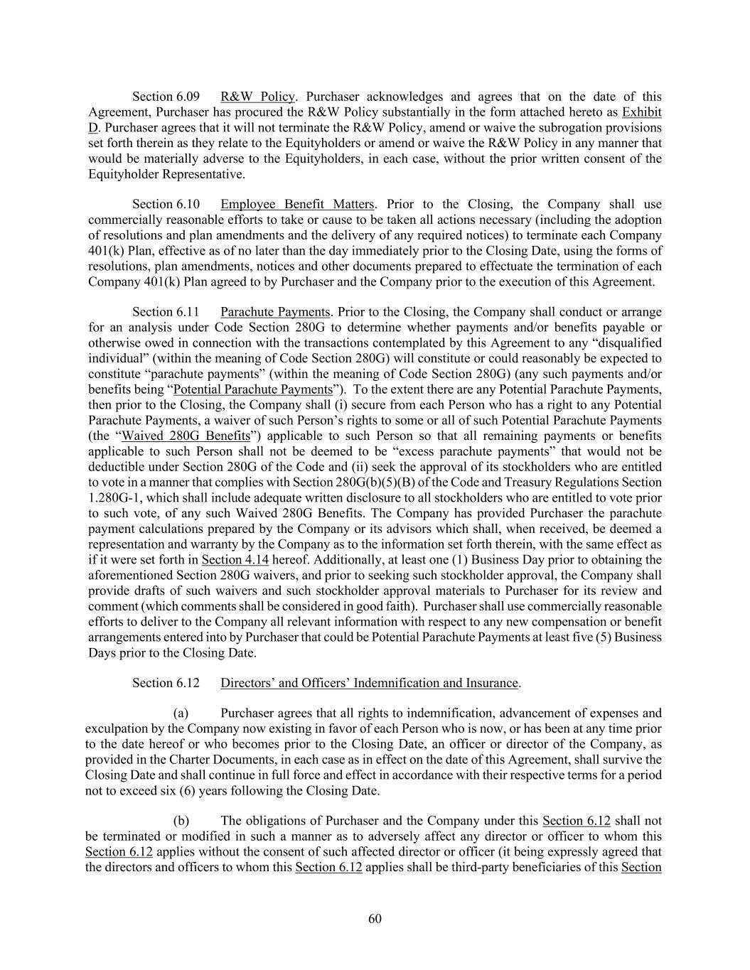 60 Section 6.09 R&W Policy. Purchaser acknowledges and agrees that on the date of this Agreement, Purchaser has procured the R&W Policy substantially in the form attached hereto as Exhibit D. Purchaser agrees that it will not terminate the R&W Policy, amend or waive the subrogation provisions set forth therein as they relate to the Equityholders or amend or waive the R&W Policy in any manner that would be materially adverse to the Equityholders, in each case, without the prior written consent of the Equityholder Representative. Section 6.10 Employee Benefit Matters. Prior to the Closing, the Company shall use commercially reasonable efforts to take or cause to be taken all actions necessary (including the adoption of resolutions and plan amendments and the delivery of any required notices) to terminate each Company 401(k) Plan, effective as of no later than the day immediately prior to the Closing Date, using the forms of resolutions, plan amendments, notices and other documents prepared to effectuate the termination of each Company 401(k) Plan agreed to by Purchaser and the Company prior to the execution of this Agreement. Section 6.11 Parachute Payments. Prior to the Closing, the Company shall conduct or arrange for an analysis under Code Section 280G to determine whether payments and/or benefits payable or otherwise owed in connection with the transactions contemplated by this Agreement to any “disqualified individual” (within the meaning of Code Section 280G) will constitute or could reasonably be expected to constitute “parachute payments” (within the meaning of Code Section 280G) (any such payments and/or benefits being “Potential Parachute Payments”). To the extent there are any Potential Parachute Payments, then prior to the Closing, the Company shall (i) secure from each Person who has a right to any Potential Parachute Payments, a waiver of such Person’s rights to some or all of such Potential Parachute Payments (the “Waived 280G Benefits”) applicable to such Person so that all remaining payments or benefits applicable to such Person shall not be deemed to be “excess parachute payments” that would not be deductible under Section 280G of the Code and (ii) seek the approval of its stockholders who are entitled to vote in a manner that complies with Section 280G(b)(5)(B) of the Code and Treasury Regulations Section 1.280G-1, which shall include adequate written disclosure to all stockholders who are entitled to vote prior to such vote, of any such Waived 280G Benefits. The Company has provided Purchaser the parachute payment calculations prepared by the Company or its advisors which shall, when received, be deemed a representation and warranty by the Company as to the information set forth therein, with the same effect as if it were set forth in Section 4.14 hereof. Additionally, at least one (1) Business Day prior to obtaining the aforementioned Section 280G waivers, and prior to seeking such stockholder approval, the Company shall provide drafts of such waivers and such stockholder approval materials to Purchaser for its review and comment (which comments shall be considered in good faith). Purchaser shall use commercially reasonable efforts to deliver to the Company all relevant information with respect to any new compensation or benefit arrangements entered into by Purchaser that could be Potential Parachute Payments at least five (5) Business Days prior to the Closing Date. Section 6.12 Directors’ and Officers’ Indemnification and Insurance. (a) Purchaser agrees that all rights to indemnification, advancement of expenses and exculpation by the Company now existing in favor of each Person who is now, or has been at any time prior to the date hereof or who becomes prior to the Closing Date, an officer or director of the Company, as provided in the Charter Documents, in each case as in effect on the date of this Agreement, shall survive the Closing Date and shall continue in full force and effect in accordance with their respective terms for a period not to exceed six (6) years following the Closing Date. (b) The obligations of Purchaser and the Company under this Section 6.12 shall not be terminated or modified in such a manner as to adversely affect any director or officer to whom this Section 6.12 applies without the consent of such affected director or officer (it being expressly agreed that the directors and officers to whom this Section 6.12 applies shall be third-party beneficiaries of this Section