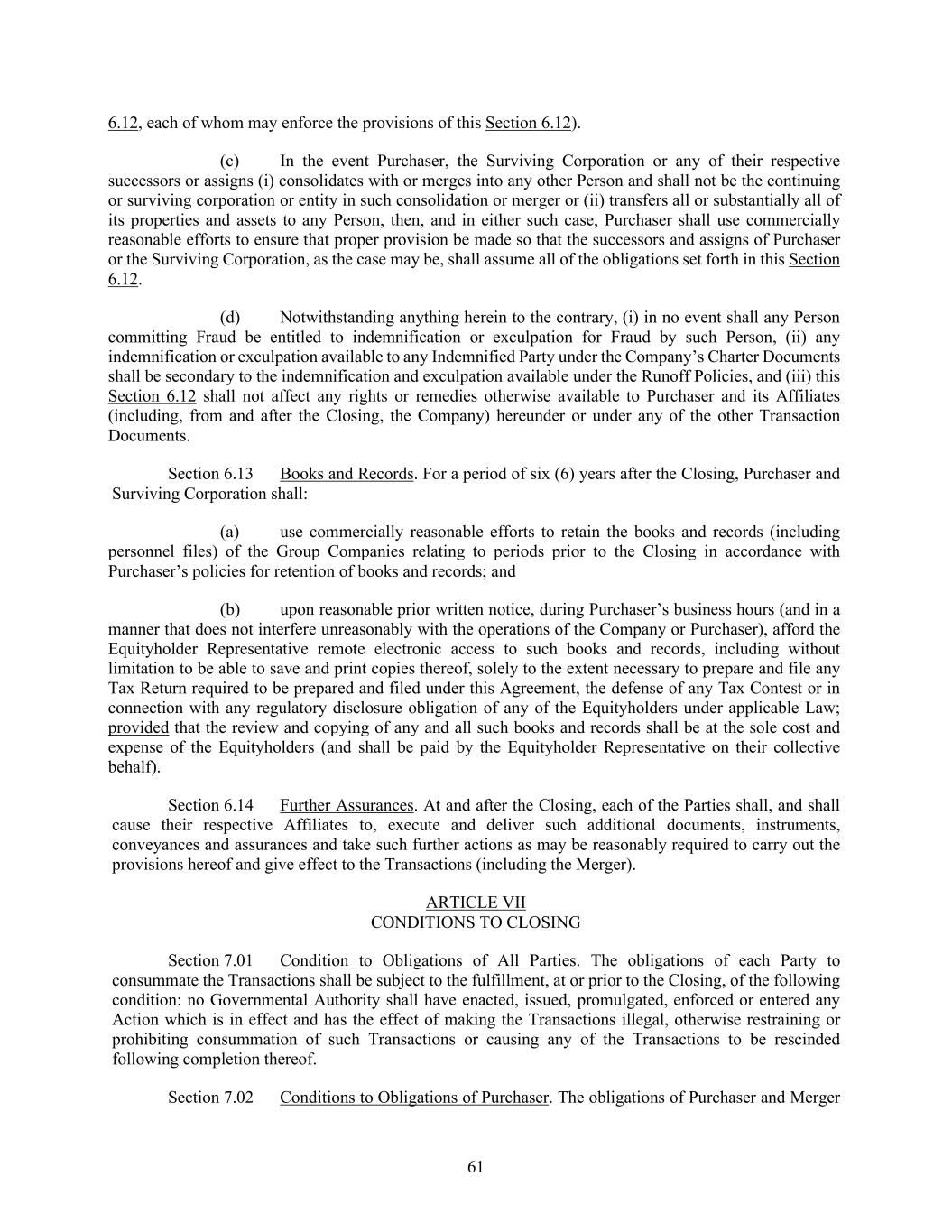 61 6.12, each of whom may enforce the provisions of this Section 6.12). (c) In the event Purchaser, the Surviving Corporation or any of their respective successors or assigns (i) consolidates with or merges into any other Person and shall not be the continuing or surviving corporation or entity in such consolidation or merger or (ii) transfers all or substantially all of its properties and assets to any Person, then, and in either such case, Purchaser shall use commercially reasonable efforts to ensure that proper provision be made so that the successors and assigns of Purchaser or the Surviving Corporation, as the case may be, shall assume all of the obligations set forth in this Section 6.12. (d) Notwithstanding anything herein to the contrary, (i) in no event shall any Person committing Fraud be entitled to indemnification or exculpation for Fraud by such Person, (ii) any indemnification or exculpation available to any Indemnified Party under the Company’s Charter Documents shall be secondary to the indemnification and exculpation available under the Runoff Policies, and (iii) this Section 6.12 shall not affect any rights or remedies otherwise available to Purchaser and its Affiliates (including, from and after the Closing, the Company) hereunder or under any of the other Transaction Documents. Section 6.13 Books and Records. For a period of six (6) years after the Closing, Purchaser and Surviving Corporation shall: (a) use commercially reasonable efforts to retain the books and records (including personnel files) of the Group Companies relating to periods prior to the Closing in accordance with Purchaser’s policies for retention of books and records; and (b) upon reasonable prior written notice, during Purchaser’s business hours (and in a manner that does not interfere unreasonably with the operations of the Company or Purchaser), afford the Equityholder Representative remote electronic access to such books and records, including without limitation to be able to save and print copies thereof, solely to the extent necessary to prepare and file any Tax Return required to be prepared and filed under this Agreement, the defense of any Tax Contest or in connection with any regulatory disclosure obligation of any of the Equityholders under applicable Law; provided that the review and copying of any and all such books and records shall be at the sole cost and expense of the Equityholders (and shall be paid by the Equityholder Representative on their collective behalf). Section 6.14 Further Assurances. At and after the Closing, each of the Parties shall, and shall cause their respective Affiliates to, execute and deliver such additional documents, instruments, conveyances and assurances and take such further actions as may be reasonably required to carry out the provisions hereof and give effect to the Transactions (including the Merger). ARTICLE VII CONDITIONS TO CLOSING Section 7.01 Condition to Obligations of All Parties. The obligations of each Party to consummate the Transactions shall be subject to the fulfillment, at or prior to the Closing, of the following condition: no Governmental Authority shall have enacted, issued, promulgated, enforced or entered any Action which is in effect and has the effect of making the Transactions illegal, otherwise restraining or prohibiting consummation of such Transactions or causing any of the Transactions to be rescinded following completion thereof. Section 7.02 Conditions to Obligations of Purchaser. The obligations of Purchaser and Merger