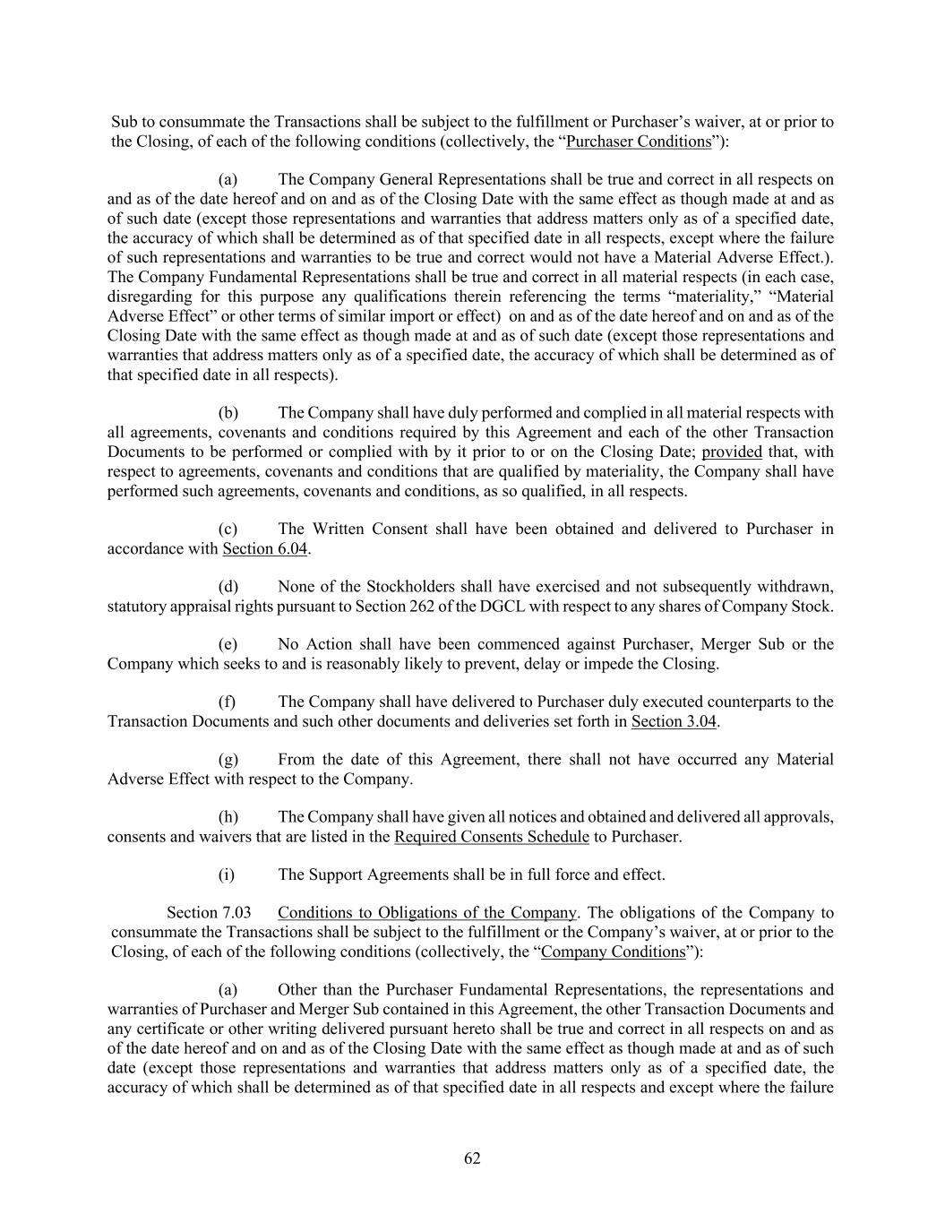62 Sub to consummate the Transactions shall be subject to the fulfillment or Purchaser’s waiver, at or prior to the Closing, of each of the following conditions (collectively, the “Purchaser Conditions”): (a) The Company General Representations shall be true and correct in all respects on and as of the date hereof and on and as of the Closing Date with the same effect as though made at and as of such date (except those representations and warranties that address matters only as of a specified date, the accuracy of which shall be determined as of that specified date in all respects, except where the failure of such representations and warranties to be true and correct would not have a Material Adverse Effect.). The Company Fundamental Representations shall be true and correct in all material respects (in each case, disregarding for this purpose any qualifications therein referencing the terms “materiality,” “Material Adverse Effect” or other terms of similar import or effect) on and as of the date hereof and on and as of the Closing Date with the same effect as though made at and as of such date (except those representations and warranties that address matters only as of a specified date, the accuracy of which shall be determined as of that specified date in all respects). (b) The Company shall have duly performed and complied in all material respects with all agreements, covenants and conditions required by this Agreement and each of the other Transaction Documents to be performed or complied with by it prior to or on the Closing Date; provided that, with respect to agreements, covenants and conditions that are qualified by materiality, the Company shall have performed such agreements, covenants and conditions, as so qualified, in all respects. (c) The Written Consent shall have been obtained and delivered to Purchaser in accordance with Section 6.04. (d) None of the Stockholders shall have exercised and not subsequently withdrawn, statutory appraisal rights pursuant to Section 262 of the DGCL with respect to any shares of Company Stock. (e) No Action shall have been commenced against Purchaser, Merger Sub or the Company which seeks to and is reasonably likely to prevent, delay or impede the Closing. (f) The Company shall have delivered to Purchaser duly executed counterparts to the Transaction Documents and such other documents and deliveries set forth in Section 3.04. (g) From the date of this Agreement, there shall not have occurred any Material Adverse Effect with respect to the Company. (h) The Company shall have given all notices and obtained and delivered all approvals, consents and waivers that are listed in the Required Consents Schedule to Purchaser. (i) The Support Agreements shall be in full force and effect. Section 7.03 Conditions to Obligations of the Company. The obligations of the Company to consummate the Transactions shall be subject to the fulfillment or the Company’s waiver, at or prior to the Closing, of each of the following conditions (collectively, the “Company Conditions”): (a) Other than the Purchaser Fundamental Representations, the representations and warranties of Purchaser and Merger Sub contained in this Agreement, the other Transaction Documents and any certificate or other writing delivered pursuant hereto shall be true and correct in all respects on and as of the date hereof and on and as of the Closing Date with the same effect as though made at and as of such date (except those representations and warranties that address matters only as of a specified date, the accuracy of which shall be determined as of that specified date in all respects and except where the failure
