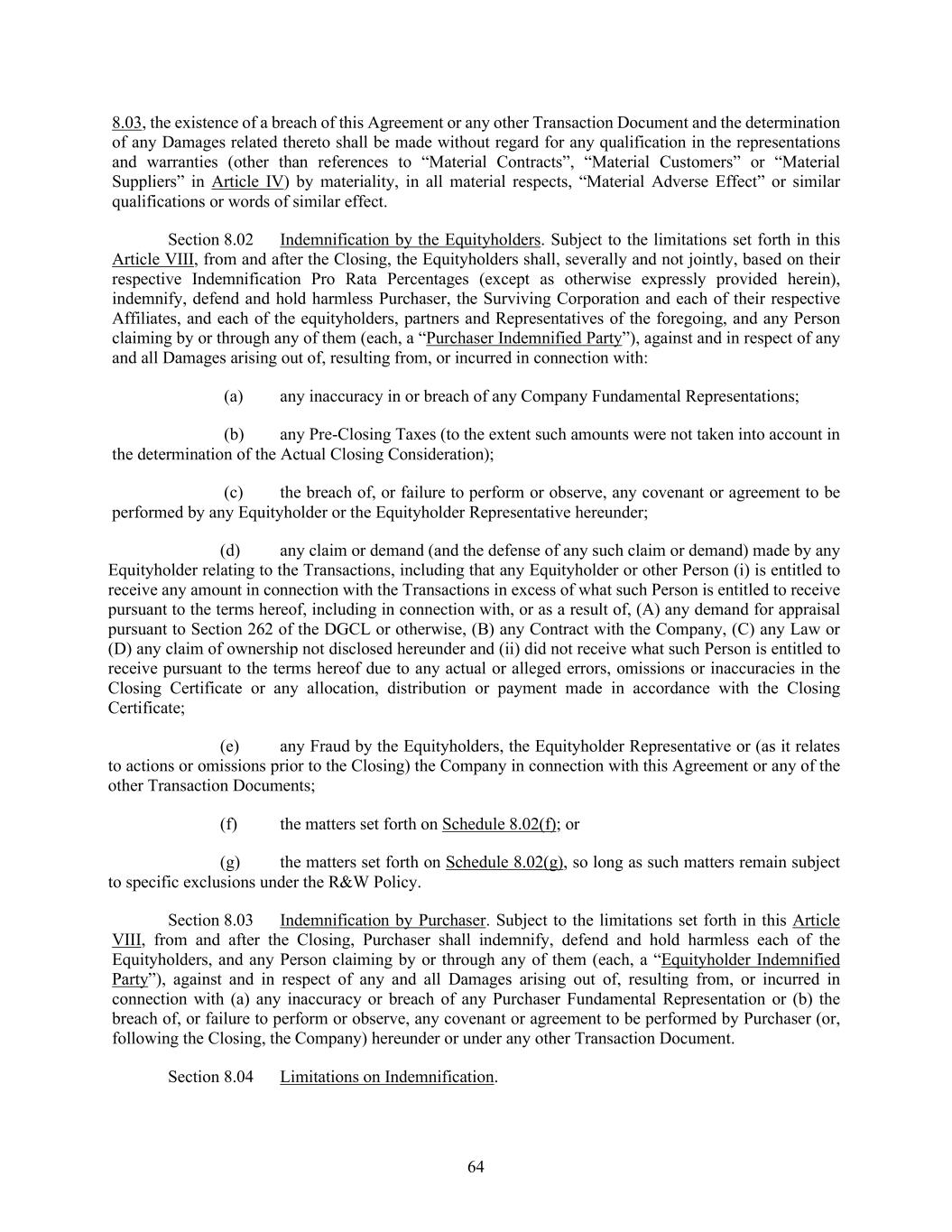 64 8.03, the existence of a breach of this Agreement or any other Transaction Document and the determination of any Damages related thereto shall be made without regard for any qualification in the representations and warranties (other than references to “Material Contracts”, “Material Customers” or “Material Suppliers” in Article IV) by materiality, in all material respects, “Material Adverse Effect” or similar qualifications or words of similar effect. Section 8.02 Indemnification by the Equityholders. Subject to the limitations set forth in this Article VIII, from and after the Closing, the Equityholders shall, severally and not jointly, based on their respective Indemnification Pro Rata Percentages (except as otherwise expressly provided herein), indemnify, defend and hold harmless Purchaser, the Surviving Corporation and each of their respective Affiliates, and each of the equityholders, partners and Representatives of the foregoing, and any Person claiming by or through any of them (each, a “Purchaser Indemnified Party”), against and in respect of any and all Damages arising out of, resulting from, or incurred in connection with: (a) any inaccuracy in or breach of any Company Fundamental Representations; (b) any Pre-Closing Taxes (to the extent such amounts were not taken into account in the determination of the Actual Closing Consideration); (c) the breach of, or failure to perform or observe, any covenant or agreement to be performed by any Equityholder or the Equityholder Representative hereunder; (d) any claim or demand (and the defense of any such claim or demand) made by any Equityholder relating to the Transactions, including that any Equityholder or other Person (i) is entitled to receive any amount in connection with the Transactions in excess of what such Person is entitled to receive pursuant to the terms hereof, including in connection with, or as a result of, (A) any demand for appraisal pursuant to Section 262 of the DGCL or otherwise, (B) any Contract with the Company, (C) any Law or (D) any claim of ownership not disclosed hereunder and (ii) did not receive what such Person is entitled to receive pursuant to the terms hereof due to any actual or alleged errors, omissions or inaccuracies in the Closing Certificate or any allocation, distribution or payment made in accordance with the Closing Certificate; (e) any Fraud by the Equityholders, the Equityholder Representative or (as it relates to actions or omissions prior to the Closing) the Company in connection with this Agreement or any of the other Transaction Documents; (f) the matters set forth on Schedule 8.02(f); or (g) the matters set forth on Schedule 8.02(g), so long as such matters remain subject to specific exclusions under the R&W Policy. Section 8.03 Indemnification by Purchaser. Subject to the limitations set forth in this Article VIII, from and after the Closing, Purchaser shall indemnify, defend and hold harmless each of the Equityholders, and any Person claiming by or through any of them (each, a “Equityholder Indemnified Party”), against and in respect of any and all Damages arising out of, resulting from, or incurred in connection with (a) any inaccuracy or breach of any Purchaser Fundamental Representation or (b) the breach of, or failure to perform or observe, any covenant or agreement to be performed by Purchaser (or, following the Closing, the Company) hereunder or under any other Transaction Document. Section 8.04 Limitations on Indemnification.