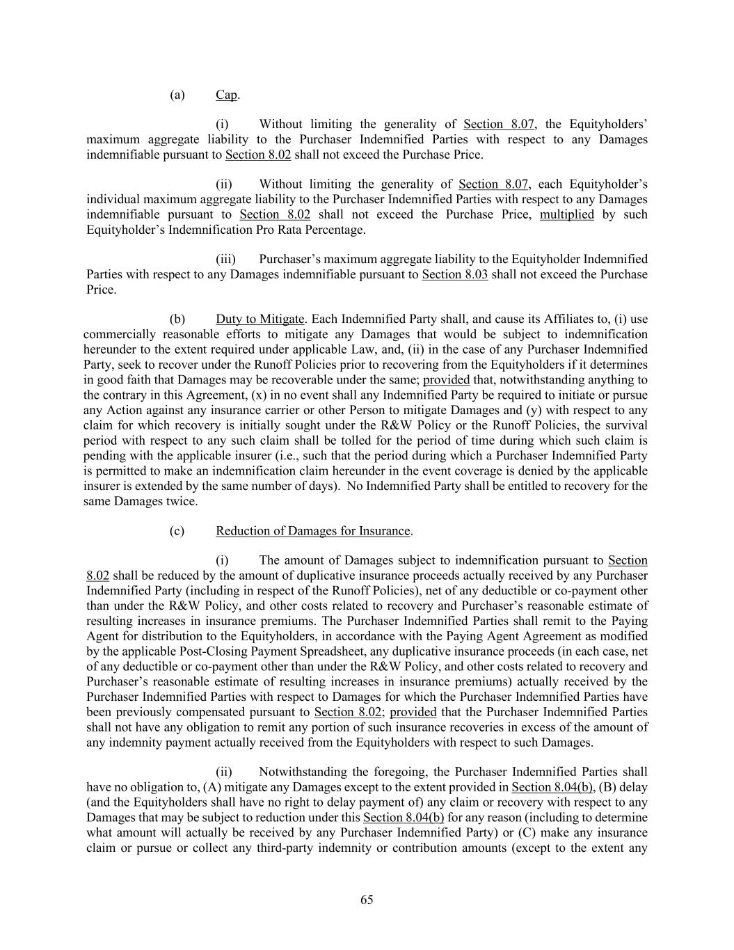65 (a) Cap. (i) Without limiting the generality of Section 8.07, the Equityholders’ maximum aggregate liability to the Purchaser Indemnified Parties with respect to any Damages indemnifiable pursuant to Section 8.02 shall not exceed the Purchase Price. (ii) Without limiting the generality of Section 8.07, each Equityholder’s individual maximum aggregate liability to the Purchaser Indemnified Parties with respect to any Damages indemnifiable pursuant to Section 8.02 shall not exceed the Purchase Price, multiplied by such Equityholder’s Indemnification Pro Rata Percentage. (iii) Purchaser’s maximum aggregate liability to the Equityholder Indemnified Parties with respect to any Damages indemnifiable pursuant to Section 8.03 shall not exceed the Purchase Price. (b) Duty to Mitigate. Each Indemnified Party shall, and cause its Affiliates to, (i) use commercially reasonable efforts to mitigate any Damages that would be subject to indemnification hereunder to the extent required under applicable Law, and, (ii) in the case of any Purchaser Indemnified Party, seek to recover under the Runoff Policies prior to recovering from the Equityholders if it determines in good faith that Damages may be recoverable under the same; provided that, notwithstanding anything to the contrary in this Agreement, (x) in no event shall any Indemnified Party be required to initiate or pursue any Action against any insurance carrier or other Person to mitigate Damages and (y) with respect to any claim for which recovery is initially sought under the R&W Policy or the Runoff Policies, the survival period with respect to any such claim shall be tolled for the period of time during which such claim is pending with the applicable insurer (i.e., such that the period during which a Purchaser Indemnified Party is permitted to make an indemnification claim hereunder in the event coverage is denied by the applicable insurer is extended by the same number of days). No Indemnified Party shall be entitled to recovery for the same Damages twice. (c) Reduction of Damages for Insurance. (i) The amount of Damages subject to indemnification pursuant to Section 8.02 shall be reduced by the amount of duplicative insurance proceeds actually received by any Purchaser Indemnified Party (including in respect of the Runoff Policies), net of any deductible or co-payment other than under the R&W Policy, and other costs related to recovery and Purchaser’s reasonable estimate of resulting increases in insurance premiums. The Purchaser Indemnified Parties shall remit to the Paying Agent for distribution to the Equityholders, in accordance with the Paying Agent Agreement as modified by the applicable Post-Closing Payment Spreadsheet, any duplicative insurance proceeds (in each case, net of any deductible or co-payment other than under the R&W Policy, and other costs related to recovery and Purchaser’s reasonable estimate of resulting increases in insurance premiums) actually received by the Purchaser Indemnified Parties with respect to Damages for which the Purchaser Indemnified Parties have been previously compensated pursuant to Section 8.02; provided that the Purchaser Indemnified Parties shall not have any obligation to remit any portion of such insurance recoveries in excess of the amount of any indemnity payment actually received from the Equityholders with respect to such Damages. (ii) Notwithstanding the foregoing, the Purchaser Indemnified Parties shall have no obligation to, (A) mitigate any Damages except to the extent provided in Section 8.04(b), (B) delay (and the Equityholders shall have no right to delay payment of) any claim or recovery with respect to any Damages that may be subject to reduction under this Section 8.04(b) for any reason (including to determine what amount will actually be received by any Purchaser Indemnified Party) or (C) make any insurance claim or pursue or collect any third-party indemnity or contribution amounts (except to the extent any
