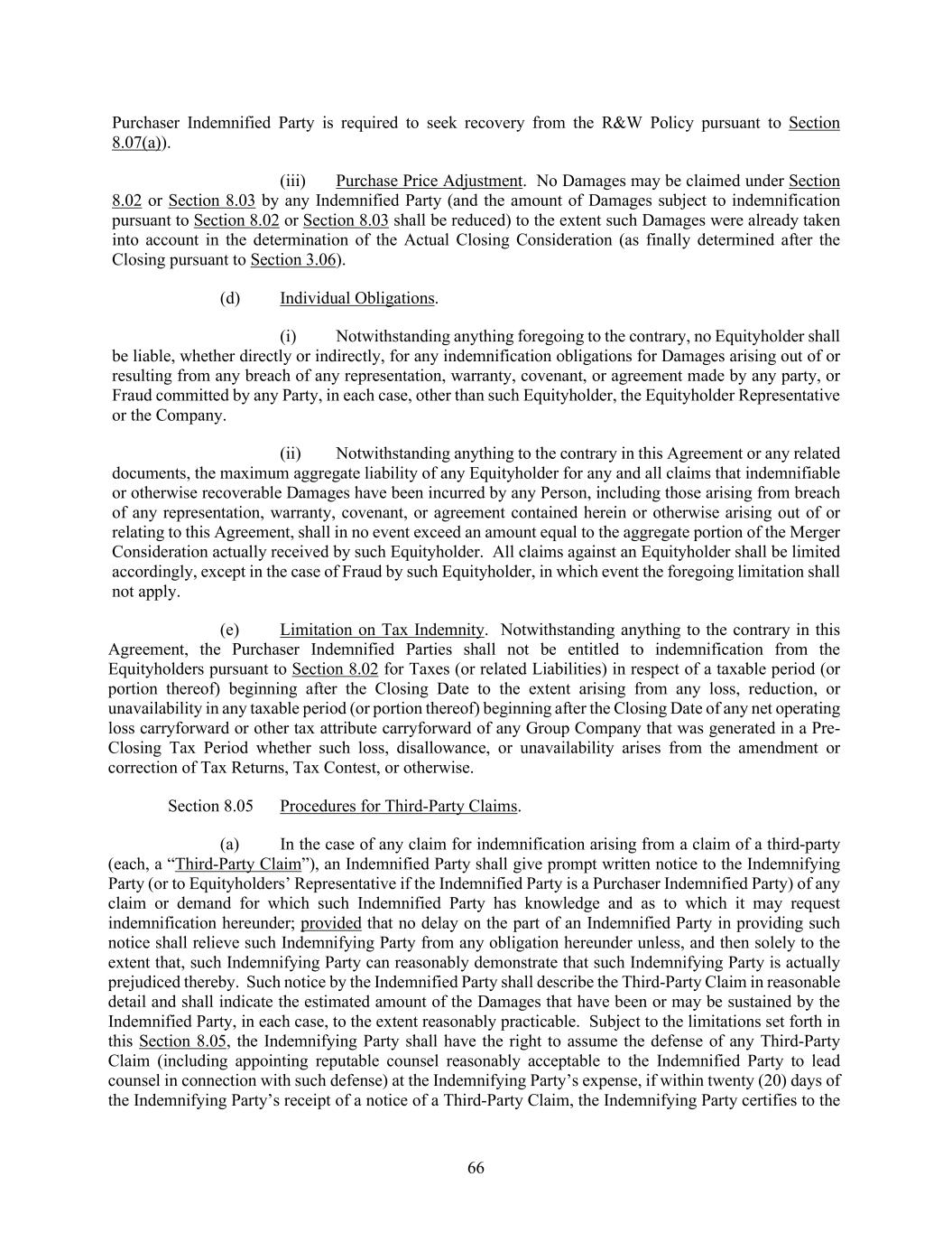 66 Purchaser Indemnified Party is required to seek recovery from the R&W Policy pursuant to Section 8.07(a)). (iii) Purchase Price Adjustment. No Damages may be claimed under Section 8.02 or Section 8.03 by any Indemnified Party (and the amount of Damages subject to indemnification pursuant to Section 8.02 or Section 8.03 shall be reduced) to the extent such Damages were already taken into account in the determination of the Actual Closing Consideration (as finally determined after the Closing pursuant to Section 3.06). (d) Individual Obligations. (i) Notwithstanding anything foregoing to the contrary, no Equityholder shall be liable, whether directly or indirectly, for any indemnification obligations for Damages arising out of or resulting from any breach of any representation, warranty, covenant, or agreement made by any party, or Fraud committed by any Party, in each case, other than such Equityholder, the Equityholder Representative or the Company. (ii) Notwithstanding anything to the contrary in this Agreement or any related documents, the maximum aggregate liability of any Equityholder for any and all claims that indemnifiable or otherwise recoverable Damages have been incurred by any Person, including those arising from breach of any representation, warranty, covenant, or agreement contained herein or otherwise arising out of or relating to this Agreement, shall in no event exceed an amount equal to the aggregate portion of the Merger Consideration actually received by such Equityholder. All claims against an Equityholder shall be limited accordingly, except in the case of Fraud by such Equityholder, in which event the foregoing limitation shall not apply. (e) Limitation on Tax Indemnity. Notwithstanding anything to the contrary in this Agreement, the Purchaser Indemnified Parties shall not be entitled to indemnification from the Equityholders pursuant to Section 8.02 for Taxes (or related Liabilities) in respect of a taxable period (or portion thereof) beginning after the Closing Date to the extent arising from any loss, reduction, or unavailability in any taxable period (or portion thereof) beginning after the Closing Date of any net operating loss carryforward or other tax attribute carryforward of any Group Company that was generated in a Pre- Closing Tax Period whether such loss, disallowance, or unavailability arises from the amendment or correction of Tax Returns, Tax Contest, or otherwise. Section 8.05 Procedures for Third-Party Claims. (a) In the case of any claim for indemnification arising from a claim of a third-party (each, a “Third-Party Claim”), an Indemnified Party shall give prompt written notice to the Indemnifying Party (or to Equityholders’ Representative if the Indemnified Party is a Purchaser Indemnified Party) of any claim or demand for which such Indemnified Party has knowledge and as to which it may request indemnification hereunder; provided that no delay on the part of an Indemnified Party in providing such notice shall relieve such Indemnifying Party from any obligation hereunder unless, and then solely to the extent that, such Indemnifying Party can reasonably demonstrate that such Indemnifying Party is actually prejudiced thereby. Such notice by the Indemnified Party shall describe the Third-Party Claim in reasonable detail and shall indicate the estimated amount of the Damages that have been or may be sustained by the Indemnified Party, in each case, to the extent reasonably practicable. Subject to the limitations set forth in this Section 8.05, the Indemnifying Party shall have the right to assume the defense of any Third-Party Claim (including appointing reputable counsel reasonably acceptable to the Indemnified Party to lead counsel in connection with such defense) at the Indemnifying Party’s expense, if within twenty (20) days of the Indemnifying Party’s receipt of a notice of a Third-Party Claim, the Indemnifying Party certifies to the