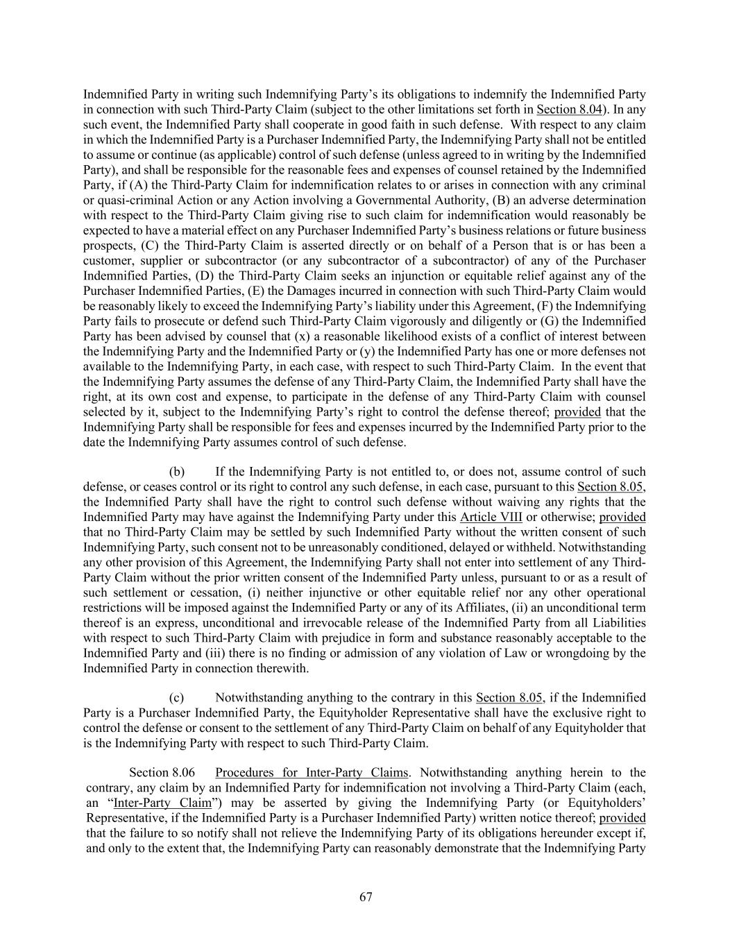 67 Indemnified Party in writing such Indemnifying Party’s its obligations to indemnify the Indemnified Party in connection with such Third-Party Claim (subject to the other limitations set forth in Section 8.04). In any such event, the Indemnified Party shall cooperate in good faith in such defense. With respect to any claim in which the Indemnified Party is a Purchaser Indemnified Party, the Indemnifying Party shall not be entitled to assume or continue (as applicable) control of such defense (unless agreed to in writing by the Indemnified Party), and shall be responsible for the reasonable fees and expenses of counsel retained by the Indemnified Party, if (A) the Third-Party Claim for indemnification relates to or arises in connection with any criminal or quasi-criminal Action or any Action involving a Governmental Authority, (B) an adverse determination with respect to the Third-Party Claim giving rise to such claim for indemnification would reasonably be expected to have a material effect on any Purchaser Indemnified Party’s business relations or future business prospects, (C) the Third-Party Claim is asserted directly or on behalf of a Person that is or has been a customer, supplier or subcontractor (or any subcontractor of a subcontractor) of any of the Purchaser Indemnified Parties, (D) the Third-Party Claim seeks an injunction or equitable relief against any of the Purchaser Indemnified Parties, (E) the Damages incurred in connection with such Third-Party Claim would be reasonably likely to exceed the Indemnifying Party’s liability under this Agreement, (F) the Indemnifying Party fails to prosecute or defend such Third-Party Claim vigorously and diligently or (G) the Indemnified Party has been advised by counsel that (x) a reasonable likelihood exists of a conflict of interest between the Indemnifying Party and the Indemnified Party or (y) the Indemnified Party has one or more defenses not available to the Indemnifying Party, in each case, with respect to such Third-Party Claim. In the event that the Indemnifying Party assumes the defense of any Third-Party Claim, the Indemnified Party shall have the right, at its own cost and expense, to participate in the defense of any Third-Party Claim with counsel selected by it, subject to the Indemnifying Party’s right to control the defense thereof; provided that the Indemnifying Party shall be responsible for fees and expenses incurred by the Indemnified Party prior to the date the Indemnifying Party assumes control of such defense. (b) If the Indemnifying Party is not entitled to, or does not, assume control of such defense, or ceases control or its right to control any such defense, in each case, pursuant to this Section 8.05, the Indemnified Party shall have the right to control such defense without waiving any rights that the Indemnified Party may have against the Indemnifying Party under this Article VIII or otherwise; provided that no Third-Party Claim may be settled by such Indemnified Party without the written consent of such Indemnifying Party, such consent not to be unreasonably conditioned, delayed or withheld. Notwithstanding any other provision of this Agreement, the Indemnifying Party shall not enter into settlement of any Third- Party Claim without the prior written consent of the Indemnified Party unless, pursuant to or as a result of such settlement or cessation, (i) neither injunctive or other equitable relief nor any other operational restrictions will be imposed against the Indemnified Party or any of its Affiliates, (ii) an unconditional term thereof is an express, unconditional and irrevocable release of the Indemnified Party from all Liabilities with respect to such Third-Party Claim with prejudice in form and substance reasonably acceptable to the Indemnified Party and (iii) there is no finding or admission of any violation of Law or wrongdoing by the Indemnified Party in connection therewith. (c) Notwithstanding anything to the contrary in this Section 8.05, if the Indemnified Party is a Purchaser Indemnified Party, the Equityholder Representative shall have the exclusive right to control the defense or consent to the settlement of any Third-Party Claim on behalf of any Equityholder that is the Indemnifying Party with respect to such Third-Party Claim. Section 8.06 Procedures for Inter-Party Claims. Notwithstanding anything herein to the contrary, any claim by an Indemnified Party for indemnification not involving a Third-Party Claim (each, an “Inter-Party Claim”) may be asserted by giving the Indemnifying Party (or Equityholders’ Representative, if the Indemnified Party is a Purchaser Indemnified Party) written notice thereof; provided that the failure to so notify shall not relieve the Indemnifying Party of its obligations hereunder except if, and only to the extent that, the Indemnifying Party can reasonably demonstrate that the Indemnifying Party