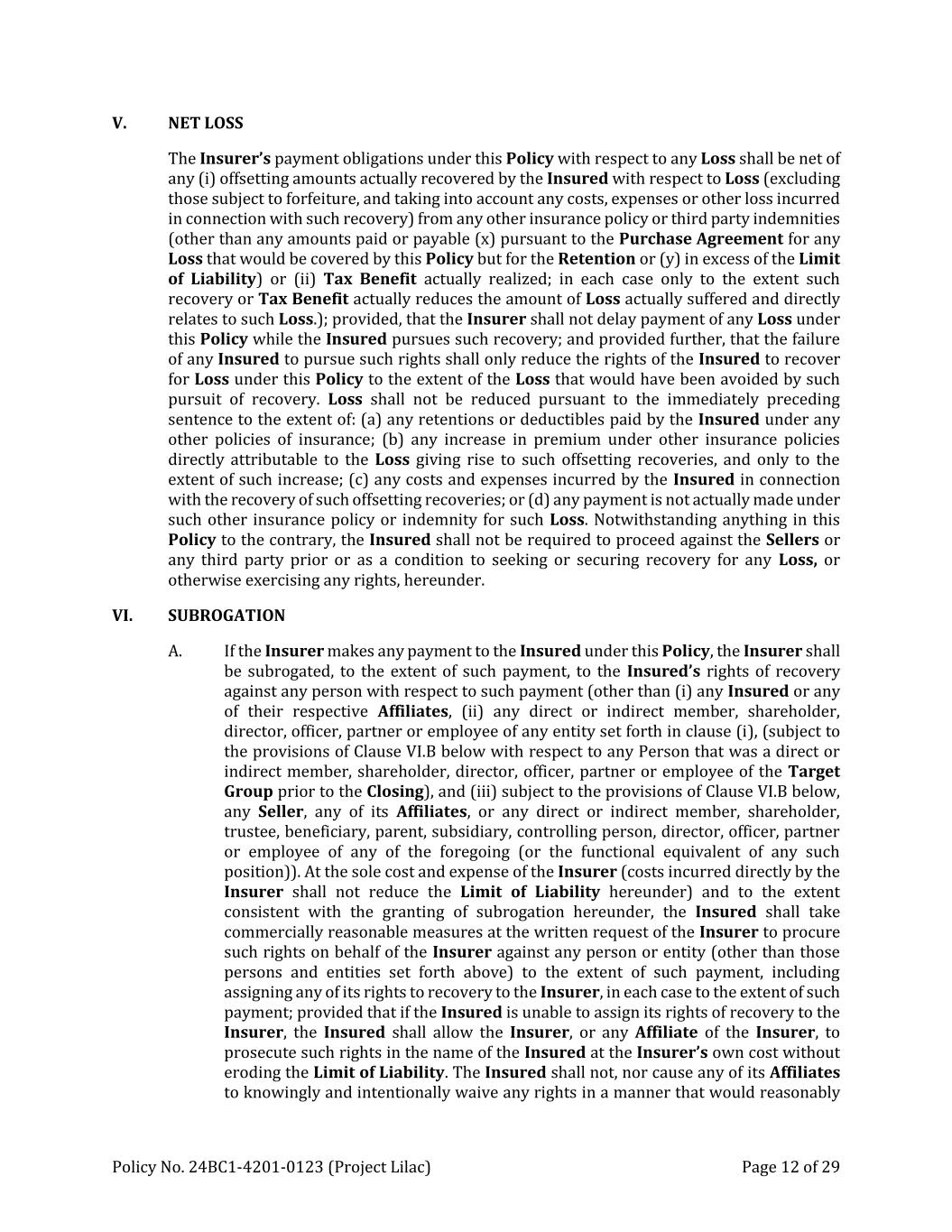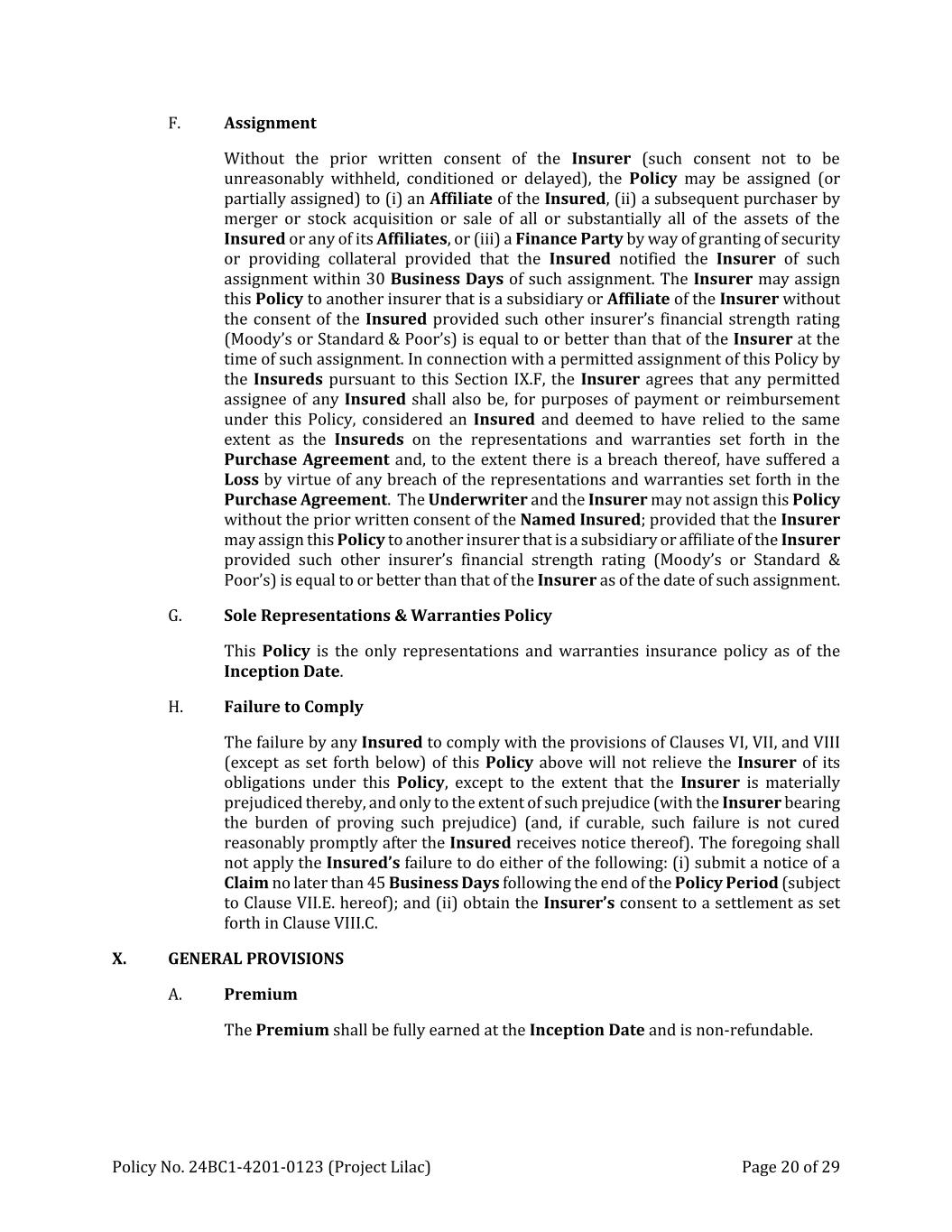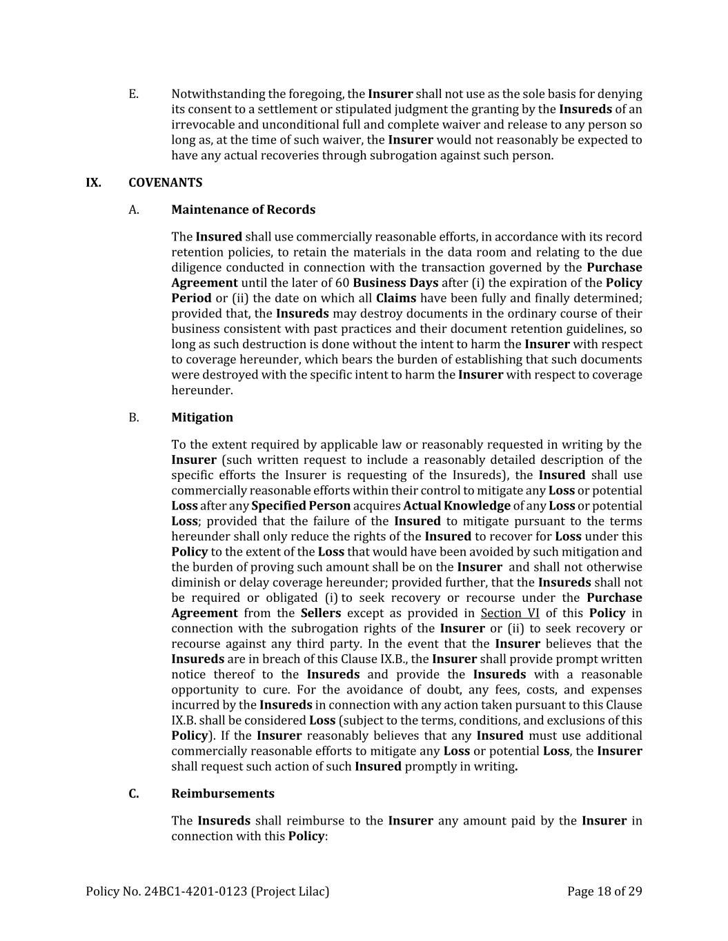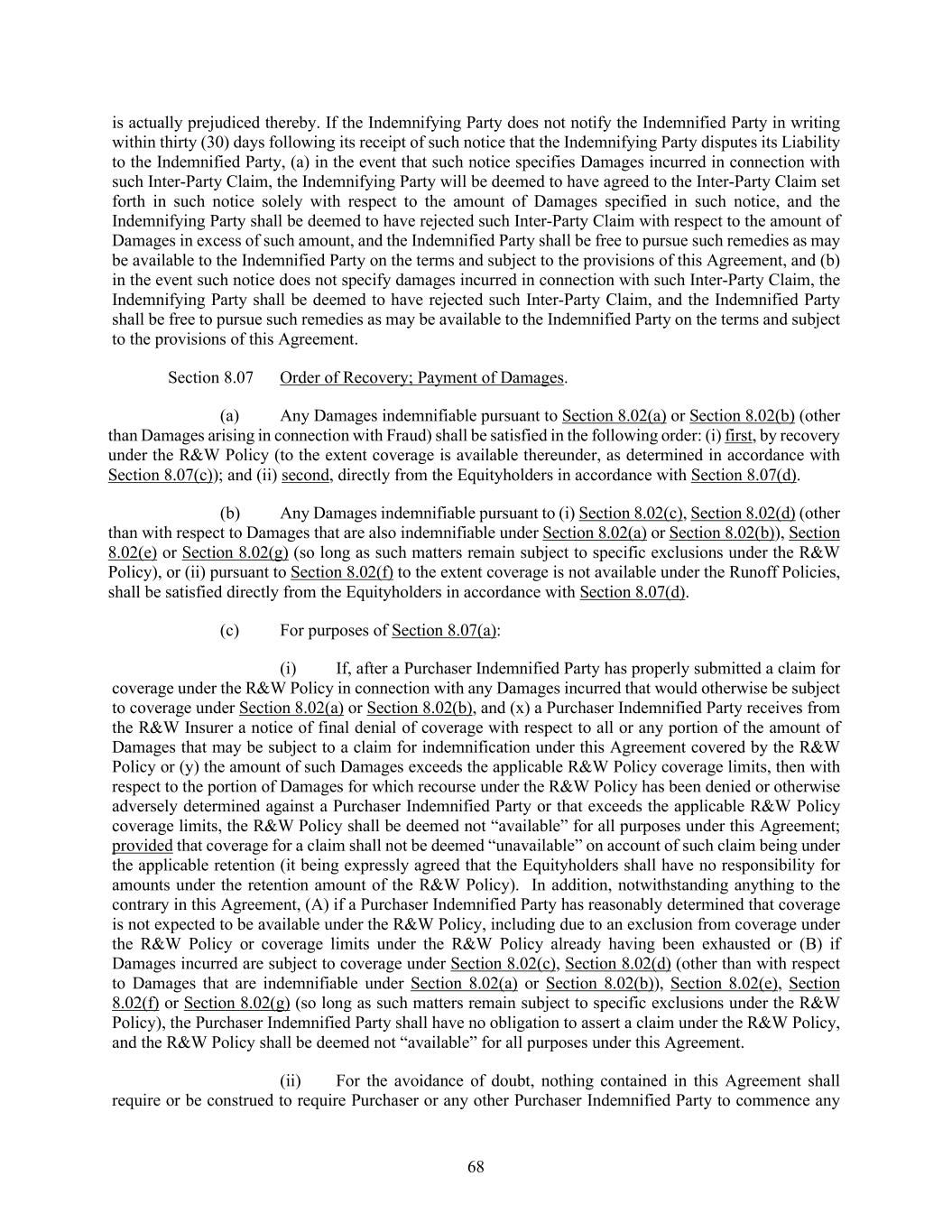 68 is actually prejudiced thereby. If the Indemnifying Party does not notify the Indemnified Party in writing within thirty (30) days following its receipt of such notice that the Indemnifying Party disputes its Liability to the Indemnified Party, (a) in the event that such notice specifies Damages incurred in connection with such Inter-Party Claim, the Indemnifying Party will be deemed to have agreed to the Inter-Party Claim set forth in such notice solely with respect to the amount of Damages specified in such notice, and the Indemnifying Party shall be deemed to have rejected such Inter-Party Claim with respect to the amount of Damages in excess of such amount, and the Indemnified Party shall be free to pursue such remedies as may be available to the Indemnified Party on the terms and subject to the provisions of this Agreement, and (b) in the event such notice does not specify damages incurred in connection with such Inter-Party Claim, the Indemnifying Party shall be deemed to have rejected such Inter-Party Claim, and the Indemnified Party shall be free to pursue such remedies as may be available to the Indemnified Party on the terms and subject to the provisions of this Agreement. Section 8.07 Order of Recovery; Payment of Damages. (a) Any Damages indemnifiable pursuant to Section 8.02(a) or Section 8.02(b) (other than Damages arising in connection with Fraud) shall be satisfied in the following order: (i) first, by recovery under the R&W Policy (to the extent coverage is available thereunder, as determined in accordance with Section 8.07(c)); and (ii) second, directly from the Equityholders in accordance with Section 8.07(d). (b) Any Damages indemnifiable pursuant to (i) Section 8.02(c), Section 8.02(d) (other than with respect to Damages that are also indemnifiable under Section 8.02(a) or Section 8.02(b)), Section 8.02(e) or Section 8.02(g) (so long as such matters remain subject to specific exclusions under the R&W Policy), or (ii) pursuant to Section 8.02(f) to the extent coverage is not available under the Runoff Policies, shall be satisfied directly from the Equityholders in accordance with Section 8.07(d). (c) For purposes of Section 8.07(a): (i) If, after a Purchaser Indemnified Party has properly submitted a claim for coverage under the R&W Policy in connection with any Damages incurred that would otherwise be subject to coverage under Section 8.02(a) or Section 8.02(b), and (x) a Purchaser Indemnified Party receives from the R&W Insurer a notice of final denial of coverage with respect to all or any portion of the amount of Damages that may be subject to a claim for indemnification under this Agreement covered by the R&W Policy or (y) the amount of such Damages exceeds the applicable R&W Policy coverage limits, then with respect to the portion of Damages for which recourse under the R&W Policy has been denied or otherwise adversely determined against a Purchaser Indemnified Party or that exceeds the applicable R&W Policy coverage limits, the R&W Policy shall be deemed not “available” for all purposes under this Agreement; provided that coverage for a claim shall not be deemed “unavailable” on account of such claim being under the applicable retention (it being expressly agreed that the Equityholders shall have no responsibility for amounts under the retention amount of the R&W Policy). In addition, notwithstanding anything to the contrary in this Agreement, (A) if a Purchaser Indemnified Party has reasonably determined that coverage is not expected to be available under the R&W Policy, including due to an exclusion from coverage under the R&W Policy or coverage limits under the R&W Policy already having been exhausted or (B) if Damages incurred are subject to coverage under Section 8.02(c), Section 8.02(d) (other than with respect to Damages that are indemnifiable under Section 8.02(a) or Section 8.02(b)), Section 8.02(e), Section 8.02(f) or Section 8.02(g) (so long as such matters remain subject to specific exclusions under the R&W Policy), the Purchaser Indemnified Party shall have no obligation to assert a claim under the R&W Policy, and the R&W Policy shall be deemed not “available” for all purposes under this Agreement. (ii) For the avoidance of doubt, nothing contained in this Agreement shall require or be construed to require Purchaser or any other Purchaser Indemnified Party to commence any