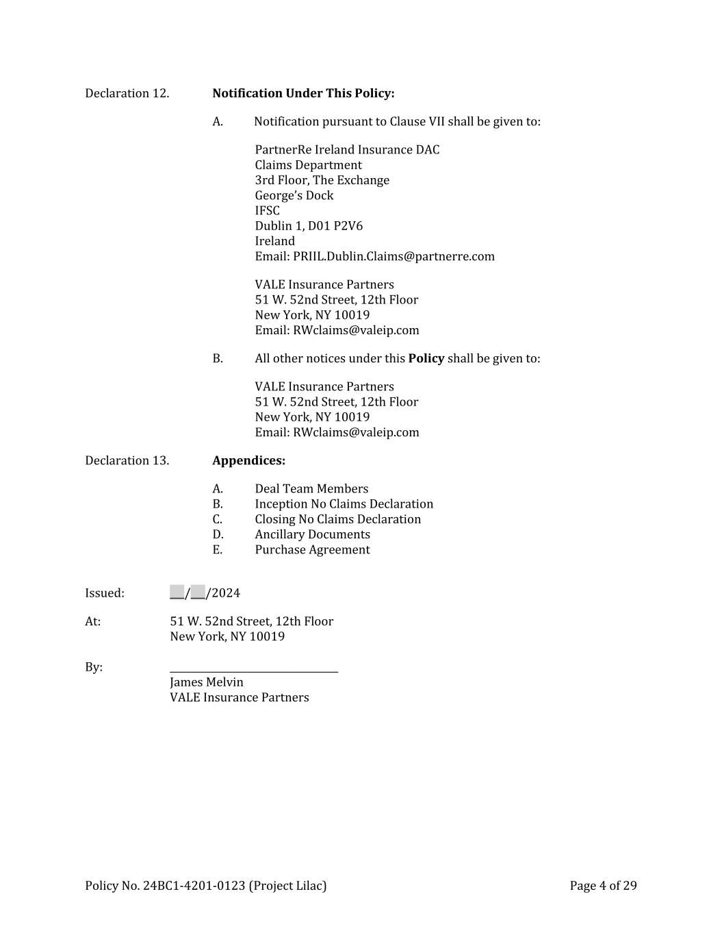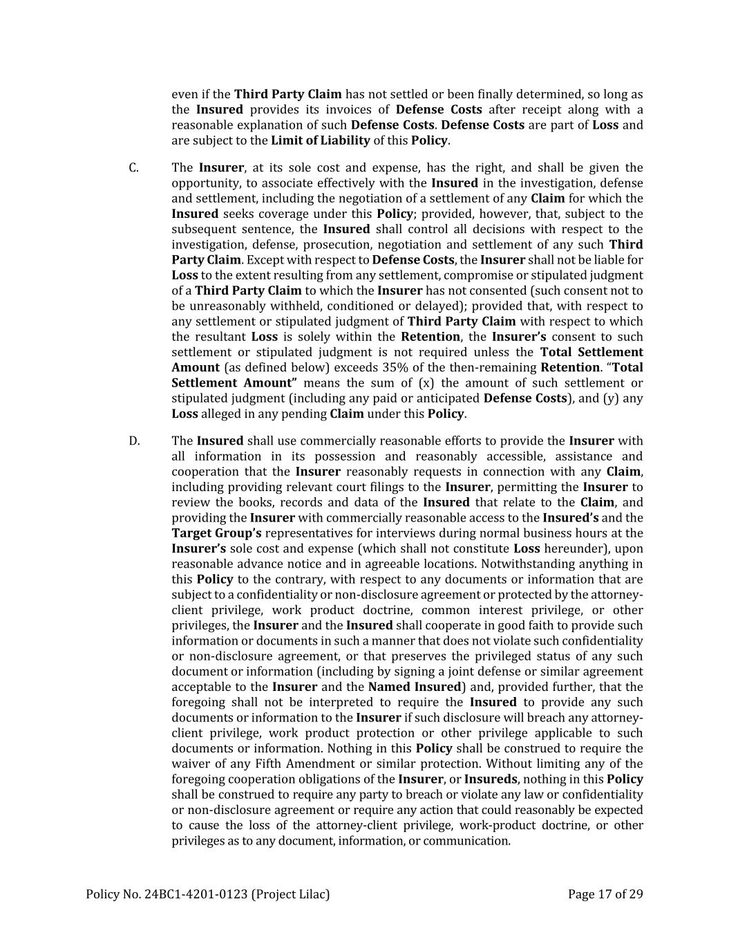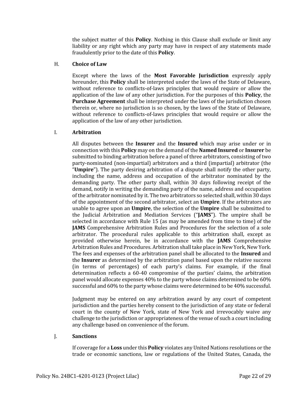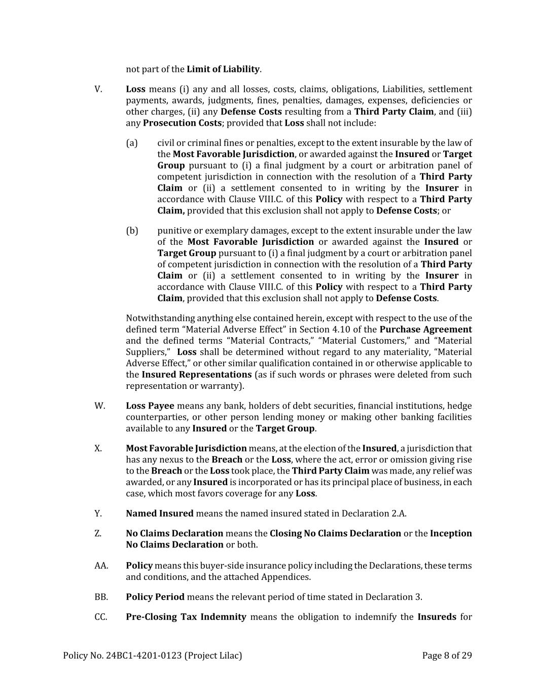 68 is actually prejudiced thereby. If the Indemnifying Party does not notify the Indemnified Party in writing within thirty (30) days following its receipt of such notice that the Indemnifying Party disputes its Liability to the Indemnified Party, (a) in the event that such notice specifies Damages incurred in connection with such Inter-Party Claim, the Indemnifying Party will be deemed to have agreed to the Inter-Party Claim set forth in such notice solely with respect to the amount of Damages specified in such notice, and the Indemnifying Party shall be deemed to have rejected such Inter-Party Claim with respect to the amount of Damages in excess of such amount, and the Indemnified Party shall be free to pursue such remedies as may be available to the Indemnified Party on the terms and subject to the provisions of this Agreement, and (b) in the event such notice does not specify damages incurred in connection with such Inter-Party Claim, the Indemnifying Party shall be deemed to have rejected such Inter-Party Claim, and the Indemnified Party shall be free to pursue such remedies as may be available to the Indemnified Party on the terms and subject to the provisions of this Agreement. Section 8.07 Order of Recovery; Payment of Damages. (a) Any Damages indemnifiable pursuant to Section 8.02(a) or Section 8.02(b) (other than Damages arising in connection with Fraud) shall be satisfied in the following order: (i) first, by recovery under the R&W Policy (to the extent coverage is available thereunder, as determined in accordance with Section 8.07(c)); and (ii) second, directly from the Equityholders in accordance with Section 8.07(d). (b) Any Damages indemnifiable pursuant to (i) Section 8.02(c), Section 8.02(d) (other than with respect to Damages that are also indemnifiable under Section 8.02(a) or Section 8.02(b)), Section 8.02(e) or Section 8.02(g) (so long as such matters remain subject to specific exclusions under the R&W Policy), or (ii) pursuant to Section 8.02(f) to the extent coverage is not available under the Runoff Policies, shall be satisfied directly from the Equityholders in accordance with Section 8.07(d). (c) For purposes of Section 8.07(a): (i) If, after a Purchaser Indemnified Party has properly submitted a claim for coverage under the R&W Policy in connection with any Damages incurred that would otherwise be subject to coverage under Section 8.02(a) or Section 8.02(b), and (x) a Purchaser Indemnified Party receives from the R&W Insurer a notice of final denial of coverage with respect to all or any portion of the amount of Damages that may be subject to a claim for indemnification under this Agreement covered by the R&W Policy or (y) the amount of such Damages exceeds the applicable R&W Policy coverage limits, then with respect to the portion of Damages for which recourse under the R&W Policy has been denied or otherwise adversely determined against a Purchaser Indemnified Party or that exceeds the applicable R&W Policy coverage limits, the R&W Policy shall be deemed not “available” for all purposes under this Agreement; provided that coverage for a claim shall not be deemed “unavailable” on account of such claim being under the applicable retention (it being expressly agreed that the Equityholders shall have no responsibility for amounts under the retention amount of the R&W Policy). In addition, notwithstanding anything to the contrary in this Agreement, (A) if a Purchaser Indemnified Party has reasonably determined that coverage is not expected to be available under the R&W Policy, including due to an exclusion from coverage under the R&W Policy or coverage limits under the R&W Policy already having been exhausted or (B) if Damages incurred are subject to coverage under Section 8.02(c), Section 8.02(d) (other than with respect to Damages that are indemnifiable under Section 8.02(a) or Section 8.02(b)), Section 8.02(e), Section 8.02(f) or Section 8.02(g) (so long as such matters remain subject to specific exclusions under the R&W Policy), the Purchaser Indemnified Party shall have no obligation to assert a claim under the R&W Policy, and the R&W Policy shall be deemed not “available” for all purposes under this Agreement. (ii) For the avoidance of doubt, nothing contained in this Agreement shall require or be construed to require Purchaser or any other Purchaser Indemnified Party to commence any