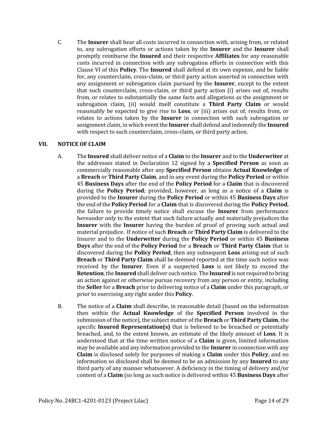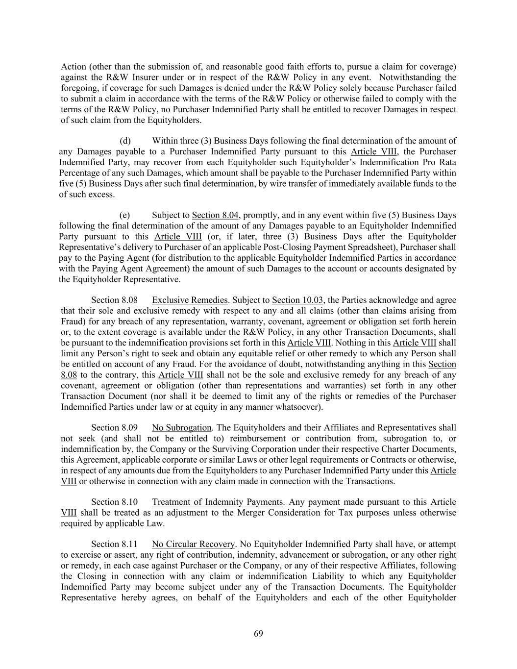 69 Action (other than the submission of, and reasonable good faith efforts to, pursue a claim for coverage) against the R&W Insurer under or in respect of the R&W Policy in any event. Notwithstanding the foregoing, if coverage for such Damages is denied under the R&W Policy solely because Purchaser failed to submit a claim in accordance with the terms of the R&W Policy or otherwise failed to comply with the terms of the R&W Policy, no Purchaser Indemnified Party shall be entitled to recover Damages in respect of such claim from the Equityholders. (d) Within three (3) Business Days following the final determination of the amount of any Damages payable to a Purchaser Indemnified Party pursuant to this Article VIII, the Purchaser Indemnified Party, may recover from each Equityholder such Equityholder’s Indemnification Pro Rata Percentage of any such Damages, which amount shall be payable to the Purchaser Indemnified Party within five (5) Business Days after such final determination, by wire transfer of immediately available funds to the of such excess. (e) Subject to Section 8.04, promptly, and in any event within five (5) Business Days following the final determination of the amount of any Damages payable to an Equityholder Indemnified Party pursuant to this Article VIII (or, if later, three (3) Business Days after the Equityholder Representative’s delivery to Purchaser of an applicable Post-Closing Payment Spreadsheet), Purchaser shall pay to the Paying Agent (for distribution to the applicable Equityholder Indemnified Parties in accordance with the Paying Agent Agreement) the amount of such Damages to the account or accounts designated by the Equityholder Representative. Section 8.08 Exclusive Remedies. Subject to Section 10.03, the Parties acknowledge and agree that their sole and exclusive remedy with respect to any and all claims (other than claims arising from Fraud) for any breach of any representation, warranty, covenant, agreement or obligation set forth herein or, to the extent coverage is available under the R&W Policy, in any other Transaction Documents, shall be pursuant to the indemnification provisions set forth in this Article VIII. Nothing in this Article VIII shall limit any Person’s right to seek and obtain any equitable relief or other remedy to which any Person shall be entitled on account of any Fraud. For the avoidance of doubt, notwithstanding anything in this Section 8.08 to the contrary, this Article VIII shall not be the sole and exclusive remedy for any breach of any covenant, agreement or obligation (other than representations and warranties) set forth in any other Transaction Document (nor shall it be deemed to limit any of the rights or remedies of the Purchaser Indemnified Parties under law or at equity in any manner whatsoever). Section 8.09 No Subrogation. The Equityholders and their Affiliates and Representatives shall not seek (and shall not be entitled to) reimbursement or contribution from, subrogation to, or indemnification by, the Company or the Surviving Corporation under their respective Charter Documents, this Agreement, applicable corporate or similar Laws or other legal requirements or Contracts or otherwise, in respect of any amounts due from the Equityholders to any Purchaser Indemnified Party under this Article VIII or otherwise in connection with any claim made in connection with the Transactions. Section 8.10 Treatment of Indemnity Payments. Any payment made pursuant to this Article VIII shall be treated as an adjustment to the Merger Consideration for Tax purposes unless otherwise required by applicable Law. Section 8.11 No Circular Recovery. No Equityholder Indemnified Party shall have, or attempt to exercise or assert, any right of contribution, indemnity, advancement or subrogation, or any other right or remedy, in each case against Purchaser or the Company, or any of their respective Affiliates, following the Closing in connection with any claim or indemnification Liability to which any Equityholder Indemnified Party may become subject under any of the Transaction Documents. The Equityholder Representative hereby agrees, on behalf of the Equityholders and each of the other Equityholder
