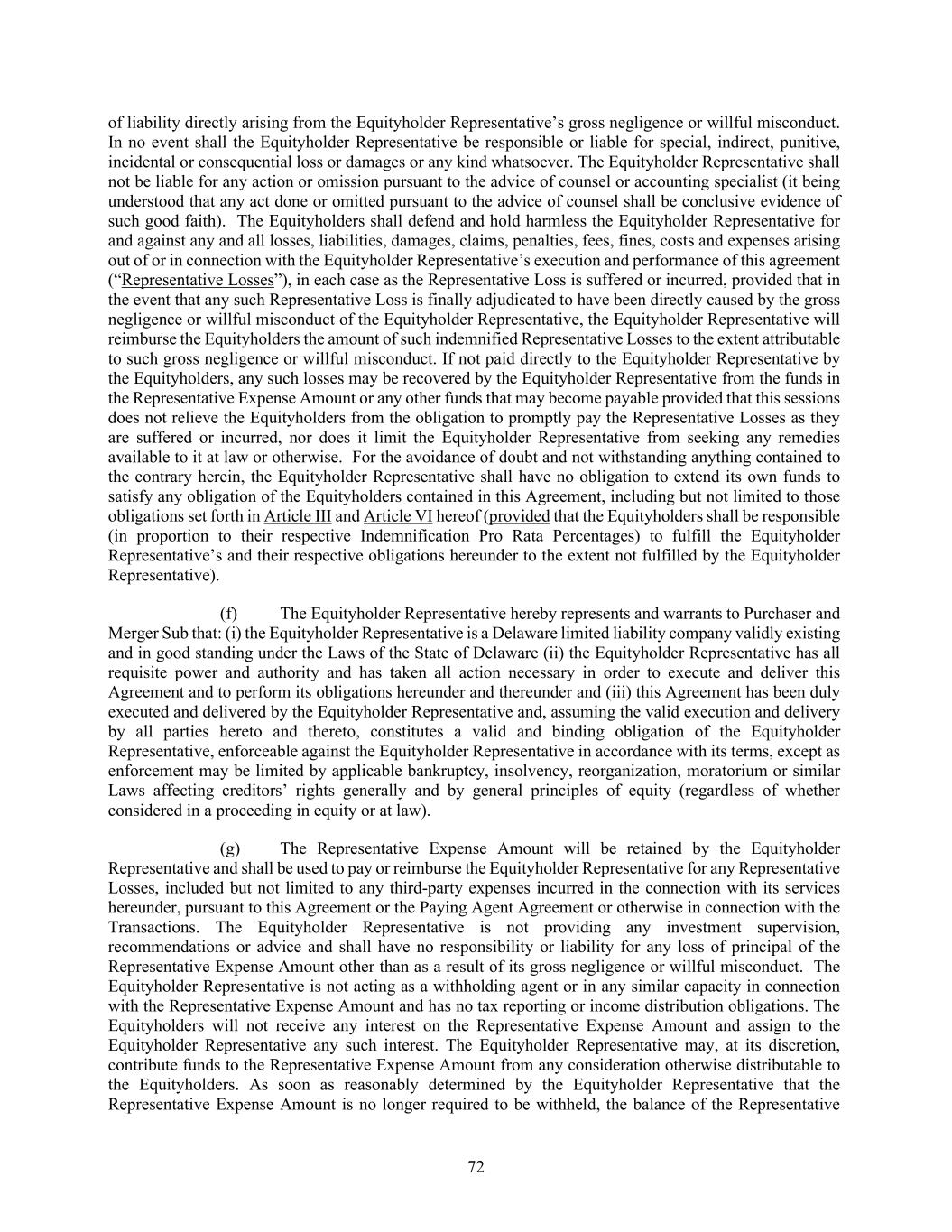 72 of liability directly arising from the Equityholder Representative’s gross negligence or willful misconduct. In no event shall the Equityholder Representative be responsible or liable for special, indirect, punitive, incidental or consequential loss or damages or any kind whatsoever. The Equityholder Representative shall not be liable for any action or omission pursuant to the advice of counsel or accounting specialist (it being understood that any act done or omitted pursuant to the advice of counsel shall be conclusive evidence of such good faith). The Equityholders shall defend and hold harmless the Equityholder Representative for and against any and all losses, liabilities, damages, claims, penalties, fees, fines, costs and expenses arising out of or in connection with the Equityholder Representative’s execution and performance of this agreement (“Representative Losses”), in each case as the Representative Loss is suffered or incurred, provided that in the event that any such Representative Loss is finally adjudicated to have been directly caused by the gross negligence or willful misconduct of the Equityholder Representative, the Equityholder Representative will reimburse the Equityholders the amount of such indemnified Representative Losses to the extent attributable to such gross negligence or willful misconduct. If not paid directly to the Equityholder Representative by the Equityholders, any such losses may be recovered by the Equityholder Representative from the funds in the Representative Expense Amount or any other funds that may become payable provided that this sessions does not relieve the Equityholders from the obligation to promptly pay the Representative Losses as they are suffered or incurred, nor does it limit the Equityholder Representative from seeking any remedies available to it at law or otherwise. For the avoidance of doubt and not withstanding anything contained to the contrary herein, the Equityholder Representative shall have no obligation to extend its own funds to satisfy any obligation of the Equityholders contained in this Agreement, including but not limited to those obligations set forth in Article III and Article VI hereof (provided that the Equityholders shall be responsible (in proportion to their respective Indemnification Pro Rata Percentages) to fulfill the Equityholder Representative’s and their respective obligations hereunder to the extent not fulfilled by the Equityholder Representative). (f) The Equityholder Representative hereby represents and warrants to Purchaser and Merger Sub that: (i) the Equityholder Representative is a Delaware limited liability company validly existing and in good standing under the Laws of the State of Delaware (ii) the Equityholder Representative has all requisite power and authority and has taken all action necessary in order to execute and deliver this Agreement and to perform its obligations hereunder and thereunder and (iii) this Agreement has been duly executed and delivered by the Equityholder Representative and, assuming the valid execution and delivery by all parties hereto and thereto, constitutes a valid and binding obligation of the Equityholder Representative, enforceable against the Equityholder Representative in accordance with its terms, except as enforcement may be limited by applicable bankruptcy, insolvency, reorganization, moratorium or similar Laws affecting creditors’ rights generally and by general principles of equity (regardless of whether considered in a proceeding in equity or at law). (g) The Representative Expense Amount will be retained by the Equityholder Representative and shall be used to pay or reimburse the Equityholder Representative for any Representative Losses, included but not limited to any third-party expenses incurred in the connection with its services hereunder, pursuant to this Agreement or the Paying Agent Agreement or otherwise in connection with the Transactions. The Equityholder Representative is not providing any investment supervision, recommendations or advice and shall have no responsibility or liability for any loss of principal of the Representative Expense Amount other than as a result of its gross negligence or willful misconduct. The Equityholder Representative is not acting as a withholding agent or in any similar capacity in connection with the Representative Expense Amount and has no tax reporting or income distribution obligations. The Equityholders will not receive any interest on the Representative Expense Amount and assign to the Equityholder Representative any such interest. The Equityholder Representative may, at its discretion, contribute funds to the Representative Expense Amount from any consideration otherwise distributable to the Equityholders. As soon as reasonably determined by the Equityholder Representative that the Representative Expense Amount is no longer required to be withheld, the balance of the Representative