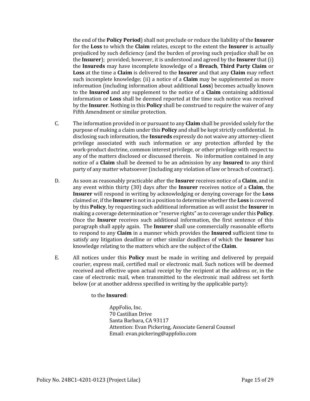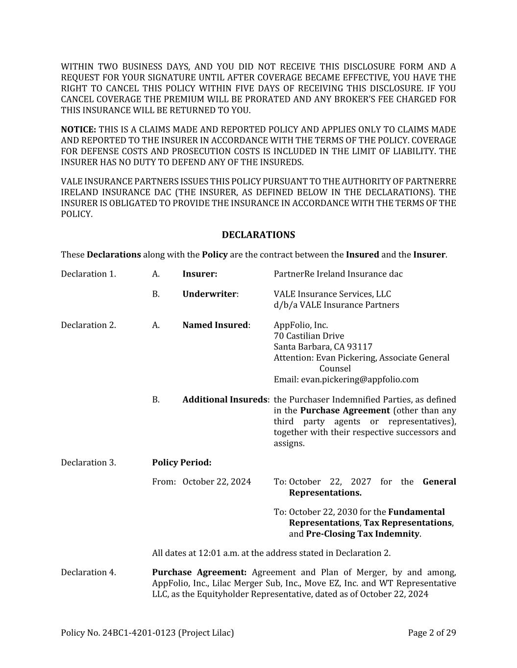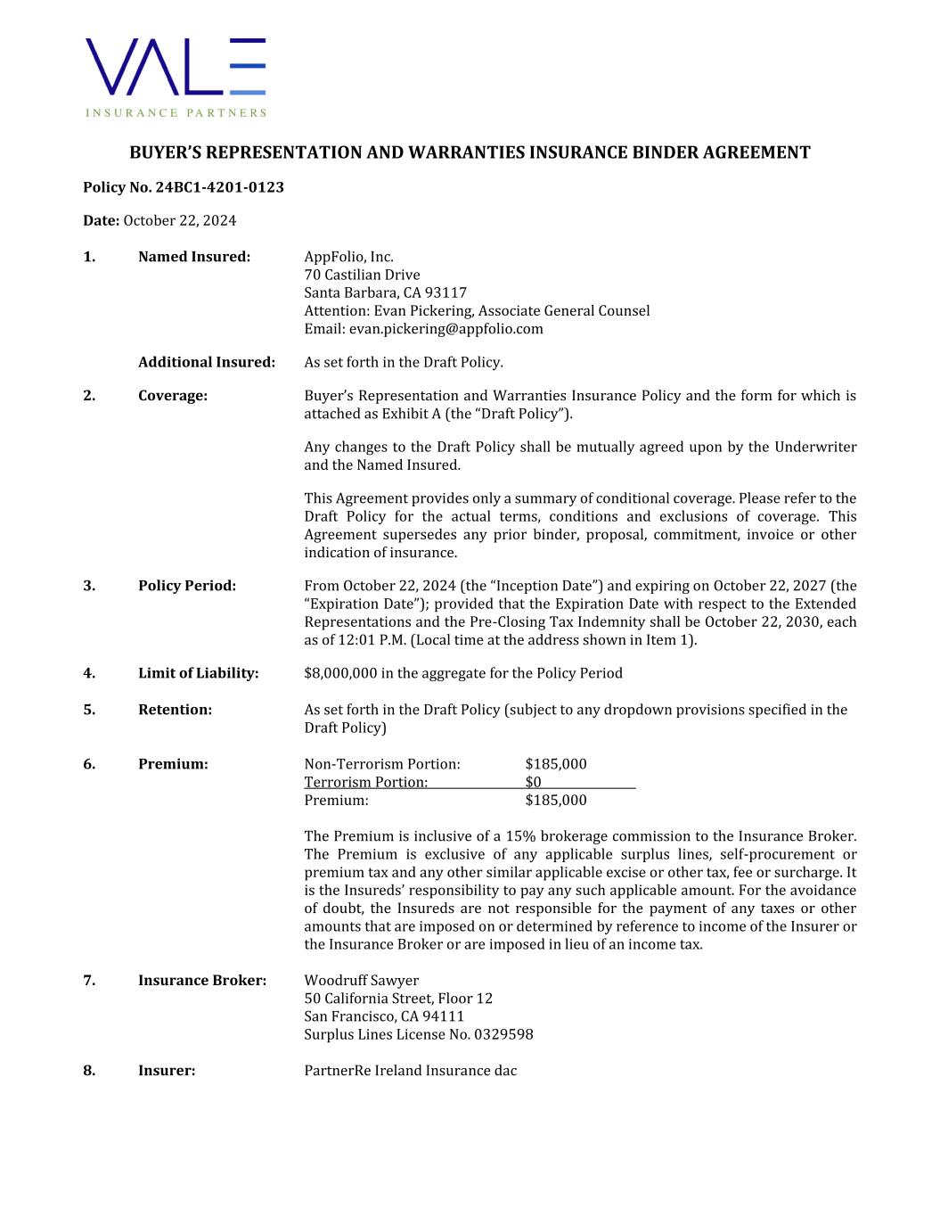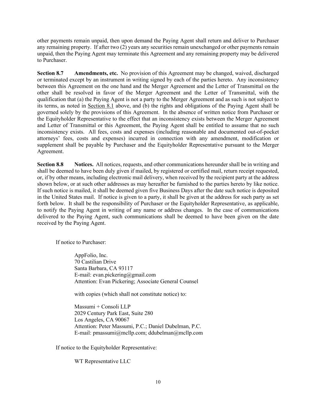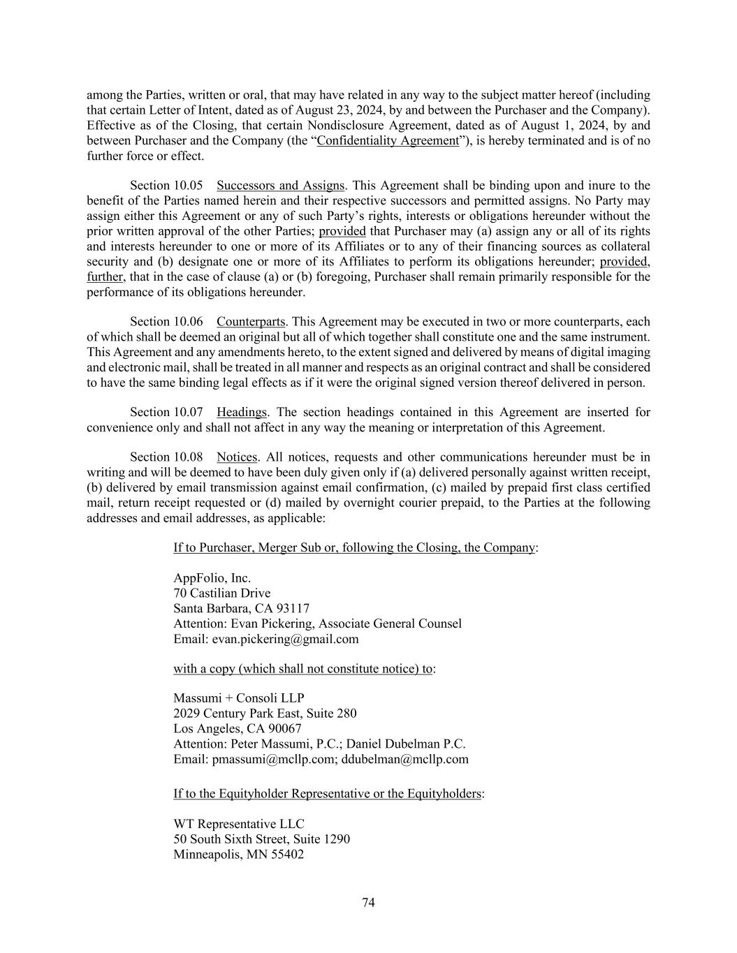 74 among the Parties, written or oral, that may have related in any way to the subject matter hereof (including that certain Letter of Intent, dated as of August 23, 2024, by and between the Purchaser and the Company). Effective as of the Closing, that certain Nondisclosure Agreement, dated as of August 1, 2024, by and between Purchaser and the Company (the “Confidentiality Agreement”), is hereby terminated and is of no further force or effect. Section 10.05 Successors and Assigns. This Agreement shall be binding upon and inure to the benefit of the Parties named herein and their respective successors and permitted assigns. No Party may assign either this Agreement or any of such Party’s rights, interests or obligations hereunder without the prior written approval of the other Parties; provided that Purchaser may (a) assign any or all of its rights and interests hereunder to one or more of its Affiliates or to any of their financing sources as collateral security and (b) designate one or more of its Affiliates to perform its obligations hereunder; provided, further, that in the case of clause (a) or (b) foregoing, Purchaser shall remain primarily responsible for the performance of its obligations hereunder. Section 10.06 Counterparts. This Agreement may be executed in two or more counterparts, each of which shall be deemed an original but all of which together shall constitute one and the same instrument. This Agreement and any amendments hereto, to the extent signed and delivered by means of digital imaging and electronic mail, shall be treated in all manner and respects as an original contract and shall be considered to have the same binding legal effects as if it were the original signed version thereof delivered in person. Section 10.07 Headings. The section headings contained in this Agreement are inserted for convenience only and shall not affect in any way the meaning or interpretation of this Agreement. Section 10.08 Notices. All notices, requests and other communications hereunder must be in writing and will be deemed to have been duly given only if (a) delivered personally against written receipt, (b) delivered by email transmission against email confirmation, (c) mailed by prepaid first class certified mail, return receipt requested or (d) mailed by overnight courier prepaid, to the Parties at the following addresses and email addresses, as applicable: If to Purchaser, Merger Sub or, following the Closing, the Company: AppFolio, Inc. 70 Castilian Drive Santa Barbara, CA 93117 Attention: Evan Pickering, Associate General Counsel Email: evan.pickering@gmail.com with a copy (which shall not constitute notice) to: Massumi + Consoli LLP 2029 Century Park East, Suite 280 Los Angeles, CA 90067 Attention: Peter Massumi, P.C.; Daniel Dubelman P.C. Email: pmassumi@mcllp.com; ddubelman@mcllp.com If to the Equityholder Representative or the Equityholders: WT Representative LLC 50 South Sixth Street, Suite 1290 Minneapolis, MN 55402