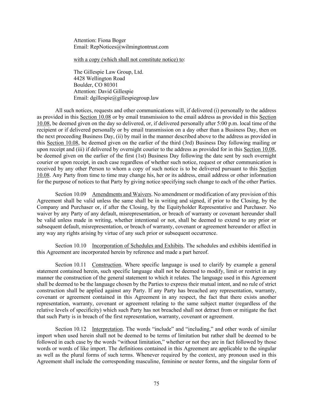 75 Attention: Fiona Boger Email: RepNotices@wilmingtontrust.com with a copy (which shall not constitute notice) to: The Gillespie Law Group, Ltd. 4428 Wellington Road Boulder, CO 80301 Attention: David Gillespie Email: dgillespie@gillespiegroup.law All such notices, requests and other communications will, if delivered (i) personally to the address as provided in this Section 10.08 or by email transmission to the email address as provided in this Section 10.08, be deemed given on the day so delivered, or, if delivered personally after 5:00 p.m. local time of the recipient or if delivered personally or by email transmission on a day other than a Business Day, then on the next proceeding Business Day, (ii) by mail in the manner described above to the address as provided in this Section 10.08, be deemed given on the earlier of the third (3rd) Business Day following mailing or upon receipt and (iii) if delivered by overnight courier to the address as provided for in this Section 10.08, be deemed given on the earlier of the first (1st) Business Day following the date sent by such overnight courier or upon receipt, in each case regardless of whether such notice, request or other communication is received by any other Person to whom a copy of such notice is to be delivered pursuant to this Section 10.08. Any Party from time to time may change his, her or its address, email address or other information for the purpose of notices to that Party by giving notice specifying such change to each of the other Parties. Section 10.09 Amendments and Waivers. No amendment or modification of any provision of this Agreement shall be valid unless the same shall be in writing and signed, if prior to the Closing, by the Company and Purchaser or, if after the Closing, by the Equityholder Representative and Purchaser. No waiver by any Party of any default, misrepresentation, or breach of warranty or covenant hereunder shall be valid unless made in writing, whether intentional or not, shall be deemed to extend to any prior or subsequent default, misrepresentation, or breach of warranty, covenant or agreement hereunder or affect in any way any rights arising by virtue of any such prior or subsequent occurrence. Section 10.10 Incorporation of Schedules and Exhibits. The schedules and exhibits identified in this Agreement are incorporated herein by reference and made a part hereof. Section 10.11 Construction. Where specific language is used to clarify by example a general statement contained herein, such specific language shall not be deemed to modify, limit or restrict in any manner the construction of the general statement to which it relates. The language used in this Agreement shall be deemed to be the language chosen by the Parties to express their mutual intent, and no rule of strict construction shall be applied against any Party. If any Party has breached any representation, warranty, covenant or agreement contained in this Agreement in any respect, the fact that there exists another representation, warranty, covenant or agreement relating to the same subject matter (regardless of the relative levels of specificity) which such Party has not breached shall not detract from or mitigate the fact that such Party is in breach of the first representation, warranty, covenant or agreement. Section 10.12 Interpretation. The words “include” and “including,” and other words of similar import when used herein shall not be deemed to be terms of limitation but rather shall be deemed to be followed in each case by the words “without limitation,” whether or not they are in fact followed by those words or words of like import. The definitions contained in this Agreement are applicable to the singular as well as the plural forms of such terms. Whenever required by the context, any pronoun used in this Agreement shall include the corresponding masculine, feminine or neuter forms, and the singular form of