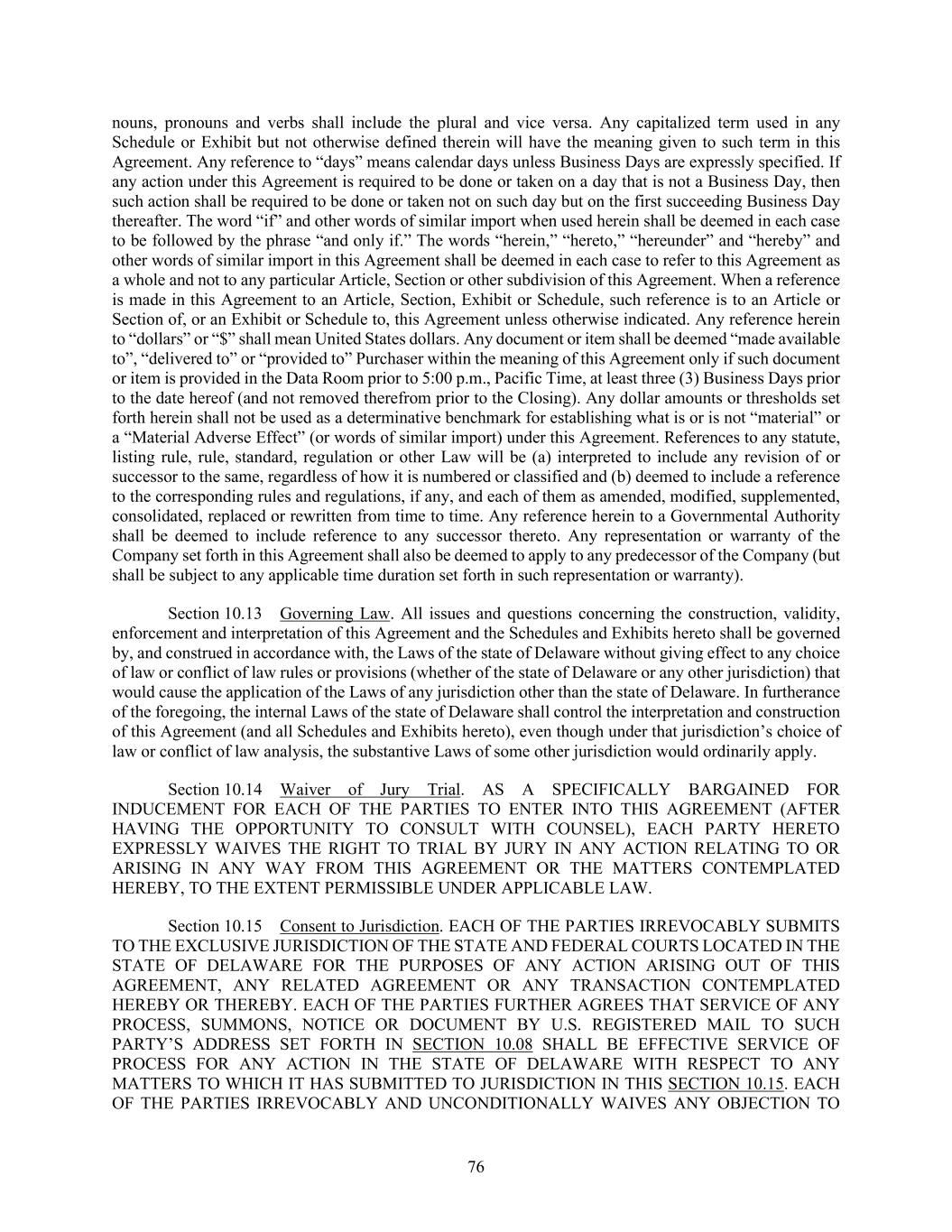 76 nouns, pronouns and verbs shall include the plural and vice versa. Any capitalized term used in any Schedule or Exhibit but not otherwise defined therein will have the meaning given to such term in this Agreement. Any reference to “days” means calendar days unless Business Days are expressly specified. If any action under this Agreement is required to be done or taken on a day that is not a Business Day, then such action shall be required to be done or taken not on such day but on the first succeeding Business Day thereafter. The word “if” and other words of similar import when used herein shall be deemed in each case to be followed by the phrase “and only if.” The words “herein,” “hereto,” “hereunder” and “hereby” and other words of similar import in this Agreement shall be deemed in each case to refer to this Agreement as a whole and not to any particular Article, Section or other subdivision of this Agreement. When a reference is made in this Agreement to an Article, Section, Exhibit or Schedule, such reference is to an Article or Section of, or an Exhibit or Schedule to, this Agreement unless otherwise indicated. Any reference herein to “dollars” or “$” shall mean United States dollars. Any document or item shall be deemed “made available to”, “delivered to” or “provided to” Purchaser within the meaning of this Agreement only if such document or item is provided in the Data Room prior to 5:00 p.m., Pacific Time, at least three (3) Business Days prior to the date hereof (and not removed therefrom prior to the Closing). Any dollar amounts or thresholds set forth herein shall not be used as a determinative benchmark for establishing what is or is not “material” or a “Material Adverse Effect” (or words of similar import) under this Agreement. References to any statute, listing rule, rule, standard, regulation or other Law will be (a) interpreted to include any revision of or successor to the same, regardless of how it is numbered or classified and (b) deemed to include a reference to the corresponding rules and regulations, if any, and each of them as amended, modified, supplemented, consolidated, replaced or rewritten from time to time. Any reference herein to a Governmental Authority shall be deemed to include reference to any successor thereto. Any representation or warranty of the Company set forth in this Agreement shall also be deemed to apply to any predecessor of the Company (but shall be subject to any applicable time duration set forth in such representation or warranty). Section 10.13 Governing Law. All issues and questions concerning the construction, validity, enforcement and interpretation of this Agreement and the Schedules and Exhibits hereto shall be governed by, and construed in accordance with, the Laws of the state of Delaware without giving effect to any choice of law or conflict of law rules or provisions (whether of the state of Delaware or any other jurisdiction) that would cause the application of the Laws of any jurisdiction other than the state of Delaware. In furtherance of the foregoing, the internal Laws of the state of Delaware shall control the interpretation and construction of this Agreement (and all Schedules and Exhibits hereto), even though under that jurisdiction’s choice of law or conflict of law analysis, the substantive Laws of some other jurisdiction would ordinarily apply. Section 10.14 Waiver of Jury Trial. AS A SPECIFICALLY BARGAINED FOR INDUCEMENT FOR EACH OF THE PARTIES TO ENTER INTO THIS AGREEMENT (AFTER HAVING THE OPPORTUNITY TO CONSULT WITH COUNSEL), EACH PARTY HERETO EXPRESSLY WAIVES THE RIGHT TO TRIAL BY JURY IN ANY ACTION RELATING TO OR ARISING IN ANY WAY FROM THIS AGREEMENT OR THE MATTERS CONTEMPLATED HEREBY, TO THE EXTENT PERMISSIBLE UNDER APPLICABLE LAW. Section 10.15 Consent to Jurisdiction. EACH OF THE PARTIES IRREVOCABLY SUBMITS TO THE EXCLUSIVE JURISDICTION OF THE STATE AND FEDERAL COURTS LOCATED IN THE STATE OF DELAWARE FOR THE PURPOSES OF ANY ACTION ARISING OUT OF THIS AGREEMENT, ANY RELATED AGREEMENT OR ANY TRANSACTION CONTEMPLATED HEREBY OR THEREBY. EACH OF THE PARTIES FURTHER AGREES THAT SERVICE OF ANY PROCESS, SUMMONS, NOTICE OR DOCUMENT BY U.S. REGISTERED MAIL TO SUCH PARTY’S ADDRESS SET FORTH IN SECTION 10.08 SHALL BE EFFECTIVE SERVICE OF PROCESS FOR ANY ACTION IN THE STATE OF DELAWARE WITH RESPECT TO ANY MATTERS TO WHICH IT HAS SUBMITTED TO JURISDICTION IN THIS SECTION 10.15. EACH OF THE PARTIES IRREVOCABLY AND UNCONDITIONALLY WAIVES ANY OBJECTION TO