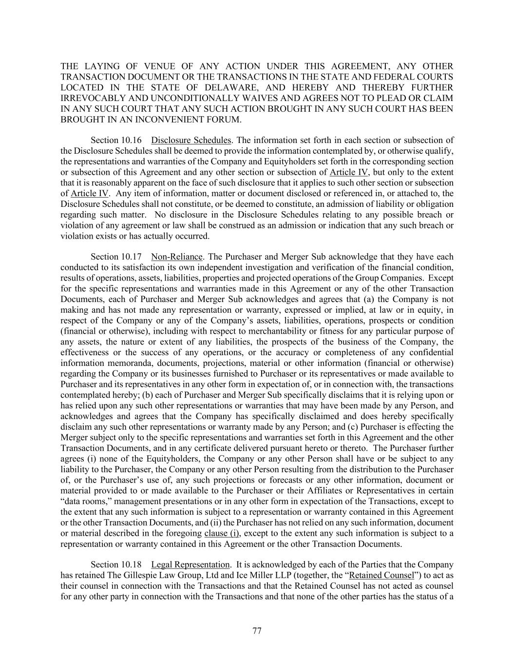 77 THE LAYING OF VENUE OF ANY ACTION UNDER THIS AGREEMENT, ANY OTHER TRANSACTION DOCUMENT OR THE TRANSACTIONS IN THE STATE AND FEDERAL COURTS LOCATED IN THE STATE OF DELAWARE, AND HEREBY AND THEREBY FURTHER IRREVOCABLY AND UNCONDITIONALLY WAIVES AND AGREES NOT TO PLEAD OR CLAIM IN ANY SUCH COURT THAT ANY SUCH ACTION BROUGHT IN ANY SUCH COURT HAS BEEN BROUGHT IN AN INCONVENIENT FORUM. Section 10.16 Disclosure Schedules. The information set forth in each section or subsection of the Disclosure Schedules shall be deemed to provide the information contemplated by, or otherwise qualify, the representations and warranties of the Company and Equityholders set forth in the corresponding section or subsection of this Agreement and any other section or subsection of Article IV, but only to the extent that it is reasonably apparent on the face of such disclosure that it applies to such other section or subsection of Article IV. Any item of information, matter or document disclosed or referenced in, or attached to, the Disclosure Schedules shall not constitute, or be deemed to constitute, an admission of liability or obligation regarding such matter. No disclosure in the Disclosure Schedules relating to any possible breach or violation of any agreement or law shall be construed as an admission or indication that any such breach or violation exists or has actually occurred. Section 10.17 Non-Reliance. The Purchaser and Merger Sub acknowledge that they have each conducted to its satisfaction its own independent investigation and verification of the financial condition, results of operations, assets, liabilities, properties and projected operations of the Group Companies. Except for the specific representations and warranties made in this Agreement or any of the other Transaction Documents, each of Purchaser and Merger Sub acknowledges and agrees that (a) the Company is not making and has not made any representation or warranty, expressed or implied, at law or in equity, in respect of the Company or any of the Company’s assets, liabilities, operations, prospects or condition (financial or otherwise), including with respect to merchantability or fitness for any particular purpose of any assets, the nature or extent of any liabilities, the prospects of the business of the Company, the effectiveness or the success of any operations, or the accuracy or completeness of any confidential information memoranda, documents, projections, material or other information (financial or otherwise) regarding the Company or its businesses furnished to Purchaser or its representatives or made available to Purchaser and its representatives in any other form in expectation of, or in connection with, the transactions contemplated hereby; (b) each of Purchaser and Merger Sub specifically disclaims that it is relying upon or has relied upon any such other representations or warranties that may have been made by any Person, and acknowledges and agrees that the Company has specifically disclaimed and does hereby specifically disclaim any such other representations or warranty made by any Person; and (c) Purchaser is effecting the Merger subject only to the specific representations and warranties set forth in this Agreement and the other Transaction Documents, and in any certificate delivered pursuant hereto or thereto. The Purchaser further agrees (i) none of the Equityholders, the Company or any other Person shall have or be subject to any liability to the Purchaser, the Company or any other Person resulting from the distribution to the Purchaser of, or the Purchaser’s use of, any such projections or forecasts or any other information, document or material provided to or made available to the Purchaser or their Affiliates or Representatives in certain “data rooms,” management presentations or in any other form in expectation of the Transactions, except to the extent that any such information is subject to a representation or warranty contained in this Agreement or the other Transaction Documents, and (ii) the Purchaser has not relied on any such information, document or material described in the foregoing clause (i), except to the extent any such information is subject to a representation or warranty contained in this Agreement or the other Transaction Documents. Section 10.18 Legal Representation. It is acknowledged by each of the Parties that the Company has retained The Gillespie Law Group, Ltd and Ice Miller LLP (together, the “Retained Counsel”) to act as their counsel in connection with the Transactions and that the Retained Counsel has not acted as counsel for any other party in connection with the Transactions and that none of the other parties has the status of a