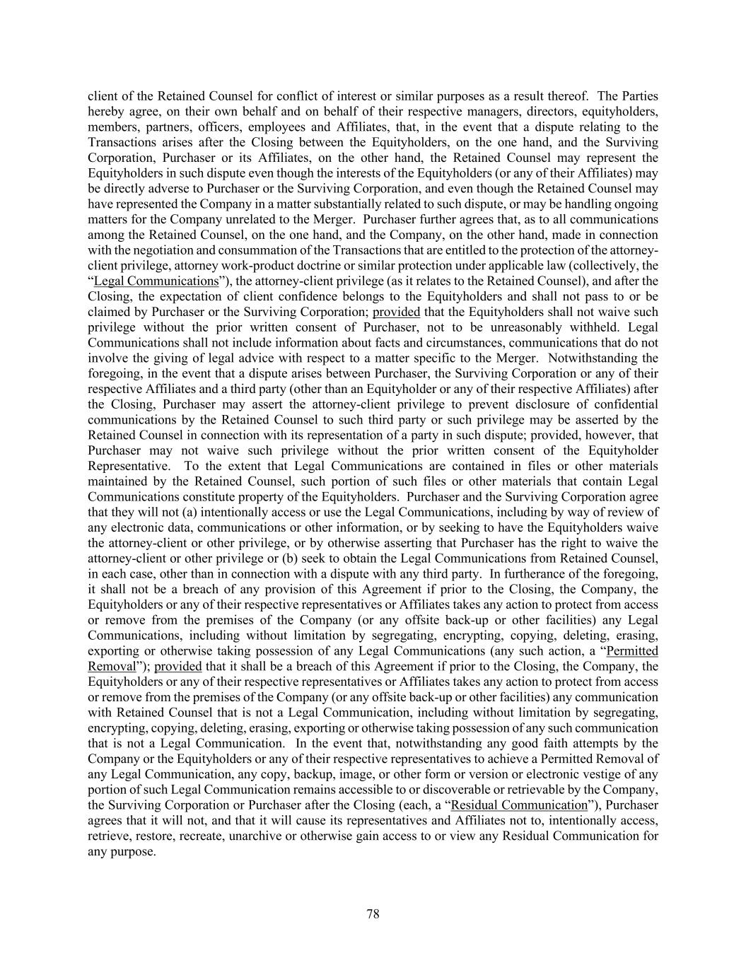 78 client of the Retained Counsel for conflict of interest or similar purposes as a result thereof. The Parties hereby agree, on their own behalf and on behalf of their respective managers, directors, equityholders, members, partners, officers, employees and Affiliates, that, in the event that a dispute relating to the Transactions arises after the Closing between the Equityholders, on the one hand, and the Surviving Corporation, Purchaser or its Affiliates, on the other hand, the Retained Counsel may represent the Equityholders in such dispute even though the interests of the Equityholders (or any of their Affiliates) may be directly adverse to Purchaser or the Surviving Corporation, and even though the Retained Counsel may have represented the Company in a matter substantially related to such dispute, or may be handling ongoing matters for the Company unrelated to the Merger. Purchaser further agrees that, as to all communications among the Retained Counsel, on the one hand, and the Company, on the other hand, made in connection with the negotiation and consummation of the Transactions that are entitled to the protection of the attorney- client privilege, attorney work-product doctrine or similar protection under applicable law (collectively, the “Legal Communications”), the attorney-client privilege (as it relates to the Retained Counsel), and after the Closing, the expectation of client confidence belongs to the Equityholders and shall not pass to or be claimed by Purchaser or the Surviving Corporation; provided that the Equityholders shall not waive such privilege without the prior written consent of Purchaser, not to be unreasonably withheld. Legal Communications shall not include information about facts and circumstances, communications that do not involve the giving of legal advice with respect to a matter specific to the Merger. Notwithstanding the foregoing, in the event that a dispute arises between Purchaser, the Surviving Corporation or any of their respective Affiliates and a third party (other than an Equityholder or any of their respective Affiliates) after the Closing, Purchaser may assert the attorney-client privilege to prevent disclosure of confidential communications by the Retained Counsel to such third party or such privilege may be asserted by the Retained Counsel in connection with its representation of a party in such dispute; provided, however, that Purchaser may not waive such privilege without the prior written consent of the Equityholder Representative. To the extent that Legal Communications are contained in files or other materials maintained by the Retained Counsel, such portion of such files or other materials that contain Legal Communications constitute property of the Equityholders. Purchaser and the Surviving Corporation agree that they will not (a) intentionally access or use the Legal Communications, including by way of review of any electronic data, communications or other information, or by seeking to have the Equityholders waive the attorney-client or other privilege, or by otherwise asserting that Purchaser has the right to waive the attorney-client or other privilege or (b) seek to obtain the Legal Communications from Retained Counsel, in each case, other than in connection with a dispute with any third party. In furtherance of the foregoing, it shall not be a breach of any provision of this Agreement if prior to the Closing, the Company, the Equityholders or any of their respective representatives or Affiliates takes any action to protect from access or remove from the premises of the Company (or any offsite back-up or other facilities) any Legal Communications, including without limitation by segregating, encrypting, copying, deleting, erasing, exporting or otherwise taking possession of any Legal Communications (any such action, a “Permitted Removal”); provided that it shall be a breach of this Agreement if prior to the Closing, the Company, the Equityholders or any of their respective representatives or Affiliates takes any action to protect from access or remove from the premises of the Company (or any offsite back-up or other facilities) any communication with Retained Counsel that is not a Legal Communication, including without limitation by segregating, encrypting, copying, deleting, erasing, exporting or otherwise taking possession of any such communication that is not a Legal Communication. In the event that, notwithstanding any good faith attempts by the Company or the Equityholders or any of their respective representatives to achieve a Permitted Removal of any Legal Communication, any copy, backup, image, or other form or version or electronic vestige of any portion of such Legal Communication remains accessible to or discoverable or retrievable by the Company, the Surviving Corporation or Purchaser after the Closing (each, a “Residual Communication”), Purchaser agrees that it will not, and that it will cause its representatives and Affiliates not to, intentionally access, retrieve, restore, recreate, unarchive or otherwise gain access to or view any Residual Communication for any purpose.