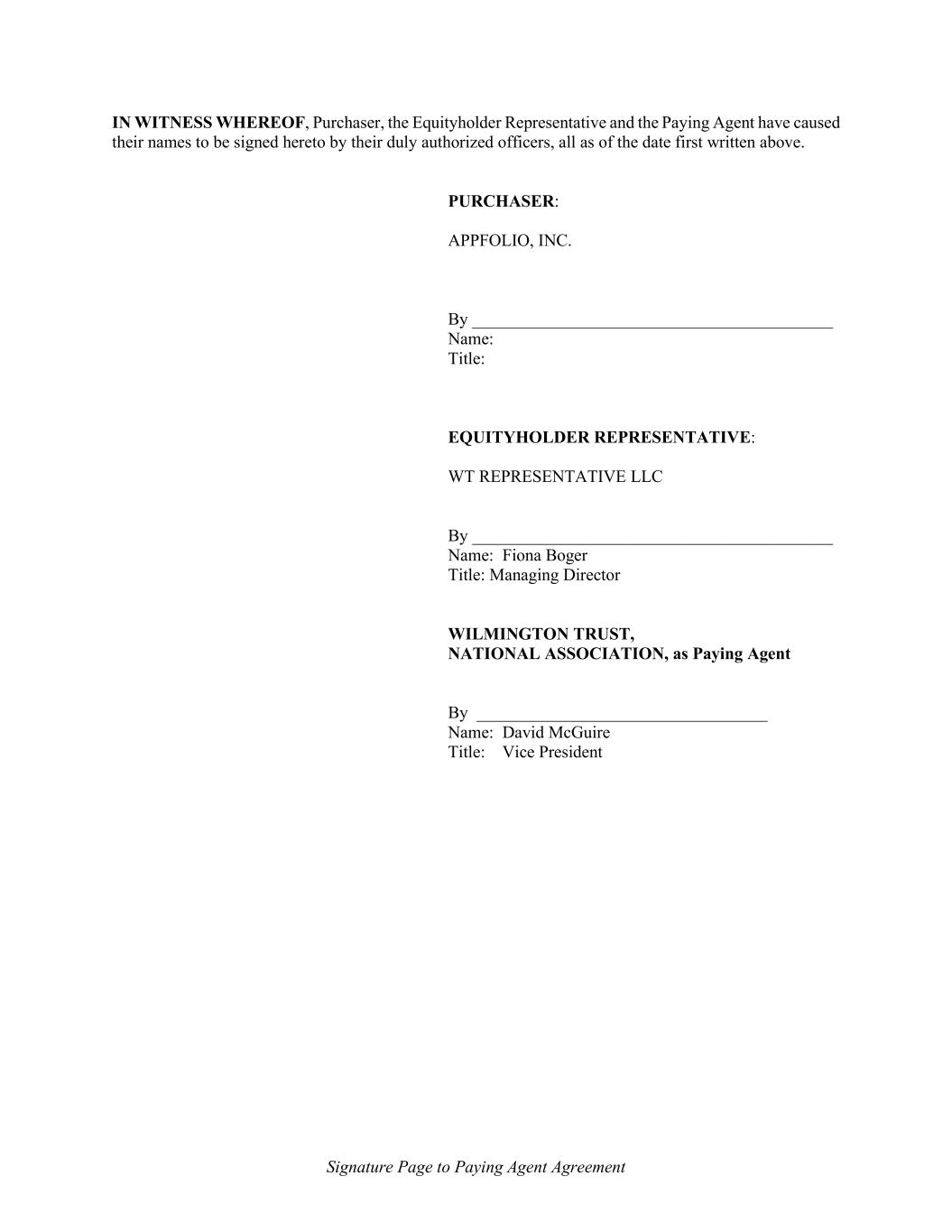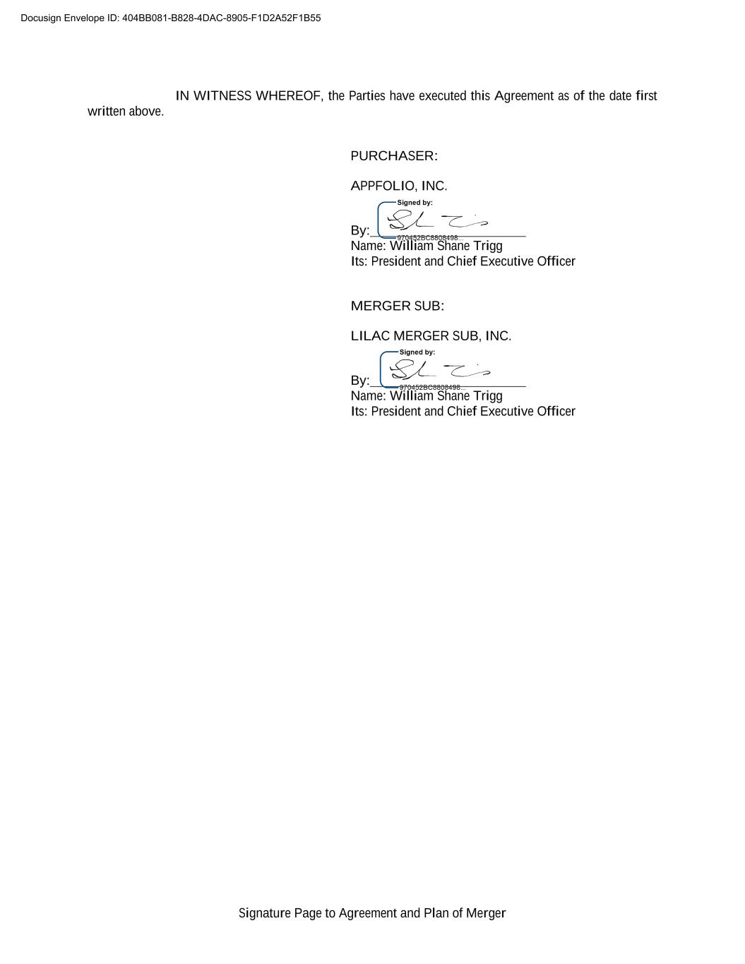 Signature Page to Agreement and Plan of Merger IN WITNESS WHEREOF, the Parties have executed this Agreement as of the date first written above. PURCHASER: APPFOLIO, INC. By: Name: William Shane Trigg Its: President and Chief Executive Officer MERGER SUB: LILAC MERGER SUB, INC. By: Name: William Shane Trigg Its: President and Chief Executive Officer Docusign Envelope ID: 404BB081-B828-4DAC-8905-F1D2A52F1B55