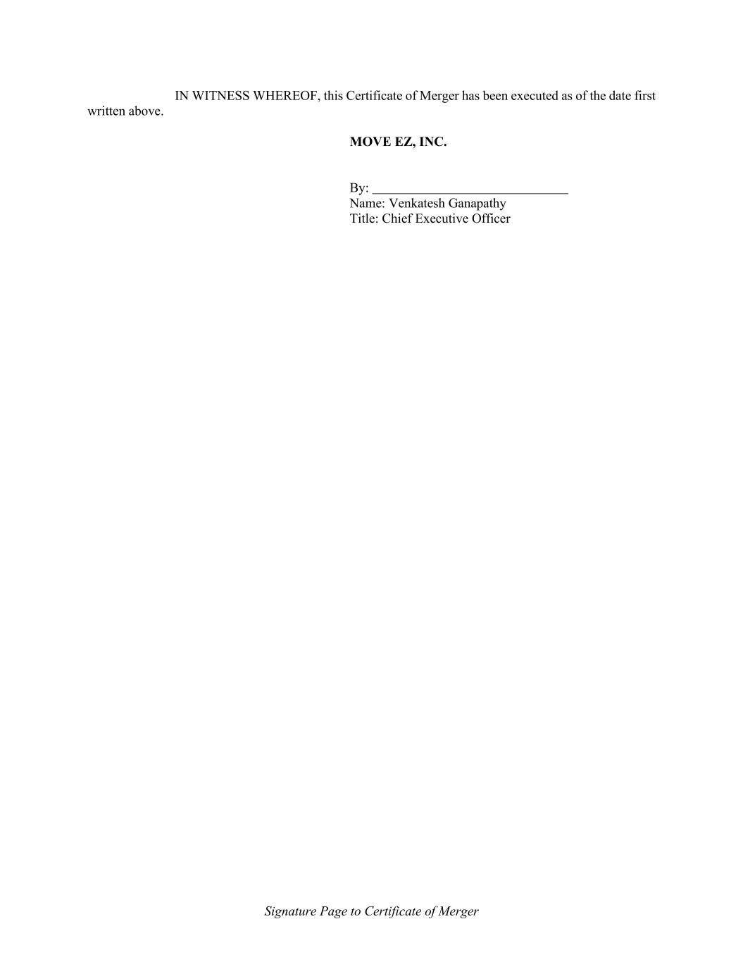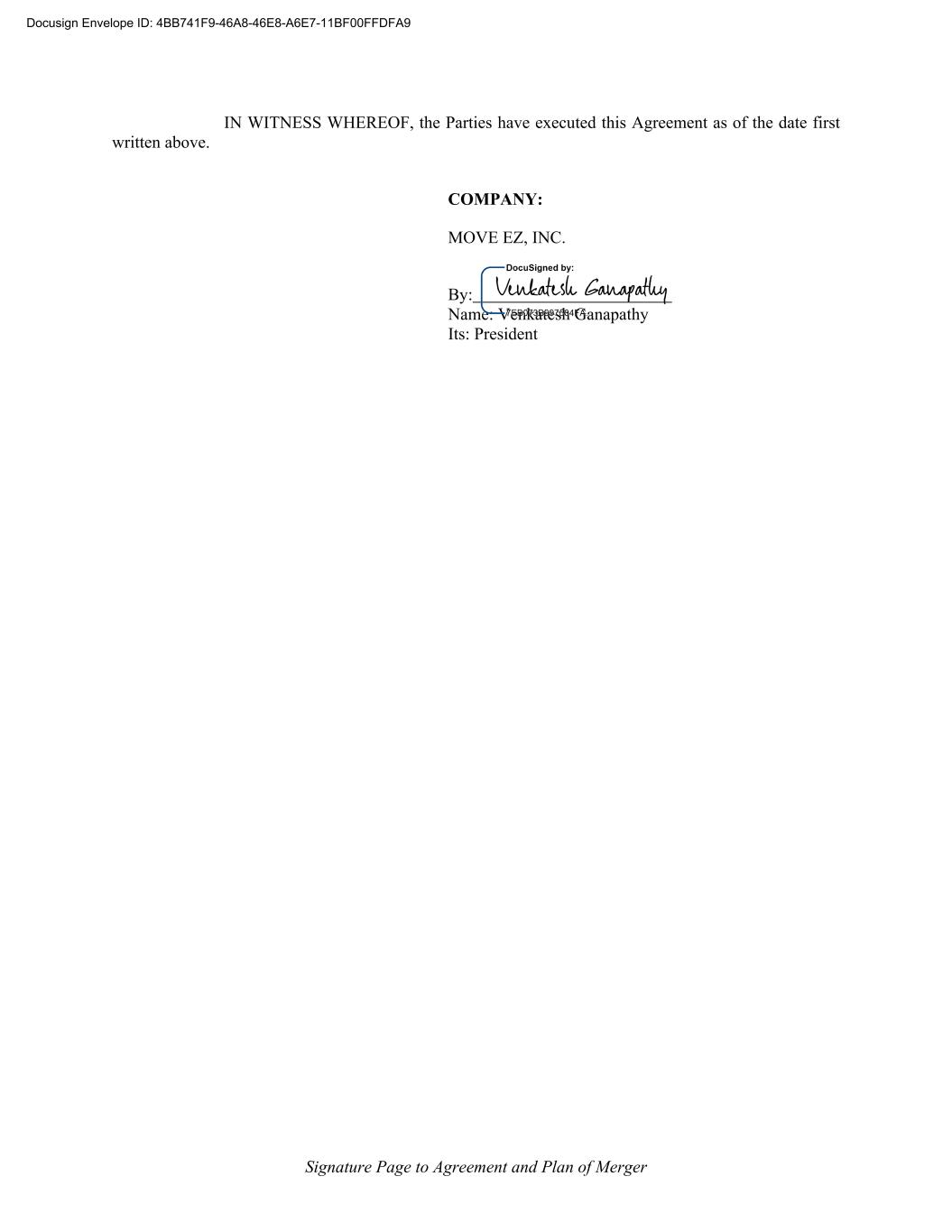 Signature Page to Agreement and Plan of Merger IN WITNESS WHEREOF, the Parties have executed this Agreement as of the date first written above. COMPANY: MOVE EZ, INC. By: Name: Venkatesh Ganapathy Its: President Docusign Envelope ID: 4BB741F9-46A8-46E8-A6E7-11BF00FFDFA9