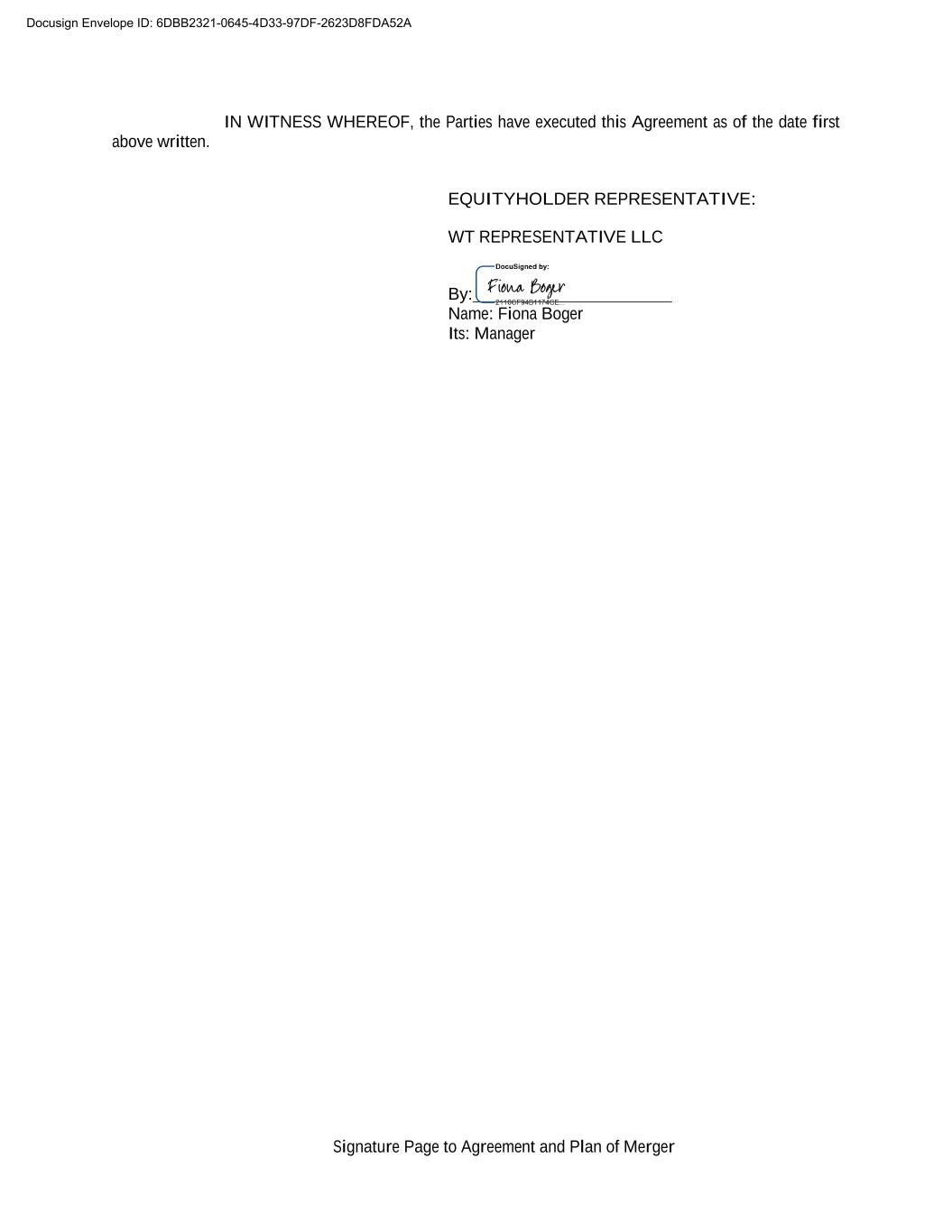 Signature Page to Agreement and Plan of Merger IN WITNESS WHEREOF, the Parties have executed this Agreement as of the date first above written. EQUITYHOLDER REPRESENTATIVE: WT REPRESENTATIVE LLC By: Name: Fiona Boger Its: Manager Docusign Envelope ID: 6DBB2321-0645-4D33-97DF-2623D8FDA52A