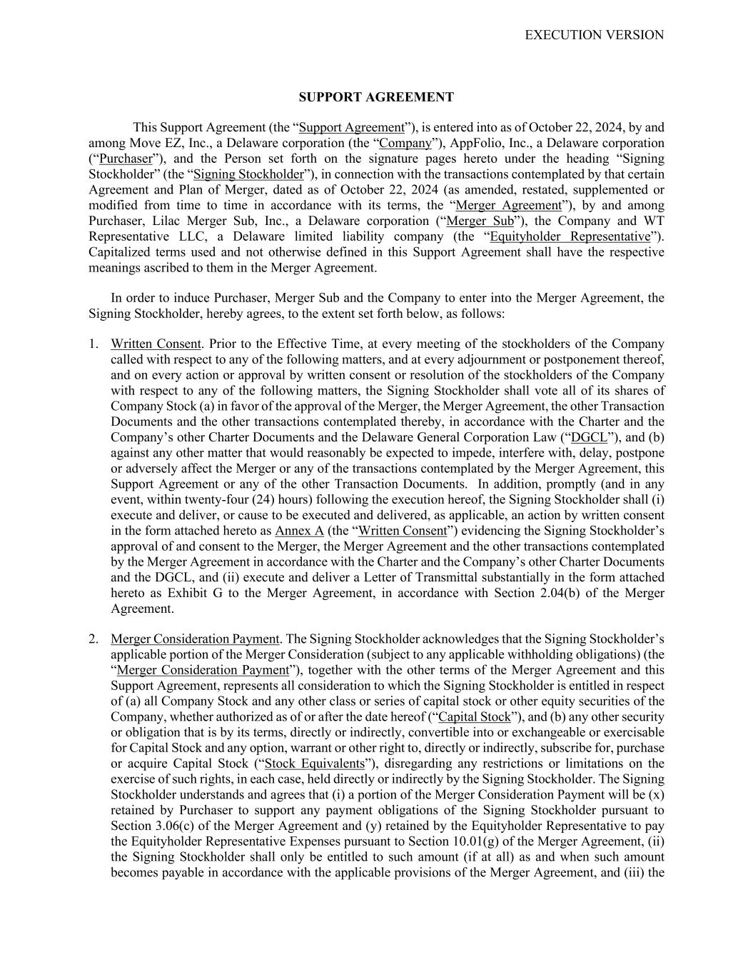 EXECUTION VERSION SUPPORT AGREEMENT This Support Agreement (the “Support Agreement”), is entered into as of October 22, 2024, by and among Move EZ, Inc., a Delaware corporation (the “Company”), AppFolio, Inc., a Delaware corporation (“Purchaser”), and the Person set forth on the signature pages hereto under the heading “Signing Stockholder” (the “Signing Stockholder”), in connection with the transactions contemplated by that certain Agreement and Plan of Merger, dated as of October 22, 2024 (as amended, restated, supplemented or modified from time to time in accordance with its terms, the “Merger Agreement”), by and among Purchaser, Lilac Merger Sub, Inc., a Delaware corporation (“Merger Sub”), the Company and WT Representative LLC, a Delaware limited liability company (the “Equityholder Representative”). Capitalized terms used and not otherwise defined in this Support Agreement shall have the respective meanings ascribed to them in the Merger Agreement. In order to induce Purchaser, Merger Sub and the Company to enter into the Merger Agreement, the Signing Stockholder, hereby agrees, to the extent set forth below, as follows: 1. Written Consent. Prior to the Effective Time, at every meeting of the stockholders of the Company called with respect to any of the following matters, and at every adjournment or postponement thereof, and on every action or approval by written consent or resolution of the stockholders of the Company with respect to any of the following matters, the Signing Stockholder shall vote all of its shares of Company Stock (a) in favor of the approval of the Merger, the Merger Agreement, the other Transaction Documents and the other transactions contemplated thereby, in accordance with the Charter and the Company’s other Charter Documents and the Delaware General Corporation Law (“DGCL”), and (b) against any other matter that would reasonably be expected to impede, interfere with, delay, postpone or adversely affect the Merger or any of the transactions contemplated by the Merger Agreement, this Support Agreement or any of the other Transaction Documents. In addition, promptly (and in any event, within twenty-four (24) hours) following the execution hereof, the Signing Stockholder shall (i) execute and deliver, or cause to be executed and delivered, as applicable, an action by written consent in the form attached hereto as Annex A (the “Written Consent”) evidencing the Signing Stockholder’s approval of and consent to the Merger, the Merger Agreement and the other transactions contemplated by the Merger Agreement in accordance with the Charter and the Company’s other Charter Documents and the DGCL, and (ii) execute and deliver a Letter of Transmittal substantially in the form attached hereto as Exhibit G to the Merger Agreement, in accordance with Section 2.04(b) of the Merger Agreement. 2. Merger Consideration Payment. The Signing Stockholder acknowledges that the Signing Stockholder’s applicable portion of the Merger Consideration (subject to any applicable withholding obligations) (the “Merger Consideration Payment”), together with the other terms of the Merger Agreement and this Support Agreement, represents all consideration to which the Signing Stockholder is entitled in respect of (a) all Company Stock and any other class or series of capital stock or other equity securities of the Company, whether authorized as of or after the date hereof (“Capital Stock”), and (b) any other security or obligation that is by its terms, directly or indirectly, convertible into or exchangeable or exercisable for Capital Stock and any option, warrant or other right to, directly or indirectly, subscribe for, purchase or acquire Capital Stock (“Stock Equivalents”), disregarding any restrictions or limitations on the exercise of such rights, in each case, held directly or indirectly by the Signing Stockholder. The Signing Stockholder understands and agrees that (i) a portion of the Merger Consideration Payment will be (x) retained by Purchaser to support any payment obligations of the Signing Stockholder pursuant to Section 3.06(c) of the Merger Agreement and (y) retained by the Equityholder Representative to pay the Equityholder Representative Expenses pursuant to Section 10.01(g) of the Merger Agreement, (ii) the Signing Stockholder shall only be entitled to such amount (if at all) as and when such amount becomes payable in accordance with the applicable provisions of the Merger Agreement, and (iii) the