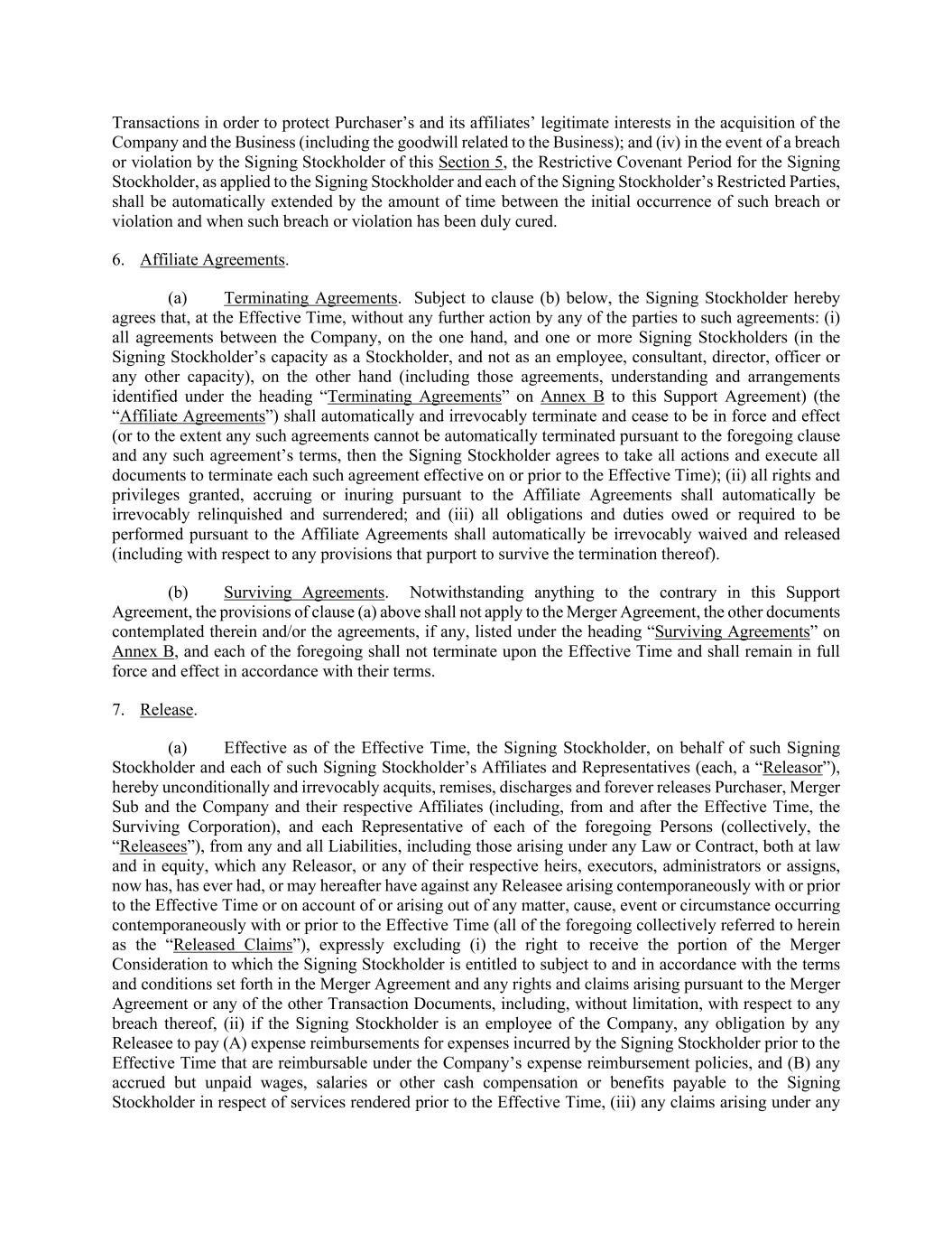 Transactions in order to protect Purchaser’s and its affiliates’ legitimate interests in the acquisition of the Company and the Business (including the goodwill related to the Business); and (iv) in the event of a breach or violation by the Signing Stockholder of this Section 5, the Restrictive Covenant Period for the Signing Stockholder, as applied to the Signing Stockholder and each of the Signing Stockholder’s Restricted Parties, shall be automatically extended by the amount of time between the initial occurrence of such breach or violation and when such breach or violation has been duly cured. 6. Affiliate Agreements. (a) Terminating Agreements. Subject to clause (b) below, the Signing Stockholder hereby agrees that, at the Effective Time, without any further action by any of the parties to such agreements: (i) all agreements between the Company, on the one hand, and one or more Signing Stockholders (in the Signing Stockholder’s capacity as a Stockholder, and not as an employee, consultant, director, officer or any other capacity), on the other hand (including those agreements, understanding and arrangements identified under the heading “Terminating Agreements” on Annex B to this Support Agreement) (the “Affiliate Agreements”) shall automatically and irrevocably terminate and cease to be in force and effect (or to the extent any such agreements cannot be automatically terminated pursuant to the foregoing clause and any such agreement’s terms, then the Signing Stockholder agrees to take all actions and execute all documents to terminate each such agreement effective on or prior to the Effective Time); (ii) all rights and privileges granted, accruing or inuring pursuant to the Affiliate Agreements shall automatically be irrevocably relinquished and surrendered; and (iii) all obligations and duties owed or required to be performed pursuant to the Affiliate Agreements shall automatically be irrevocably waived and released (including with respect to any provisions that purport to survive the termination thereof). (b) Surviving Agreements. Notwithstanding anything to the contrary in this Support Agreement, the provisions of clause (a) above shall not apply to the Merger Agreement, the other documents contemplated therein and/or the agreements, if any, listed under the heading “Surviving Agreements” on Annex B, and each of the foregoing shall not terminate upon the Effective Time and shall remain in full force and effect in accordance with their terms. 7. Release. (a) Effective as of the Effective Time, the Signing Stockholder, on behalf of such Signing Stockholder and each of such Signing Stockholder’s Affiliates and Representatives (each, a “Releasor”), hereby unconditionally and irrevocably acquits, remises, discharges and forever releases Purchaser, Merger Sub and the Company and their respective Affiliates (including, from and after the Effective Time, the Surviving Corporation), and each Representative of each of the foregoing Persons (collectively, the “Releasees”), from any and all Liabilities, including those arising under any Law or Contract, both at law and in equity, which any Releasor, or any of their respective heirs, executors, administrators or assigns, now has, has ever had, or may hereafter have against any Releasee arising contemporaneously with or prior to the Effective Time or on account of or arising out of any matter, cause, event or circumstance occurring contemporaneously with or prior to the Effective Time (all of the foregoing collectively referred to herein as the “Released Claims”), expressly excluding (i) the right to receive the portion of the Merger Consideration to which the Signing Stockholder is entitled to subject to and in accordance with the terms and conditions set forth in the Merger Agreement and any rights and claims arising pursuant to the Merger Agreement or any of the other Transaction Documents, including, without limitation, with respect to any breach thereof, (ii) if the Signing Stockholder is an employee of the Company, any obligation by any Releasee to pay (A) expense reimbursements for expenses incurred by the Signing Stockholder prior to the Effective Time that are reimbursable under the Company’s expense reimbursement policies, and (B) any accrued but unpaid wages, salaries or other cash compensation or benefits payable to the Signing Stockholder in respect of services rendered prior to the Effective Time, (iii) any claims arising under any