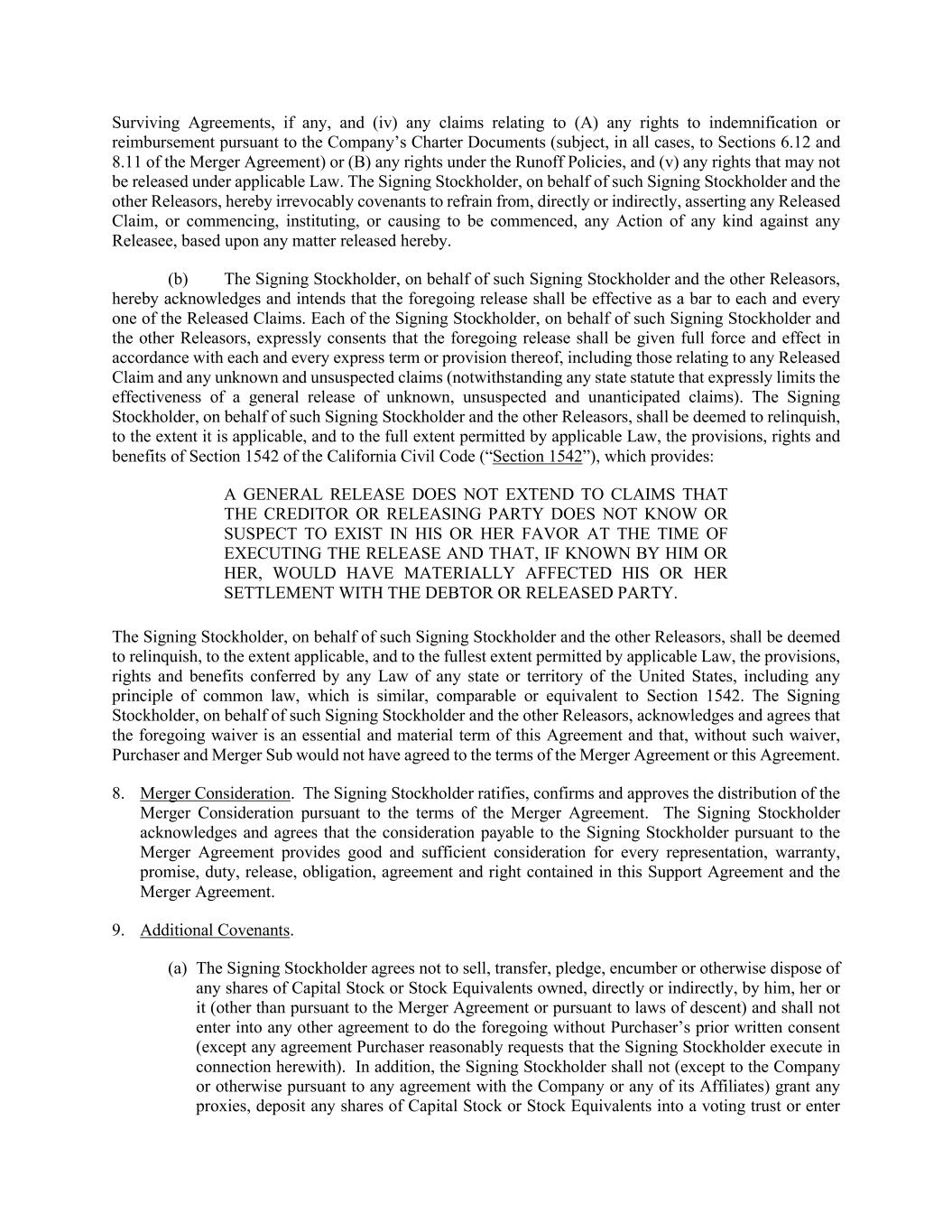 Surviving Agreements, if any, and (iv) any claims relating to (A) any rights to indemnification or reimbursement pursuant to the Company’s Charter Documents (subject, in all cases, to Sections 6.12 and 8.11 of the Merger Agreement) or (B) any rights under the Runoff Policies, and (v) any rights that may not be released under applicable Law. The Signing Stockholder, on behalf of such Signing Stockholder and the other Releasors, hereby irrevocably covenants to refrain from, directly or indirectly, asserting any Released Claim, or commencing, instituting, or causing to be commenced, any Action of any kind against any Releasee, based upon any matter released hereby. (b) The Signing Stockholder, on behalf of such Signing Stockholder and the other Releasors, hereby acknowledges and intends that the foregoing release shall be effective as a bar to each and every one of the Released Claims. Each of the Signing Stockholder, on behalf of such Signing Stockholder and the other Releasors, expressly consents that the foregoing release shall be given full force and effect in accordance with each and every express term or provision thereof, including those relating to any Released Claim and any unknown and unsuspected claims (notwithstanding any state statute that expressly limits the effectiveness of a general release of unknown, unsuspected and unanticipated claims). The Signing Stockholder, on behalf of such Signing Stockholder and the other Releasors, shall be deemed to relinquish, to the extent it is applicable, and to the full extent permitted by applicable Law, the provisions, rights and benefits of Section 1542 of the California Civil Code (“Section 1542”), which provides: A GENERAL RELEASE DOES NOT EXTEND TO CLAIMS THAT THE CREDITOR OR RELEASING PARTY DOES NOT KNOW OR SUSPECT TO EXIST IN HIS OR HER FAVOR AT THE TIME OF EXECUTING THE RELEASE AND THAT, IF KNOWN BY HIM OR HER, WOULD HAVE MATERIALLY AFFECTED HIS OR HER SETTLEMENT WITH THE DEBTOR OR RELEASED PARTY. The Signing Stockholder, on behalf of such Signing Stockholder and the other Releasors, shall be deemed to relinquish, to the extent applicable, and to the fullest extent permitted by applicable Law, the provisions, rights and benefits conferred by any Law of any state or territory of the United States, including any principle of common law, which is similar, comparable or equivalent to Section 1542. The Signing Stockholder, on behalf of such Signing Stockholder and the other Releasors, acknowledges and agrees that the foregoing waiver is an essential and material term of this Agreement and that, without such waiver, Purchaser and Merger Sub would not have agreed to the terms of the Merger Agreement or this Agreement. 8. Merger Consideration. The Signing Stockholder ratifies, confirms and approves the distribution of the Merger Consideration pursuant to the terms of the Merger Agreement. The Signing Stockholder acknowledges and agrees that the consideration payable to the Signing Stockholder pursuant to the Merger Agreement provides good and sufficient consideration for every representation, warranty, promise, duty, release, obligation, agreement and right contained in this Support Agreement and the Merger Agreement. 9. Additional Covenants. (a) The Signing Stockholder agrees not to sell, transfer, pledge, encumber or otherwise dispose of any shares of Capital Stock or Stock Equivalents owned, directly or indirectly, by him, her or it (other than pursuant to the Merger Agreement or pursuant to laws of descent) and shall not enter into any other agreement to do the foregoing without Purchaser’s prior written consent (except any agreement Purchaser reasonably requests that the Signing Stockholder execute in connection herewith). In addition, the Signing Stockholder shall not (except to the Company or otherwise pursuant to any agreement with the Company or any of its Affiliates) grant any proxies, deposit any shares of Capital Stock or Stock Equivalents into a voting trust or enter