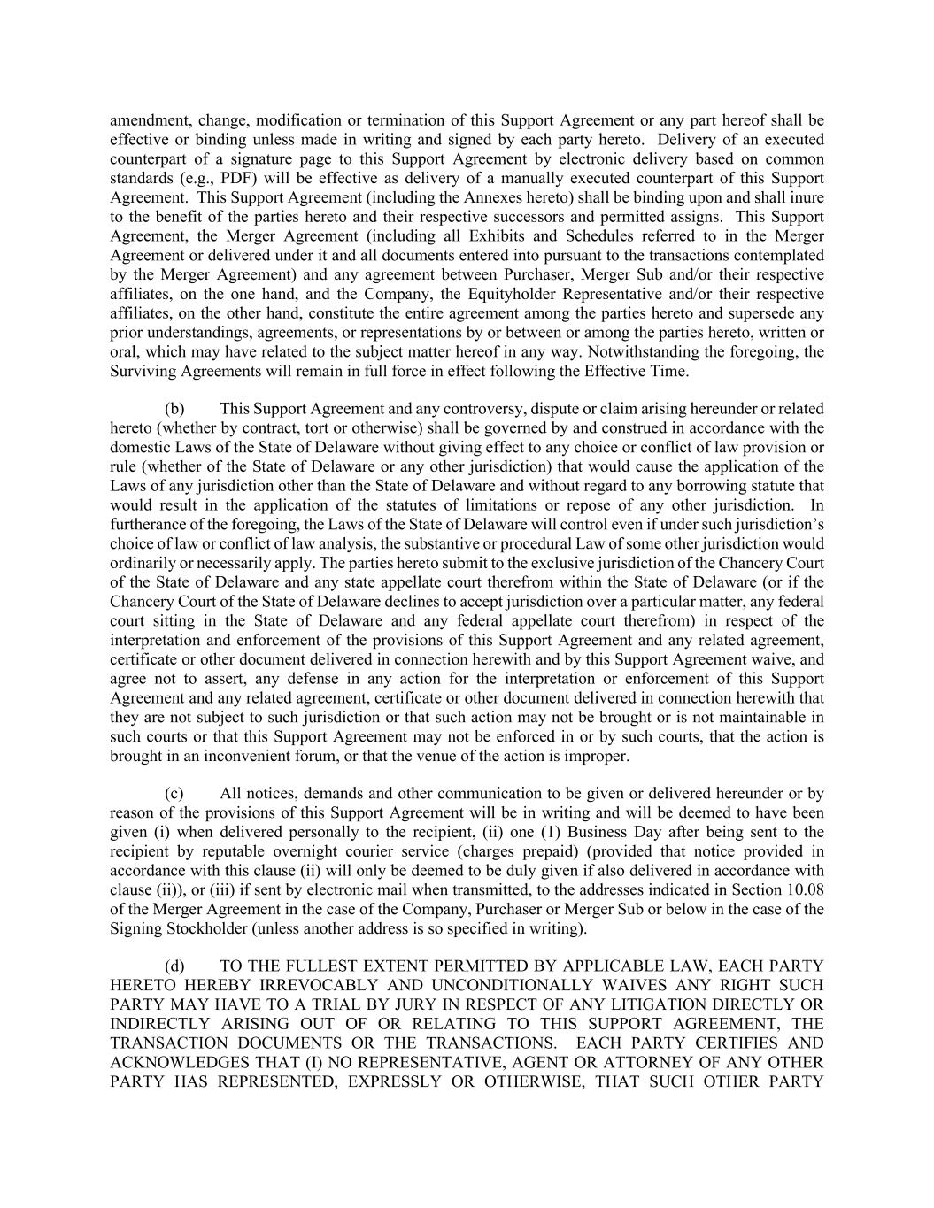 amendment, change, modification or termination of this Support Agreement or any part hereof shall be effective or binding unless made in writing and signed by each party hereto. Delivery of an executed counterpart of a signature page to this Support Agreement by electronic delivery based on common standards (e.g., PDF) will be effective as delivery of a manually executed counterpart of this Support Agreement. This Support Agreement (including the Annexes hereto) shall be binding upon and shall inure to the benefit of the parties hereto and their respective successors and permitted assigns. This Support Agreement, the Merger Agreement (including all Exhibits and Schedules referred to in the Merger Agreement or delivered under it and all documents entered into pursuant to the transactions contemplated by the Merger Agreement) and any agreement between Purchaser, Merger Sub and/or their respective affiliates, on the one hand, and the Company, the Equityholder Representative and/or their respective affiliates, on the other hand, constitute the entire agreement among the parties hereto and supersede any prior understandings, agreements, or representations by or between or among the parties hereto, written or oral, which may have related to the subject matter hereof in any way. Notwithstanding the foregoing, the Surviving Agreements will remain in full force in effect following the Effective Time. (b) This Support Agreement and any controversy, dispute or claim arising hereunder or related hereto (whether by contract, tort or otherwise) shall be governed by and construed in accordance with the domestic Laws of the State of Delaware without giving effect to any choice or conflict of law provision or rule (whether of the State of Delaware or any other jurisdiction) that would cause the application of the Laws of any jurisdiction other than the State of Delaware and without regard to any borrowing statute that would result in the application of the statutes of limitations or repose of any other jurisdiction. In furtherance of the foregoing, the Laws of the State of Delaware will control even if under such jurisdiction’s choice of law or conflict of law analysis, the substantive or procedural Law of some other jurisdiction would ordinarily or necessarily apply. The parties hereto submit to the exclusive jurisdiction of the Chancery Court of the State of Delaware and any state appellate court therefrom within the State of Delaware (or if the Chancery Court of the State of Delaware declines to accept jurisdiction over a particular matter, any federal court sitting in the State of Delaware and any federal appellate court therefrom) in respect of the interpretation and enforcement of the provisions of this Support Agreement and any related agreement, certificate or other document delivered in connection herewith and by this Support Agreement waive, and agree not to assert, any defense in any action for the interpretation or enforcement of this Support Agreement and any related agreement, certificate or other document delivered in connection herewith that they are not subject to such jurisdiction or that such action may not be brought or is not maintainable in such courts or that this Support Agreement may not be enforced in or by such courts, that the action is brought in an inconvenient forum, or that the venue of the action is improper. (c) All notices, demands and other communication to be given or delivered hereunder or by reason of the provisions of this Support Agreement will be in writing and will be deemed to have been given (i) when delivered personally to the recipient, (ii) one (1) Business Day after being sent to the recipient by reputable overnight courier service (charges prepaid) (provided that notice provided in accordance with this clause (ii) will only be deemed to be duly given if also delivered in accordance with clause (ii)), or (iii) if sent by electronic mail when transmitted, to the addresses indicated in Section 10.08 of the Merger Agreement in the case of the Company, Purchaser or Merger Sub or below in the case of the Signing Stockholder (unless another address is so specified in writing). (d) TO THE FULLEST EXTENT PERMITTED BY APPLICABLE LAW, EACH PARTY HERETO HEREBY IRREVOCABLY AND UNCONDITIONALLY WAIVES ANY RIGHT SUCH PARTY MAY HAVE TO A TRIAL BY JURY IN RESPECT OF ANY LITIGATION DIRECTLY OR INDIRECTLY ARISING OUT OF OR RELATING TO THIS SUPPORT AGREEMENT, THE TRANSACTION DOCUMENTS OR THE TRANSACTIONS. EACH PARTY CERTIFIES AND ACKNOWLEDGES THAT (I) NO REPRESENTATIVE, AGENT OR ATTORNEY OF ANY OTHER PARTY HAS REPRESENTED, EXPRESSLY OR OTHERWISE, THAT SUCH OTHER PARTY