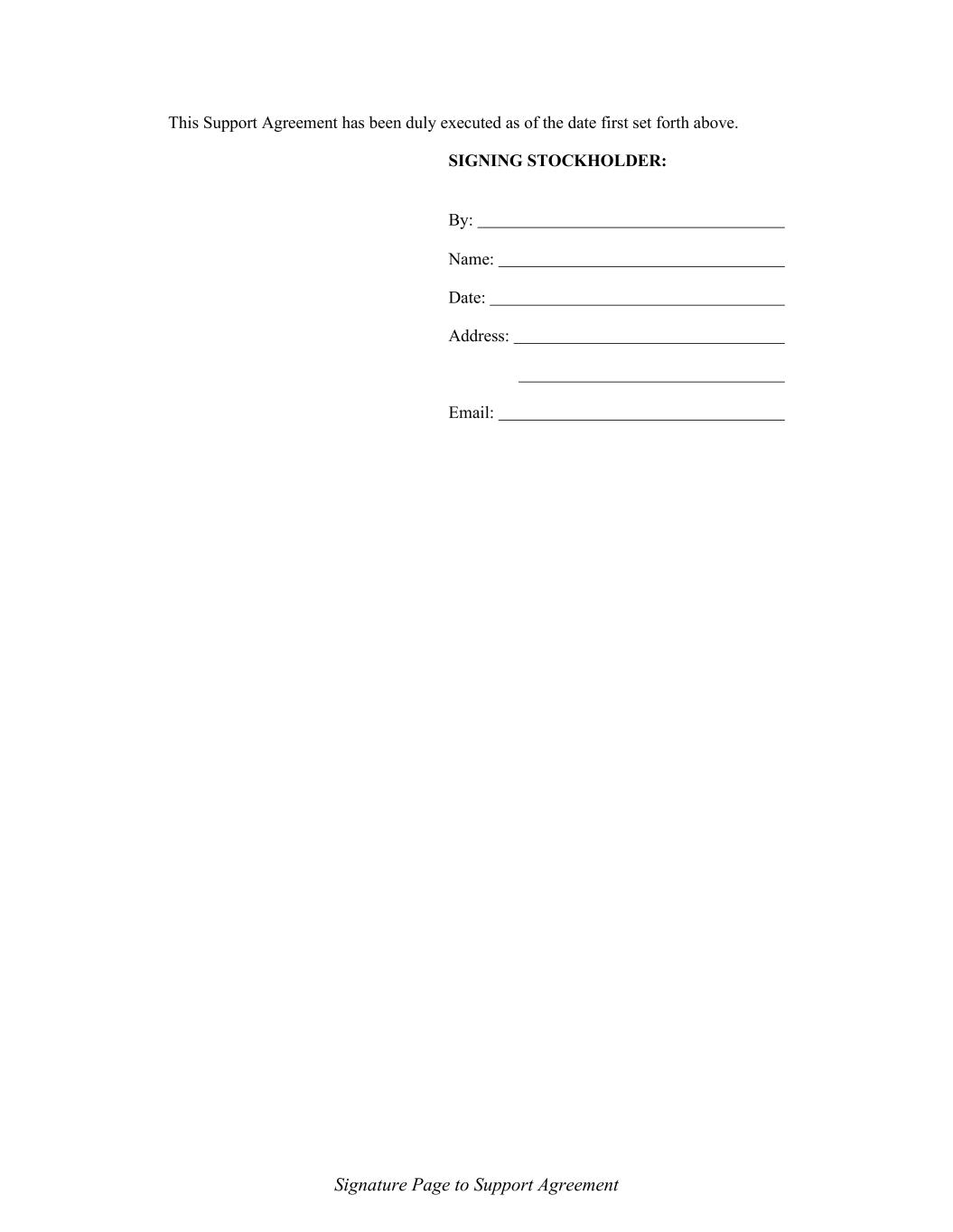 Signature Page to Written Consent of Stockholders IN WITNESS WHEREOF, by executing this Action by Written Consent of Stockholders, each undersigned stockholder is giving written consent with respect to all shares of the Company’s capital stock held by such stockholder in favor of the above resolutions as of the last date of execution by a stockholder hereunder. This Action by Written Consent of Stockholders may be executed and delivered by facsimile, electronic mail (including pdf or any electronic signature complying with the U.S. federal ESIGN Act of 2000, e.g., www.docusign.com) or other transmission method and any counterpart so delivered shall be deemed to have been duly and validly delivered and be valid and effective for all purposes. Any copy, facsimile or other reliable reproduction of this action may be substituted or used in lieu of the original writing for any and all purposes for which the original writing could be used, provided that such copy, facsimile or other reproduction be a complete reproduction of the entire original writing. STOCKHOLDERS: By: _____________________________ Date:_________________________