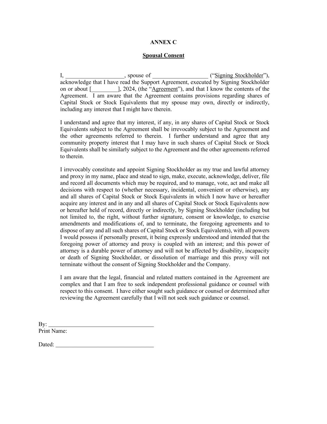 WOULD NOT, IN THE EVENT OF LITIGATION, SEEK TO ENFORCE THE FOREGOING WAIVER, (II) SUCH PARTY UNDERSTANDS AND HAS CONSIDERED THE IMPLICATIONS OF THIS WAIVER, (III) SUCH PARTY MAKES THIS WAIVER VOLUNTARILY, AND (IV) SUCH PARTY HAS BEEN INDUCED TO ENTER INTO THIS SUPPORT AGREEMENT BY, AMONG OTHER THINGS, THE MUTUAL WAIVERS AND CERTIFICATIONS IN THIS SECTION 12(D). (e) If the Signing Stockholder (i) is married and is a resident of a community property state (including California), or (ii) is a party to a community property agreement or arrangement with the Signing Stockholder’s spouse, the Signing Stockholder hereby affirms that (i) he or she has delivered with this Support Agreement a Spousal Consent in the form attached hereto as Annex C (the “Spousal Consent”), executed by the Signing Stockholder’s spouse and (ii) the Signing Stockholder’s spouse is competent to execute and deliver the Spousal Consent. (f) Section 10.12 of the Merger Agreement is incorporated herein by reference, and shall apply to the terms and provisions of this Support Agreement and the parties hereto mutatis mutandis. (Remainder of Page Intentionally Left Blank; Signature Pages Follow)