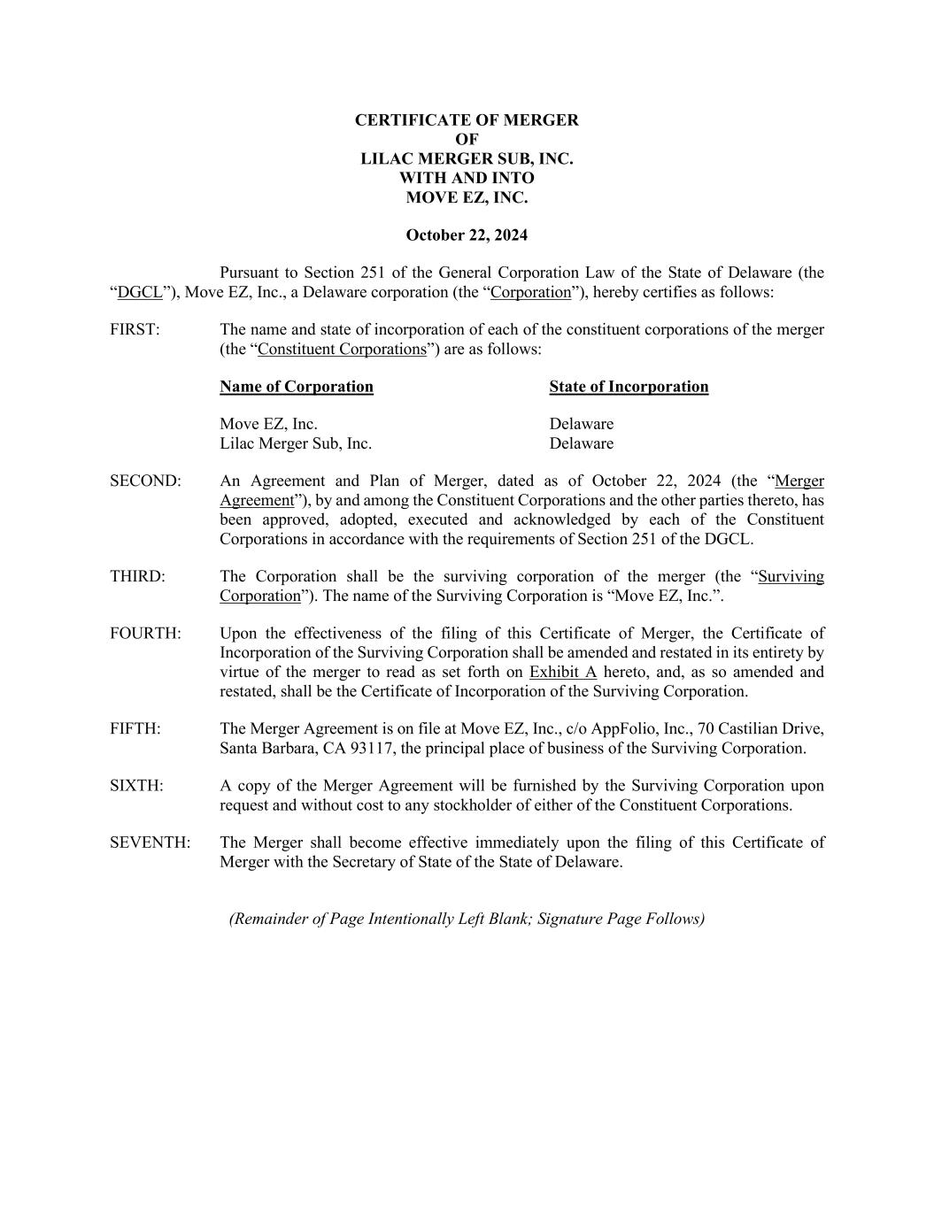 THE INFORMATION CONTAINED IN THESE DOCUMENTS IS CONFIDENTIAL AND IS BEING PROVIDED TO THE STOCKHOLDERS OF MOVE EZ, INC. FOR THE PURPOSE OF DISCLOSING RELEVANT INFORMATION ABOUT THE TRANSACTIONS DESCRIBED IN THESE DOCUMENTS. THE INFORMATION CONTAINED IN THESE DOCUMENTS IS NOT TO BE USED FOR ANY OTHER PURPOSE OR RELEASED TO ANY OTHER PERSON WITHOUT THE EXPRESS PRIOR WRITTEN CONSENT OF COMPANY. INFORMATION STATEMENT AND APPRAISAL RIGHTS in Connection with the Merger of Lilac Merger Sub, Inc. a wholly owned subsidiary of Appfolio, Inc. with and into Move EZ, Inc. October 22, 2024 Dear Stockholder: This information statement (the “Information Statement”) and notice of appraisal rights (the “Appraisal Rights”) is being furnished by Move EZ, Inc., a Delaware corporation (the “Company”) to the stockholders of the Company in connection with the (i) proposed merger as contemplated by that certain Agreement and Plan of Merger (the “Merger Agreement”), a copy of which is provided hereto as Exhibit A, by and among the Company, AppFolio, Inc., a Delaware corporation (“Purchaser”), Lilac Merger Sub., Inc., a Delaware corporation and a wholly-owned subsidiary of Purchaser (“Merger Sub”) and WT Representative LLC, a Delaware limited liability company (the “Equityholder Representative”), pursuant to which Merger Sub will merge with and into the Company, with the Company surviving as a wholly- owned subsidiary of Purchaser, as all is further qualified in the Merger Agreement (the “Merger”). Capitalized terms not defined herein shall have the meanings ascribed to such terms in the Merger Agreement. 1. Approval and Recommendation by the Board. As further outlined below, the Board carefully reviewed and considered the terms and conditions of the Merger Agreement, the Merger and the other transactions contemplated by the Merger Agreement. The Board has (i) determined that the Merger and the other transactions contemplated by the Merger Agreement, on the terms and subject to the conditions set forth in the Merger Agreement, are fair to, and in the best interests of, the Company and its stockholders, (ii) approved and declared advisable the Merger Agreement, the Merger and the other transactions contemplated by the Merger Agreement, on the terms and subject to the conditions set forth in the Merger Agreement, and (iii) recommended that the Stockholders, as defined below, vote in favor of adopting the Merger Agreement and (iv) directed that the Merger Agreement be submitted to such Stockholders for their adoption. The Board considered a number of factors in its decision to approve and recommend the Merger Agreement, the Merger and the transactions contemplated by the Merger Agreement, including: (i) the market for the Company’s products and services and competition among current and potential providers of such products and services; (ii) the business, operations, financial condition, competitive position and prospects of the Company; (iii) current economic, industry and market conditions affecting the Company; (iv) the prospects of the Company as a stand-alone entity; (v) the ability of the Company to carry on its business if the Merger is not consummated; (vi) the potential for other third parties to enter into strategic