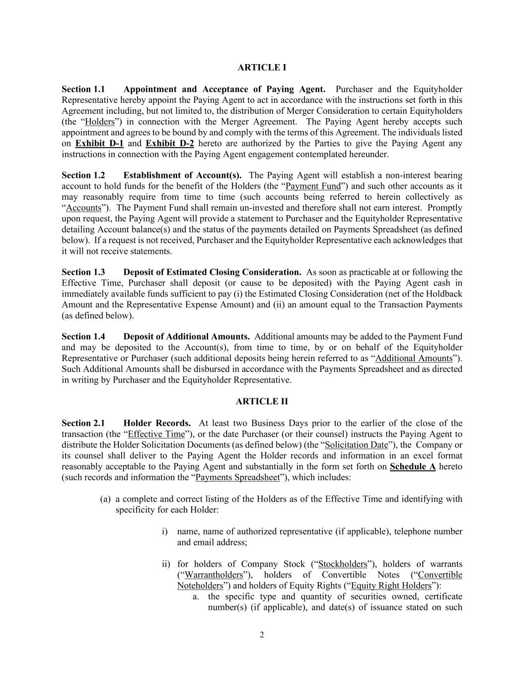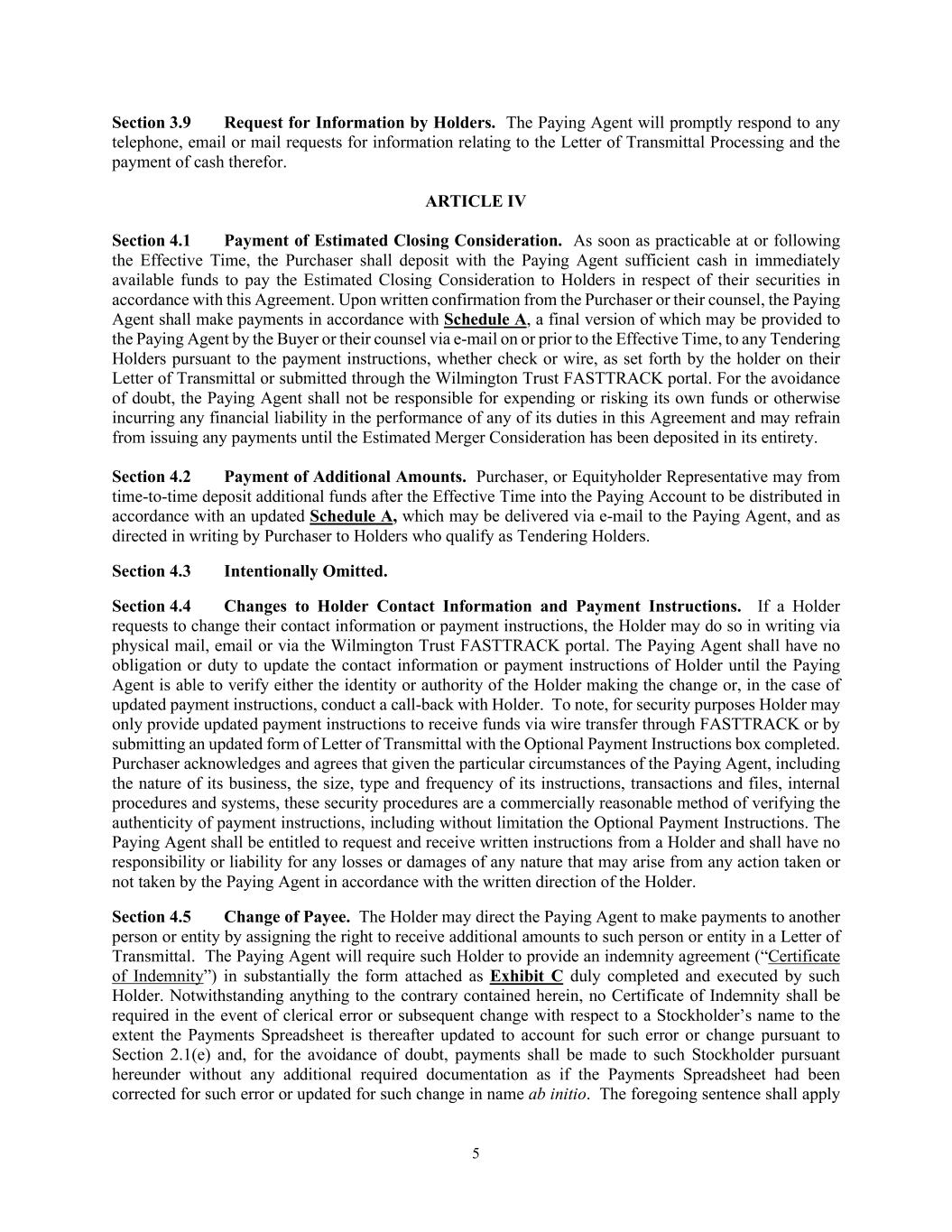 25 cooperate with Equityholder Representative to reduce or mitigate any such withholdings (other than in respect of any withholdings as a result of the Company’s or any Equityholders failure to deliver the Tax documents required under Section 3.04(g), the Letter of Transmittal, the Option Cancellation Agreement, the Warrant Cancellation Agreement or the Convertible Note Cancellation Agreement or in connection with any payments treated as compensation for applicable income Tax purposes). Any such deducted or withheld amounts shall be treated for all purposes of this Agreement and any Transaction Document as having been paid to the Person in respect of which such deduction and withholding was made. Notwithstanding anything in this Agreement to the contrary, any amounts payable pursuant to this Agreement that constitute compensation for U.S. federal, state, local or non-U.S. income Tax purposes shall be paid (and any applicable withholding shall be managed) through the applicable Group Companies’ ordinary payroll procedures. Section 2.10 Appraisal Rights. Notwithstanding anything in this Agreement to the contrary, any Share held by a Stockholder who (a) has not voted in favor of the Merger or consented thereto in writing and (b) has demanded appraisal for such shares of Company Stock in accordance with Section 262 of the DGCL and not otherwise lost, waived or withdrawn such Stockholder’s right to appraisal under Section 262 of the DGCL with respect to such shares (collectively, the “Dissenting Shares”) shall not be converted into the right to receive a portion of the Merger Consideration pursuant to Section 2.02 but instead, at the Effective Time, shall be cancelled and cease to exist and shall represent only those rights provided by Section 262 of the DGCL; provided that if any such Stockholder shall fail to perfect or otherwise shall waive, withdraw or lose the right to appraisal under the DGCL, the right of such Stockholder to such appraisal of such Stockholder’s shares of Company Stock shall cease and such shares of Company Stock shall be deemed converted as of the Effective Time into the right to receive a portion of the Merger Consideration, without interest, as provided in this Article II. The Company shall deliver prompt notice to Purchaser of any demands for appraisal of any shares of Company Stock, and Purchaser shall have the right to participate in all negotiations and proceedings with respect to such demands. Prior to the Effective Time, the Company shall not, without the prior written consent of Purchaser, make any payment with respect to, or settle or offer to settle or approve or agree to any withdrawal of, any such demands, or agree to do any of the foregoing. Section 2.11 Reliance on Closing Certificate and Post-Closing Payment Spreadsheets. Notwithstanding anything to the contrary herein, the Parties each acknowledge and agree that each of Purchaser, Merger Sub, the Surviving Corporation, the Paying Agent and the Equityholder Representative may rely on the Closing Certificate, and each of Purchaser, Merger Sub, the Surviving Corporation and the Paying Agent may rely on each Post-Closing Payment Spreadsheet, in each case, as being true, complete and correct for purposes of the calculation of all cash payments payable to the Equityholders hereunder, and none of Purchaser, Merger Sub, the Surviving Corporation, the Paying Agent and, solely in the case of the Closing Certificate, the Equityholder Representative shall have any liability to any Equityholder or any other Person as a result of such reliance. Once Purchaser has funded any amount to the Paying Agent, Purchaser shall have no further liability with respect to such amount, including with respect to the payment or allocation of such amount to the Equityholders. ARTICLE III THE CLOSING TRANSACTIONS Section 3.01 The Closing. The closing of the Transactions (the “Closing”) shall take place at no later than three (3) Business Days after the last of the conditions set forth in Article VII have been satisfied or waived (other than conditions which, by their nature, are to be satisfied on the Closing Date) via exchange of electronic signatures or on such other date or time or at such other place as the Company and Purchaser may mutually agree upon in writing and shall deemed to be effective as of the open of business. The date of the Closing is referred to herein as the “Closing Date.”