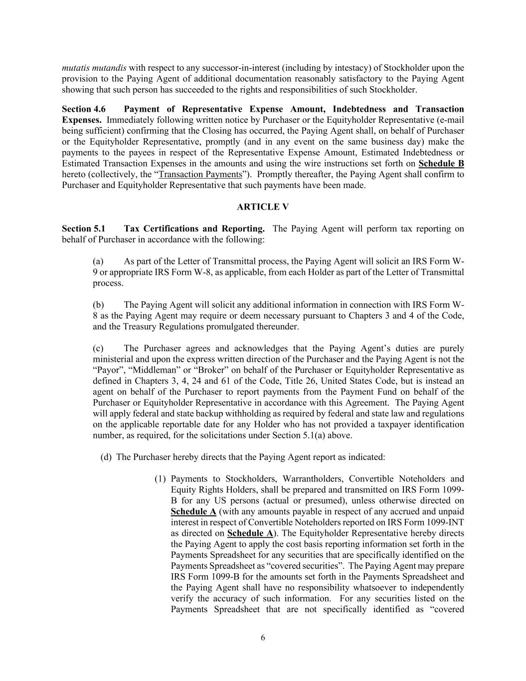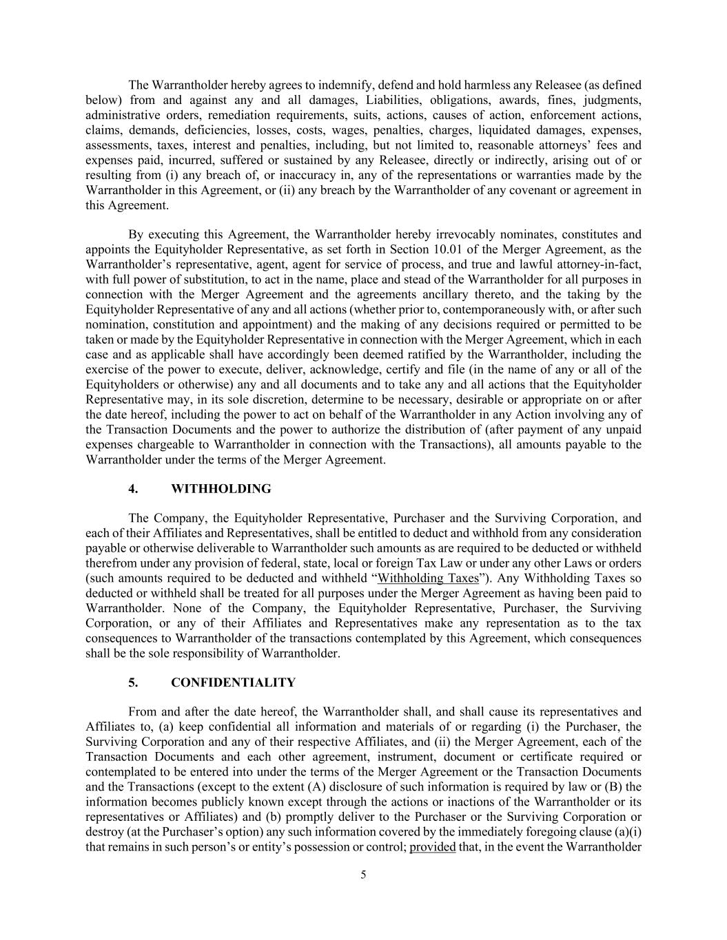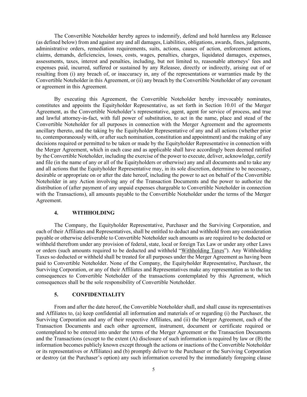 5 The Convertible Noteholder hereby agrees to indemnify, defend and hold harmless any Releasee (as defined below) from and against any and all damages, Liabilities, obligations, awards, fines, judgments, administrative orders, remediation requirements, suits, actions, causes of action, enforcement actions, claims, demands, deficiencies, losses, costs, wages, penalties, charges, liquidated damages, expenses, assessments, taxes, interest and penalties, including, but not limited to, reasonable attorneys’ fees and expenses paid, incurred, suffered or sustained by any Releasee, directly or indirectly, arising out of or resulting from (i) any breach of, or inaccuracy in, any of the representations or warranties made by the Convertible Noteholder in this Agreement, or (ii) any breach by the Convertible Noteholder of any covenant or agreement in this Agreement. By executing this Agreement, the Convertible Noteholder hereby irrevocably nominates, constitutes and appoints the Equityholder Representative, as set forth in Section 10.01 of the Merger Agreement, as the Convertible Noteholder’s representative, agent, agent for service of process, and true and lawful attorney-in-fact, with full power of substitution, to act in the name, place and stead of the Convertible Noteholder for all purposes in connection with the Merger Agreement and the agreements ancillary thereto, and the taking by the Equityholder Representative of any and all actions (whether prior to, contemporaneously with, or after such nomination, constitution and appointment) and the making of any decisions required or permitted to be taken or made by the Equityholder Representative in connection with the Merger Agreement, which in each case and as applicable shall have accordingly been deemed ratified by the Convertible Noteholder, including the exercise of the power to execute, deliver, acknowledge, certify and file (in the name of any or all of the Equityholders or otherwise) any and all documents and to take any and all actions that the Equityholder Representative may, in its sole discretion, determine to be necessary, desirable or appropriate on or after the date hereof, including the power to act on behalf of the Convertible Noteholder in any Action involving any of the Transaction Documents and the power to authorize the distribution of (after payment of any unpaid expenses chargeable to Convertible Noteholder in connection with the Transactions), all amounts payable to the Convertible Noteholder under the terms of the Merger Agreement. 4. WITHHOLDING The Company, the Equityholder Representative, Purchaser and the Surviving Corporation, and each of their Affiliates and Representatives, shall be entitled to deduct and withhold from any consideration payable or otherwise deliverable to Convertible Noteholder such amounts as are required to be deducted or withheld therefrom under any provision of federal, state, local or foreign Tax Law or under any other Laws or orders (such amounts required to be deducted and withheld “Withholding Taxes”). Any Withholding Taxes so deducted or withheld shall be treated for all purposes under the Merger Agreement as having been paid to Convertible Noteholder. None of the Company, the Equityholder Representative, Purchaser, the Surviving Corporation, or any of their Affiliates and Representatives make any representation as to the tax consequences to Convertible Noteholder of the transactions contemplated by this Agreement, which consequences shall be the sole responsibility of Convertible Noteholder. 5. CONFIDENTIALITY From and after the date hereof, the Convertible Noteholder shall, and shall cause its representatives and Affiliates to, (a) keep confidential all information and materials of or regarding (i) the Purchaser, the Surviving Corporation and any of their respective Affiliates, and (ii) the Merger Agreement, each of the Transaction Documents and each other agreement, instrument, document or certificate required or contemplated to be entered into under the terms of the Merger Agreement or the Transaction Documents and the Transactions (except to the extent (A) disclosure of such information is required by law or (B) the information becomes publicly known except through the actions or inactions of the Convertible Noteholder or its representatives or Affiliates) and (b) promptly deliver to the Purchaser or the Surviving Corporation or destroy (at the Purchaser’s option) any such information covered by the immediately foregoing clause