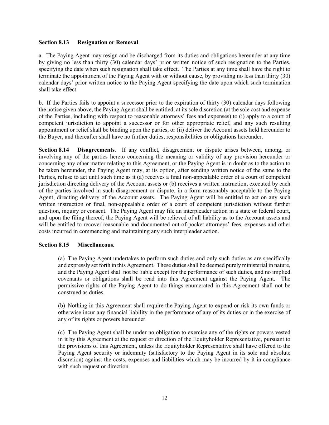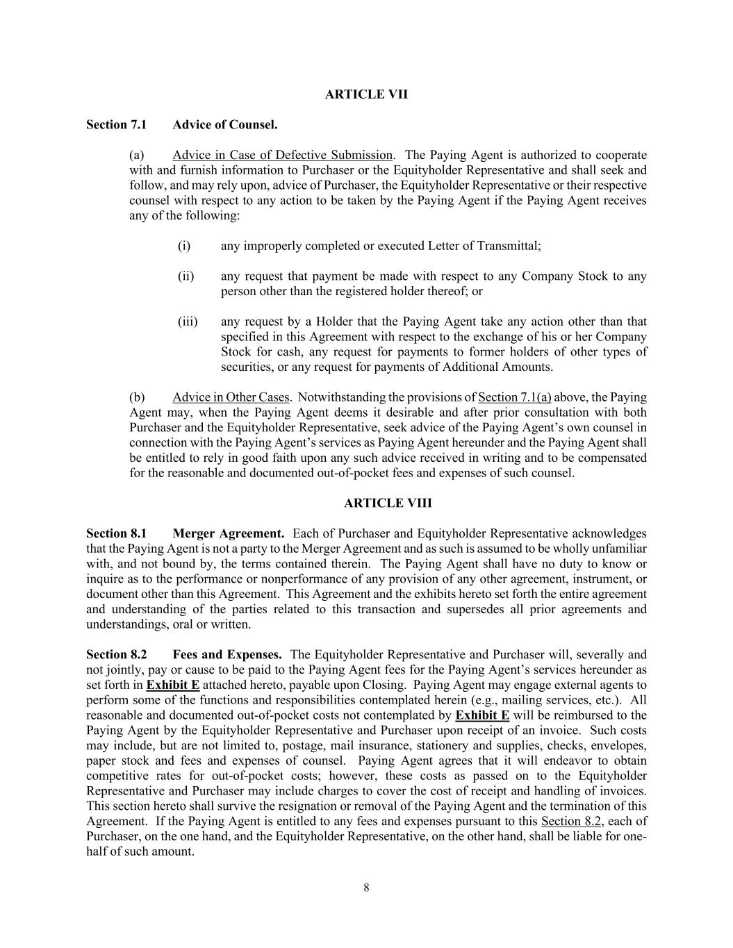 73 Expense Amount, if any, will be distributed to the Paying Agent (for distribution to the Equityholders in accordance with the Paying Agent Agreement as may be modified by the applicable Post-Closing Payment Spreadsheet); provided that, in the case of Optionholders who are current or former employees of the Company, the respective portions of such funds payable in respect of Options held by the same shall be paid to the Surviving Corporation, and the Surviving Corporation shall (subject to any applicable Tax withholdings) deliver such funds to such former holders of Options through the Company’s payroll systems. (h) No member of the Advisory Committee shall incur no liability of any kind with respect to any action or omission by such person in connection with services under the WT Engagement Letter, except in the event of liability directly arising from such member’s willful misconduct. In no event shall a member of the Advisory Committee be responsible or liable for special, indirect, punitive, incidental or consequential loss or damages or any kind whatsoever. The Equityholders shall defend and hold harmless the each member of the Advisory Committee for and against any and all losses, liabilities, damages, claims, penalties, fees, fines, costs and expenses arising out of or in connection with any Action brought against any such Advisory Committee resulting from service on the Advisory Committee (“Advisor Losses”), in each case as the Advisor Loss is suffered or incurred, provided that in the event that any such Advisor Loss is finally adjudicated to have been directly caused by willful misconduct of such member of the Advisory Committee, such member will reimburse the Equityholders the amount of such indemnified Representative Losses to the extent attributable to such willful misconduct. Section 10.02 No Third-Party Beneficiaries. Except as expressly set forth in Section 2.11, Section 6.04, Section 6.12, Article VIII, Section 10.01(h) and Section 10.18 this Agreement is not intended to, and shall not, confer any rights or remedies upon any Person other than the Parties and their respective successors and permitted assigns; provided, however, that with respect to breaches by Purchaser, Merger Sub or the Surviving Corporation of their representations, warranties, covenants and agreements set forth in this Agreement or any certificate delivered pursuant hereto, the Equityholder Representative may, seek recourse on behalf of the Equityholders (who shall be deemed express third party beneficiaries of such right) to the extent permitted under this Agreement (for the avoidance of doubt, subject in all cases to Section 8.08). Section 10.03 Specific Performance. (a) The Parties agree that irreparable damage would occur if any provision of this Agreement were not performed in accordance with the terms hereof and that the Parties shall be entitled to an injunction or injunctions to prevent breaches or threatened breaches of this Agreement or to enforce specifically the performance of the terms and provisions hereof, in addition to any other remedy to which they are entitled at Law or in equity. For the avoidance of doubt, notwithstanding anything else in this Agreement, in no event shall specific performance of Purchaser’s or Merger Sub’s obligation to consummate the Transactions survive any termination of this Agreement. (b) Each Party further agrees that: (i) no such Party will oppose the granting of an injunction or specific performance as provided herein on the basis that the other party has an adequate remedy at law or that an award of specific performance is not an appropriate remedy for any reason at law or equity; (ii) no such Party will oppose the specific performance of the terms and provisions of this Agreement; and (iii) no other Party or any other Person shall be required to obtain, furnish, or post any bond or similar instrument in connection with or as a condition to obtaining any remedy referred to in this Section 10.03 and each Party irrevocably waives any right it may have to require the obtaining, furnishing, or posting of any such bond or similar instrument. Section 10.04 Entire Agreement. The Transaction Documents together with constitute the entire agreement among the Parties and supersede any prior understandings, agreements or representations by or