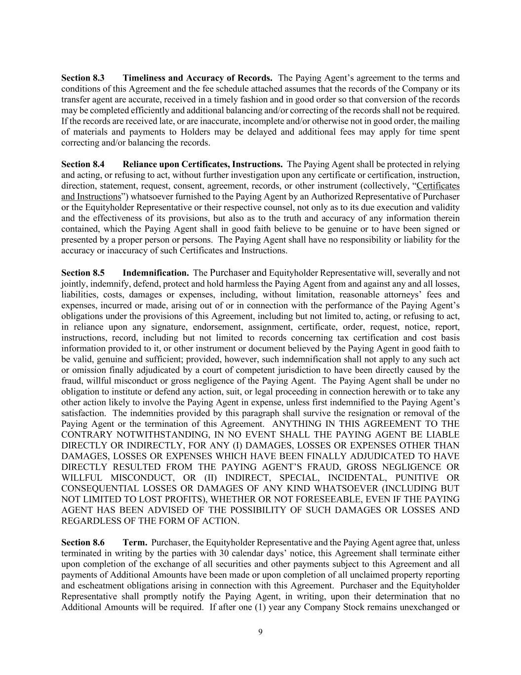 71 (b) that nothing herein shall relieve any Party from Liability for any willful breach of any provision hereof or in respect of any claim based on Fraud. ARTICLE X MISCELLANEOUS Section 10.01 The Equityholder Representative. (a) Each Equityholder, by virtue of such Equityholder’s approval of this Agreement, delivery of a Letter of Transmittal, an Option Cancellation Agreement or a Warrant Cancellation Agreements or acceptance of any consideration contemplated by Article II, shall have irrevocably nominated, constituted and appointed the Equityholder Representative as the agent, agent for service of process and true and lawful attorney-in-fact of such Equityholder, with full power of substitution, to act in the name, place and stead of such Equityholder with respect to this Agreement and the taking by the Equityholder Representative of any and all actions (whether prior to, contemporaneously with, or after such nomination, constitution and appointment) and the making of any decisions required or permitted to be taken or made by the Equityholder Representative under this Agreement, which in each case and as applicable shall have accordingly been ratified by such Equityholder, including the exercise of the power to execute, deliver, acknowledge, certify and file (in the name of any or all of the Equityholders or otherwise) any and all documents and to take any and all actions that the Equityholder Representative may, in its sole discretion, determine to be necessary, desirable or appropriate on or after the date hereof, including the power to act on behalf of any Equityholder in any dispute, litigation or arbitration involving this Agreement and the power to receive on behalf of, and to distribute (after payment of any unpaid expenses chargeable to an Equityholder in connection with the Transactions), all amounts payable to such Equityholder under the terms of this Agreement. (b) All notices delivered by Purchaser or the Surviving Corporation to the Equityholder Representative (whether pursuant to this Agreement or otherwise) shall constitute notice to the Equityholders. (c) Without limiting the generality of this Section 10.01 and notwithstanding anything to the contrary contained in this Agreement, Purchaser shall be entitled to deal exclusively with the Equityholder Representative on all matters with respect to the Transactions, and each Purchaser Indemnified Party shall be entitled to deal exclusively with the Equityholder Representative on all matters relating to Article VIII, and each of them shall be entitled to rely conclusively (without further evidence of any kind whatsoever) on any document executed or purported to be executed on behalf of any Equityholder by the Equityholder Representative, and on any other action taken or purported to be taken by the Equityholder Representative on behalf of any Equityholder by the Equityholder Representative, as fully binding upon such Equityholder. (d) The Equityholder Representative may resign at any time following thirty (30) days written notice to the Equityholders and Purchaser. If the Equityholder Representative shall resign, die, become disabled, be dissolved or otherwise be unable to fulfill its responsibilities as representative of the Equityholders, then the Advisory Committee shall, within thirty (30) days after such resignation, death, disability or dissolution, appoint a successor representative reasonably acceptable to Purchaser. Any successor appointed pursuant to either of the two (2) preceding sentences shall become the “Equityholder Representative” for purposes of this Agreement. (e) The Equityholder Representative shall incur no liability of any kind with respect to any action or omission by the Equityholder Representative in connection with the Equityholder Representative’s services pursuant to this Agreement any agreements ancillary hereto, except in the event