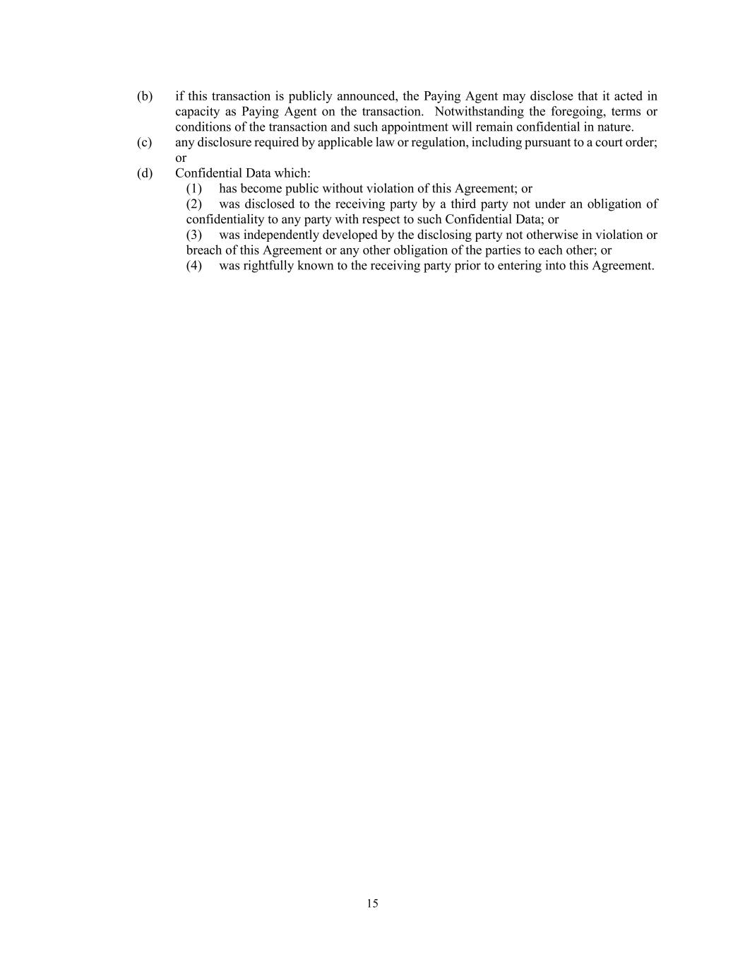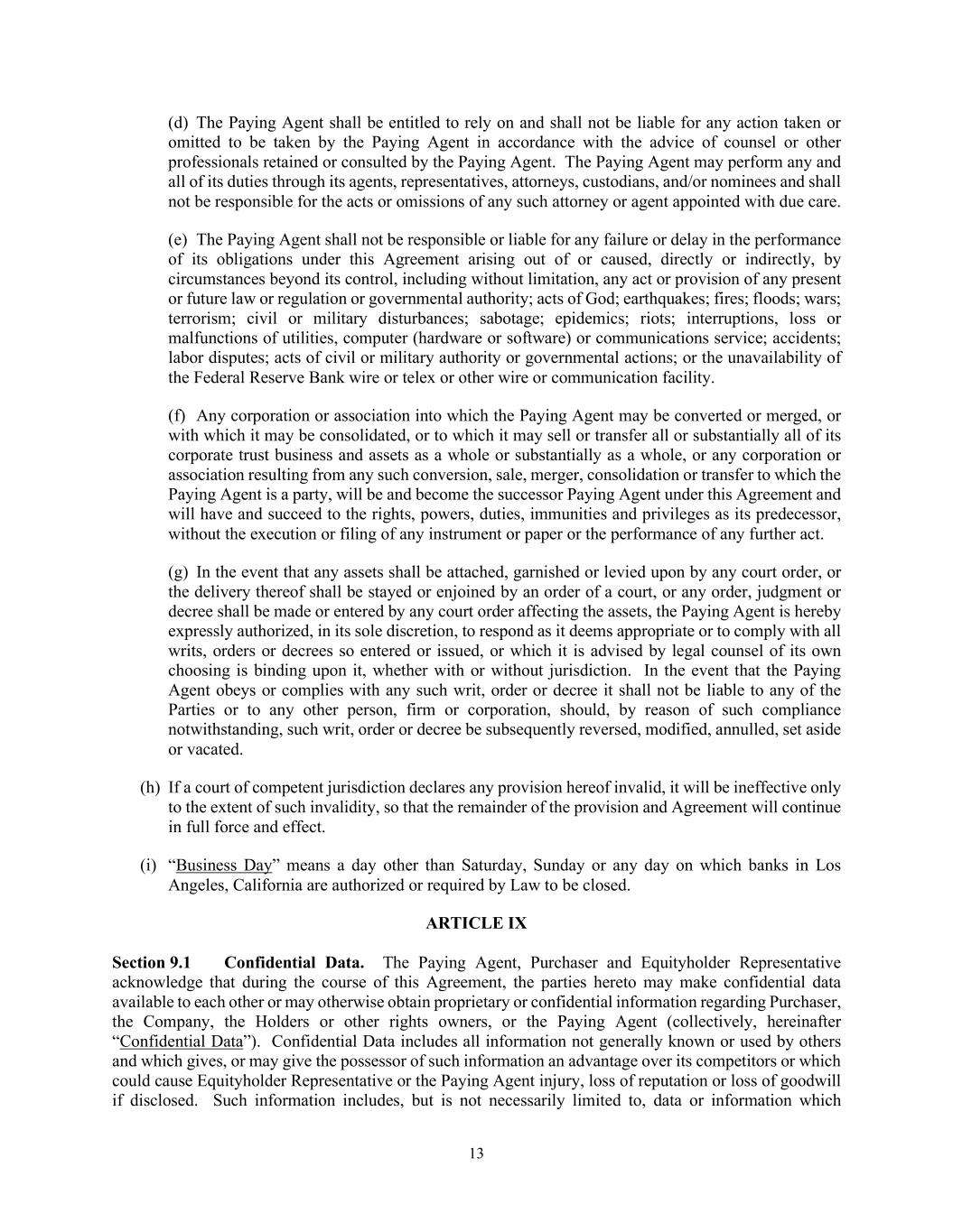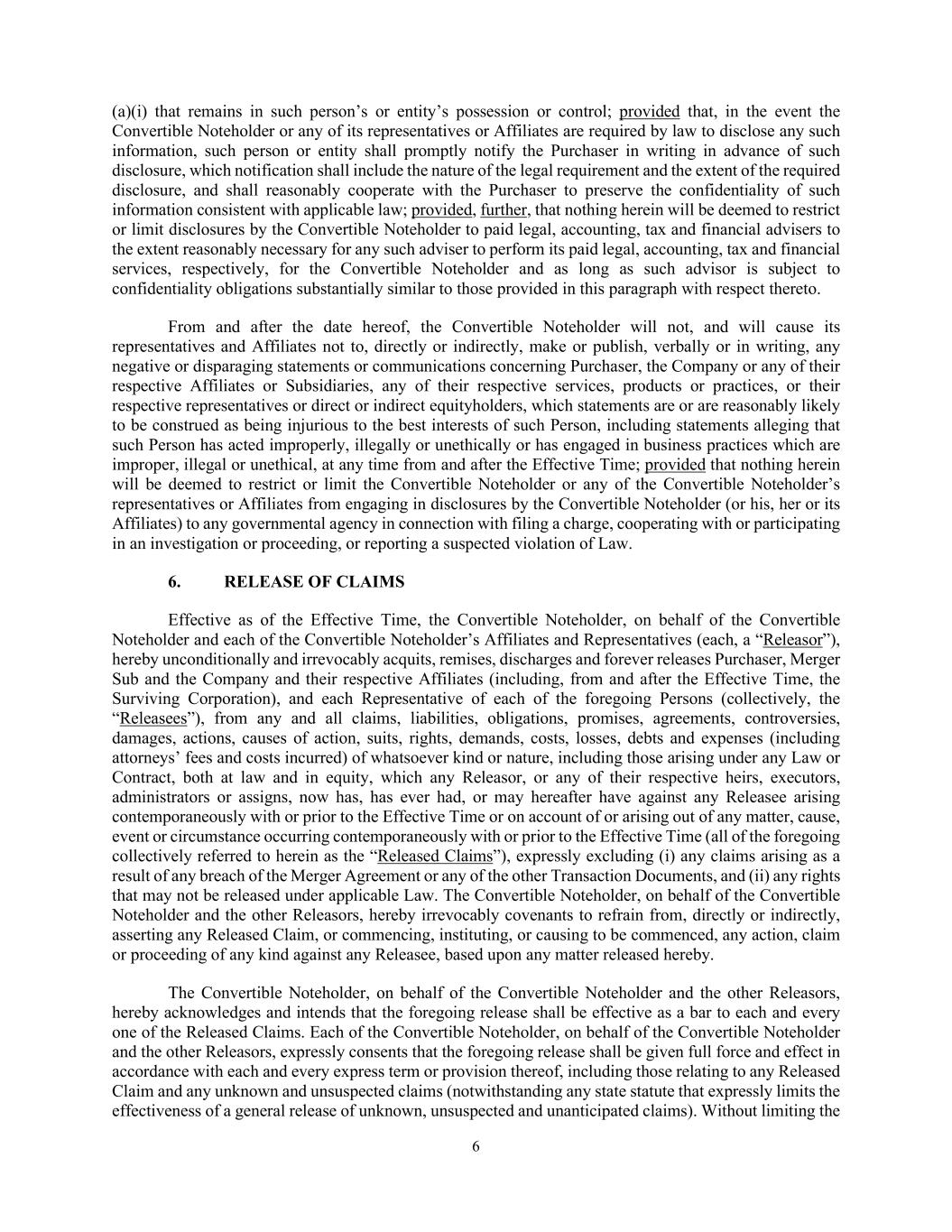 6 (a)(i) that remains in such person’s or entity’s possession or control; provided that, in the event the Convertible Noteholder or any of its representatives or Affiliates are required by law to disclose any such information, such person or entity shall promptly notify the Purchaser in writing in advance of such disclosure, which notification shall include the nature of the legal requirement and the extent of the required disclosure, and shall reasonably cooperate with the Purchaser to preserve the confidentiality of such information consistent with applicable law; provided, further, that nothing herein will be deemed to restrict or limit disclosures by the Convertible Noteholder to paid legal, accounting, tax and financial advisers to the extent reasonably necessary for any such adviser to perform its paid legal, accounting, tax and financial services, respectively, for the Convertible Noteholder and as long as such advisor is subject to confidentiality obligations substantially similar to those provided in this paragraph with respect thereto. From and after the date hereof, the Convertible Noteholder will not, and will cause its representatives and Affiliates not to, directly or indirectly, make or publish, verbally or in writing, any negative or disparaging statements or communications concerning Purchaser, the Company or any of their respective Affiliates or Subsidiaries, any of their respective services, products or practices, or their respective representatives or direct or indirect equityholders, which statements are or are reasonably likely to be construed as being injurious to the best interests of such Person, including statements alleging that such Person has acted improperly, illegally or unethically or has engaged in business practices which are improper, illegal or unethical, at any time from and after the Effective Time; provided that nothing herein will be deemed to restrict or limit the Convertible Noteholder or any of the Convertible Noteholder’s representatives or Affiliates from engaging in disclosures by the Convertible Noteholder (or his, her or its Affiliates) to any governmental agency in connection with filing a charge, cooperating with or participating in an investigation or proceeding, or reporting a suspected violation of Law. 6. RELEASE OF CLAIMS Effective as of the Effective Time, the Convertible Noteholder, on behalf of the Convertible Noteholder and each of the Convertible Noteholder’s Affiliates and Representatives (each, a “Releasor”), hereby unconditionally and irrevocably acquits, remises, discharges and forever releases Purchaser, Merger Sub and the Company and their respective Affiliates (including, from and after the Effective Time, the Surviving Corporation), and each Representative of each of the foregoing Persons (collectively, the “Releasees”), from any and all claims, liabilities, obligations, promises, agreements, controversies, damages, actions, causes of action, suits, rights, demands, costs, losses, debts and expenses (including attorneys’ fees and costs incurred) of whatsoever kind or nature, including those arising under any Law or Contract, both at law and in equity, which any Releasor, or any of their respective heirs, executors, administrators or assigns, now has, has ever had, or may hereafter have against any Releasee arising contemporaneously with or prior to the Effective Time or on account of or arising out of any matter, cause, event or circumstance occurring contemporaneously with or prior to the Effective Time (all of the foregoing collectively referred to herein as the “Released Claims”), expressly excluding (i) any claims arising as a result of any breach of the Merger Agreement or any of the other Transaction Documents, and (ii) any rights that may not be released under applicable Law. The Convertible Noteholder, on behalf of the Convertible Noteholder and the other Releasors, hereby irrevocably covenants to refrain from, directly or indirectly, asserting any Released Claim, or commencing, instituting, or causing to be commenced, any action, claim or proceeding of any kind against any Releasee, based upon any matter released hereby. The Convertible Noteholder, on behalf of the Convertible Noteholder and the other Releasors, hereby acknowledges and intends that the foregoing release shall be effective as a bar to each and every one of the Released Claims. Each of the Convertible Noteholder, on behalf of the Convertible Noteholder and the other Releasors, expressly consents that the foregoing release shall be given full force and effect in accordance with each and every express term or provision thereof, including those relating to any Released Claim and any unknown and unsuspected claims (notwithstanding any state statute that expressly limits the effectiveness of a general release of unknown, unsuspected and unanticipated claims). Without limiting the