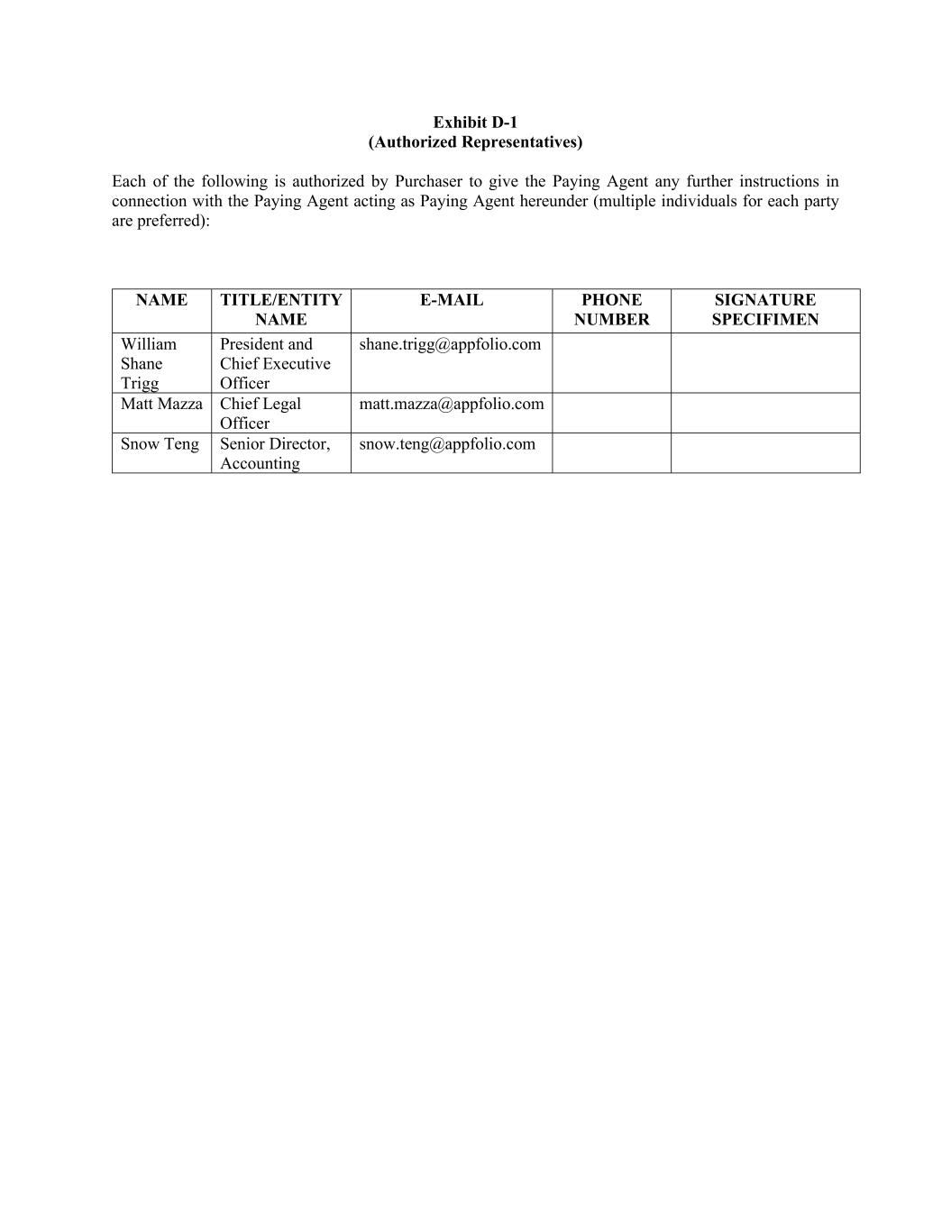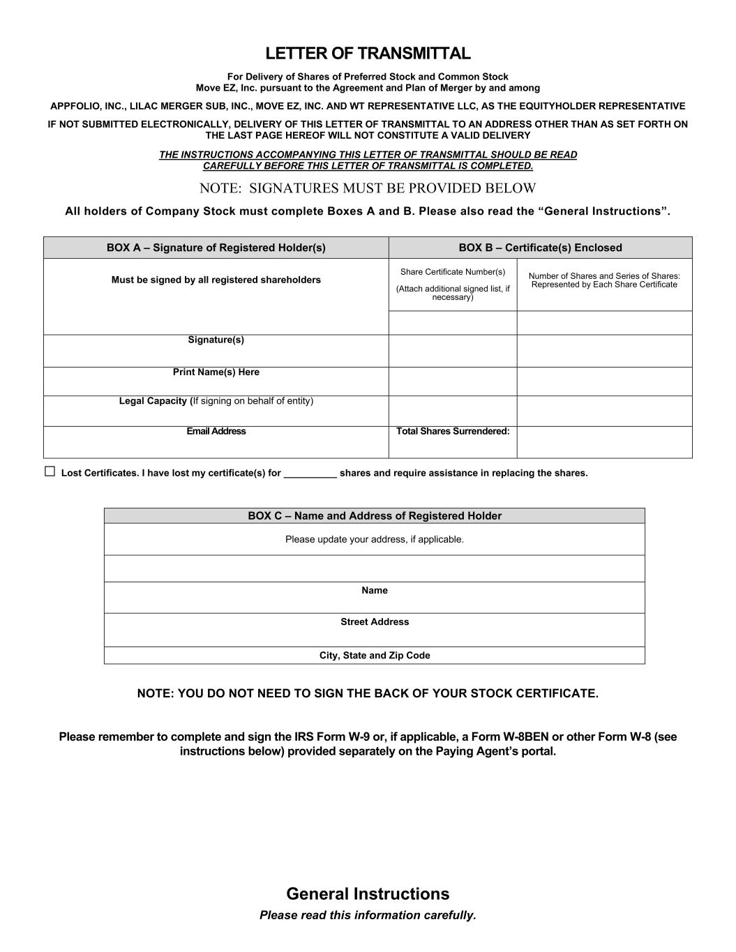 LETTER OF TRANSMITTAL For Delivery of Shares of Preferred Stock and Common Stock Move EZ, Inc. pursuant to the Agreement and Plan of Merger by and among APPFOLIO, INC., LILAC MERGER SUB, INC., MOVE EZ, INC. AND WT REPRESENTATIVE LLC, AS THE EQUITYHOLDER REPRESENTATIVE IF NOT SUBMITTED ELECTRONICALLY, DELIVERY OF THIS LETTER OF TRANSMITTAL TO AN ADDRESS OTHER THAN AS SET FORTH ON THE LAST PAGE HEREOF WILL NOT CONSTITUTE A VALID DELIVERY THE INSTRUCTIONS ACCOMPANYING THIS LETTER OF TRANSMITTAL SHOULD BE READ CAREFULLY BEFORE THIS LETTER OF TRANSMITTAL IS COMPLETED. NOTE: SIGNATURES MUST BE PROVIDED BELOW All holders of Company Stock must complete Boxes A and B. Please also read the “General Instructions”. BOX A – Signature of Registered Holder(s) BOX B – Certificate(s) Enclosed Must be signed by all registered shareholders Share Certificate Number(s) (Attach additional signed list, if necessary) Number of Shares and Series of Shares: Represented by Each Share Certificate Signature(s) Print Name(s) Here Legal Capacity (If signing on behalf of entity) Email Address Total Shares Surrendered: □ Lost Certificates. I have lost my certificate(s) for __________ shares and require assistance in replacing the shares. BOX C – Name and Address of Registered Holder Please update your address, if applicable. Name Street Address City, State and Zip Code NOTE: YOU DO NOT NEED TO SIGN THE BACK OF YOUR STOCK CERTIFICATE. Please remember to complete and sign the IRS Form W-9 or, if applicable, a Form W-8BEN or other Form W-8 (see instructions below) provided separately on the Paying Agent’s portal. General Instructions Please read this information carefully.