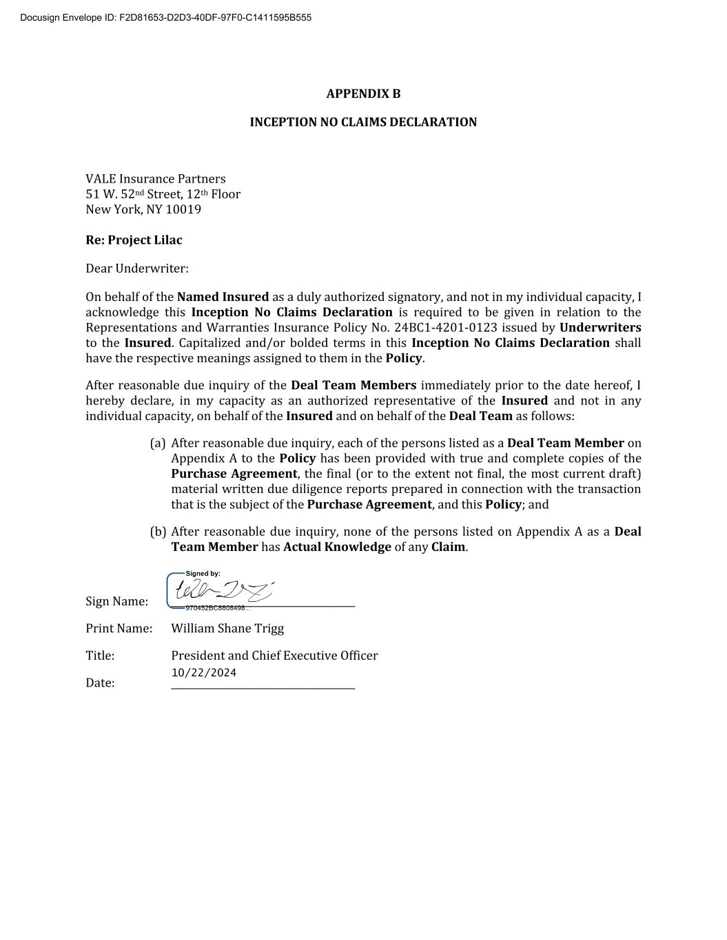 Signature Page to Written Consent of Stockholders IN WITNESS WHEREOF, by executing this Action by Written Consent of Stockholders, each undersigned stockholder is giving written consent with respect to all shares of the Company’s capital stock held by such stockholder in favor of the above resolutions as of the last date of execution by a stockholder hereunder. This Action by Written Consent of Stockholders may be executed and delivered by facsimile, electronic mail (including pdf or any electronic signature complying with the U.S. federal ESIGN Act of 2000, e.g., www.docusign.com) or other transmission method and any counterpart so delivered shall be deemed to have been duly and validly delivered and be valid and effective for all purposes. Any copy, facsimile or other reliable reproduction of this action may be substituted or used in lieu of the original writing for any and all purposes for which the original writing could be used, provided that such copy, facsimile or other reproduction be a complete reproduction of the entire original writing. STOCKHOLDERS: THE TRAVELERS INDEMNITY COMPANY By: _____________________________ Date:_________________________ Maria Olivio, Executive Vice President