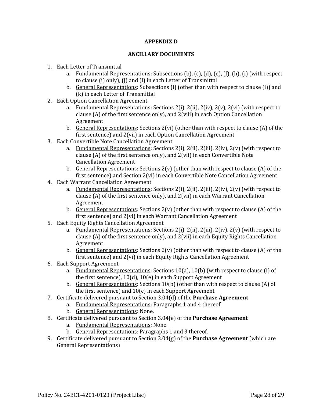 3 (i) the Convertible Noteholder is the owner, beneficially and of record, of the Convertible Note set forth in the Description of Convertible Note on Exhibit A attached hereto, free and clear of any Liens or any restrictions on transfer (other than any restrictions under the Securities Act of 1933, as amended, and state securities laws). Except for this Agreement, the Convertible Note held by the Convertible Noteholder and any Company Stock, Options or Warrants held by the Convertible Noteholder (in respect of which the Convertible Noteholder has delivered or shall deliver a duly executed Letter of Transmittal, Option Cancellation Agreement or Warrant Cancellation Agreement, as applicable), the Convertible Noteholder is not a party to any option, warrant, right, contract, call, put or other agreement or commitment providing for the disposition or acquisition of any securities of the Company; (ii) the Description of the Convertible Note set forth in Exhibit A (including with respect to the Investment Amount) is correct and complete and represents all of the outstanding convertible promissory notes owned or held by the Convertible Noteholder as of the date of this Agreement, and the Convertible Noteholder does not own or have any right to any other convertible promissory note; (iii) the Convertible Noteholder has not converted or sold, transferred, assigned, pledged or otherwise disposed of any interest in the Convertible Note (including any interest in any equity into which the Convertible Note is convertible), and the Convertible Note (including any equity into which the Convertible Note is convertible) is not subject to any encumbrance, restriction on transfer, claim, lien, pledge, option, charge, security interest, defect of title or other similar right of any third party, whether arising by operation of law or otherwise; (iv) the Convertible Noteholder has the full right, power, authority and legal capacity to execute and deliver this Agreement and the other Transaction Documents to which it is party, to consummate the transactions contemplated hereby and thereby and to perform his, her or its obligations hereunder and under the Merger Agreement and the other Transaction Documents, and assuming due authorization, execution and delivery by the other parties thereto, this Agreement and the other Transaction Documents to which it is party constitute the legal, valid and binding obligations of the Convertible Noteholder and each enforceable in accordance with their respective terms and conditions (except as such enforceability may be limited by bankruptcy, insolvency, moratorium or similar Laws affecting creditor’s rights generally and by general equitable principles); (v) the execution and delivery by the Convertible Noteholder of this Agreement and the other Transaction Documents to which it is party, and the consummation of the transactions contemplated hereby and thereby or the performance of any obligations under any other Transaction Document to which it is party, will not (A) violate or conflict any provisions of the Convertible Noteholder governing documents, if applicable, (B) violate, conflict with or result in a violation of, or constitute a default (whether after the giving of notice, lapse of time or both) under any provision of any Law to which the Convertible Noteholder is subject, or (C) violate, conflict with or result in a breach of any provision of, constitute a default (or an event which, with notice or lapse of time or both, would constitute a default) under, result in or create in any Person the right to terminate, modify or cancel, require any notice, authorization or consent under any agreement by which the Convertible Noteholder is a party, or by which any of the Convertible Noteholder’s assets or properties are bound. The Convertible Noteholder is not required to give any notice to, make any filing with, or obtain any authorization, consent or approval of any Governmental Authority in connection with its execution and delivery of this Agreement or the other Transaction Documents;