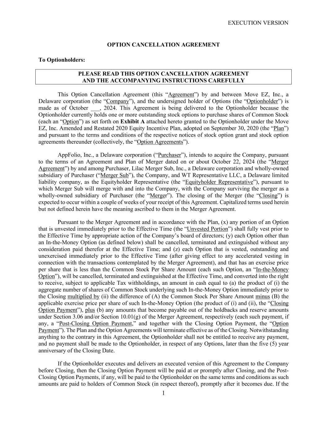 EXECUTION VERSION 1 CONVERTIBLE NOTE CANCELLATION AGREEMENT To Convertible Noteholders: PLEASE READ THIS CONVERTIBLE NOTE CANCELLATION AGREEMENT AND THE ACCOMPANYING INSTRUCTIONS CAREFULLY This Convertible Note Cancellation Agreement (this “Agreement”) by and between Move EZ, Inc., a Delaware corporation (the “Company”), and the undersigned holder of Convertible Note (the “Convertible Noteholder”) is made as of October 22, 2024. This Agreement is being delivered to the Convertible Noteholder because the Convertible Noteholder currently holds an outstanding convertible promissory note between the Company and the Convertible Noteholder (the “Convertible Note”) as set forth on Exhibit A attached hereto. AppFolio, Inc., a Delaware corporation (“Purchaser”), intends to acquire the Company, pursuant to the terms of an Agreement and Plan of Merger dated on or about October 22, 2024 (the “Merger Agreement”) by and among Purchaser, Lilac Merger Sub, Inc., a Delaware corporation and wholly-owned subsidiary of Purchaser (“Merger Sub”), the Company, and WT Representative, LLC, a Delaware limited liability company, as the Equityholder Representative (the “Equityholder Representative”), pursuant to which Merger Sub will merge with and into the Company, with the Company surviving the merger as a wholly-owned subsidiary of Purchaser (the “Merger”). The closing of the Merger (the “Closing”) is expected to occur within a couple of weeks of your receipt of this Agreement. Capitalized terms used herein but not defined herein have the meaning ascribed to them in the Merger Agreement. Pursuant to the Merger Agreement and Section 2(c) of the Convertible Note, the Convertible Note will be cancelled, terminated and extinguished at the Effective Time, and converted into the right to receive, subject to applicable Tax withholdings, if any, an amount in cash equal to (a) the amount that would have been paid under Section 2.02(a) of the Merger Agreement had the Convertible Noteholder elected, as of immediately prior to the Effective Time, to convert the Investment Amount (as defined under the Convertible Note) into a number of shares of Series A Preferred Stock equal to the quotient determined by dividing (i) the Investment Amount, by (ii) $1.847705 (the “Closing Convertible Note Payment”), plus (b) any amounts that become payable out of the holdbacks and reserve amounts under Section 3.06 and/or Section 10.01(g) of the Merger Agreement, respectively (each such payment, if any, a “Post-Closing Convertible Note Payment,” and together with the Closing Convertible Note Payment, the “Convertible Note Payment”). Without limiting the foregoing, this Agreement shall constitute the Convertible Noteholder’s written notice to the Company of its election under Section 2(c) of the Convertible Note that the Convertible Note be repaid in a manner described in Section 2(c)(y). If the Convertible Noteholder executes and delivers an executed version of this Agreement to the Company before Closing, then the Closing Convertible Note Payment will be paid at or promptly after Closing, and the Post-Closing Convertible Note Payments, if any, will be paid to the Convertible Noteholder on the same terms and conditions as such amounts are paid to holders of Series A Preferred Stock (in respect thereof), promptly after it becomes due. If the Convertible Noteholder does not execute and deliver an effective Agreement to the Company before Closing, then the Convertible Noteholder’s Closing Convertible Note Payment will be held until the Agreement is turned in, or if not turned in by December 31, 2024, then, notwithstanding anything to the contrary in this Agreement, the Convertible Noteholder will forfeit his, her or its right to receive the Convertible Note Payment. The Convertible Note Payment will be made through the Paying Agent. In order to receive the Convertible Note Payment, the Convertible Noteholder must deliver to the Paying Agent a duly completed and executed copy of IRS Form W-9 or IRS Form W-8BEN (or other applicable IRS Form W-8 which may be obtained on the Internal Revenue Service website at www.IRS.gov), as applicable.