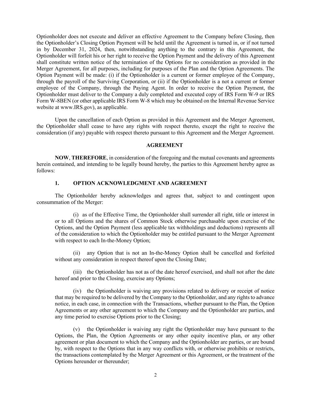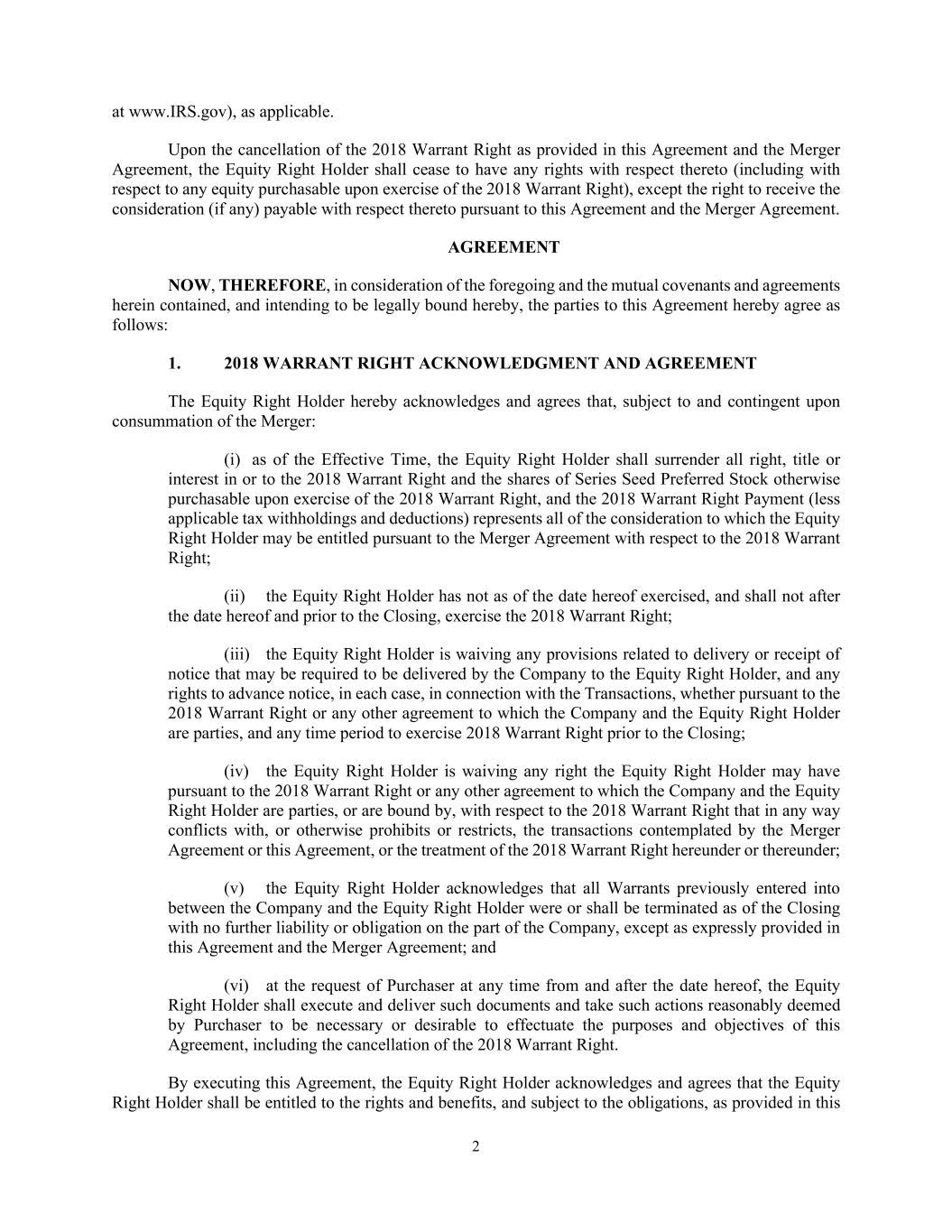 2 at www.IRS.gov), as applicable. Upon the cancellation of the 2018 Warrant Right as provided in this Agreement and the Merger Agreement, the Equity Right Holder shall cease to have any rights with respect thereto (including with respect to any equity purchasable upon exercise of the 2018 Warrant Right), except the right to receive the consideration (if any) payable with respect thereto pursuant to this Agreement and the Merger Agreement. AGREEMENT NOW, THEREFORE, in consideration of the foregoing and the mutual covenants and agreements herein contained, and intending to be legally bound hereby, the parties to this Agreement hereby agree as follows: 1. 2018 WARRANT RIGHT ACKNOWLEDGMENT AND AGREEMENT The Equity Right Holder hereby acknowledges and agrees that, subject to and contingent upon consummation of the Merger: (i) as of the Effective Time, the Equity Right Holder shall surrender all right, title or interest in or to the 2018 Warrant Right and the shares of Series Seed Preferred Stock otherwise purchasable upon exercise of the 2018 Warrant Right, and the 2018 Warrant Right Payment (less applicable tax withholdings and deductions) represents all of the consideration to which the Equity Right Holder may be entitled pursuant to the Merger Agreement with respect to the 2018 Warrant Right; (ii) the Equity Right Holder has not as of the date hereof exercised, and shall not after the date hereof and prior to the Closing, exercise the 2018 Warrant Right; (iii) the Equity Right Holder is waiving any provisions related to delivery or receipt of notice that may be required to be delivered by the Company to the Equity Right Holder, and any rights to advance notice, in each case, in connection with the Transactions, whether pursuant to the 2018 Warrant Right or any other agreement to which the Company and the Equity Right Holder are parties, and any time period to exercise 2018 Warrant Right prior to the Closing; (iv) the Equity Right Holder is waiving any right the Equity Right Holder may have pursuant to the 2018 Warrant Right or any other agreement to which the Company and the Equity Right Holder are parties, or are bound by, with respect to the 2018 Warrant Right that in any way conflicts with, or otherwise prohibits or restricts, the transactions contemplated by the Merger Agreement or this Agreement, or the treatment of the 2018 Warrant Right hereunder or thereunder; (v) the Equity Right Holder acknowledges that all Warrants previously entered into between the Company and the Equity Right Holder were or shall be terminated as of the Closing with no further liability or obligation on the part of the Company, except as expressly provided in this Agreement and the Merger Agreement; and (vi) at the request of Purchaser at any time from and after the date hereof, the Equity Right Holder shall execute and deliver such documents and take such actions reasonably deemed by Purchaser to be necessary or desirable to effectuate the purposes and objectives of this Agreement, including the cancellation of the 2018 Warrant Right. By executing this Agreement, the Equity Right Holder acknowledges and agrees that the Equity Right Holder shall be entitled to the rights and benefits, and subject to the obligations, as provided in this