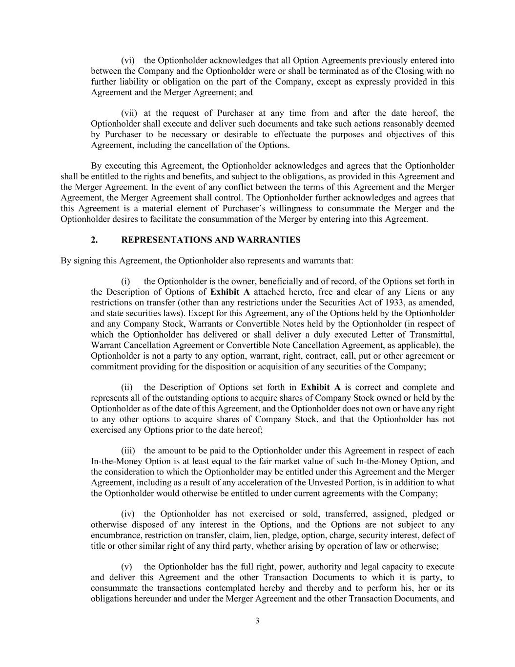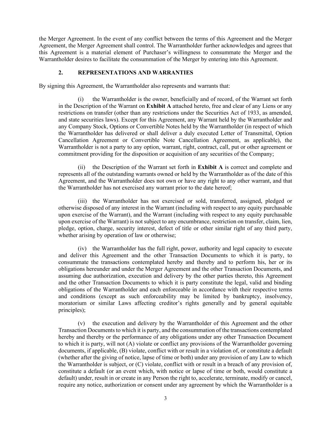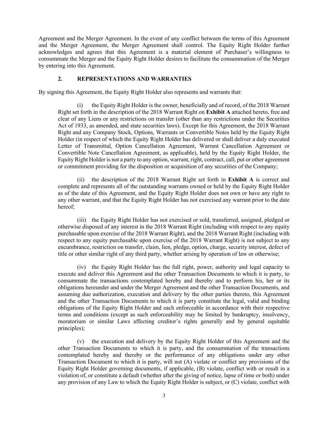 3 Agreement and the Merger Agreement. In the event of any conflict between the terms of this Agreement and the Merger Agreement, the Merger Agreement shall control. The Equity Right Holder further acknowledges and agrees that this Agreement is a material element of Purchaser’s willingness to consummate the Merger and the Equity Right Holder desires to facilitate the consummation of the Merger by entering into this Agreement. 2. REPRESENTATIONS AND WARRANTIES By signing this Agreement, the Equity Right Holder also represents and warrants that: (i) the Equity Right Holder is the owner, beneficially and of record, of the 2018 Warrant Right set forth in the description of the 2018 Warrant Right on Exhibit A attached hereto, free and clear of any Liens or any restrictions on transfer (other than any restrictions under the Securities Act of 1933, as amended, and state securities laws). Except for this Agreement, the 2018 Warrant Right and any Company Stock, Options, Warrants or Convertible Notes held by the Equity Right Holder (in respect of which the Equity Right Holder has delivered or shall deliver a duly executed Letter of Transmittal, Option Cancellation Agreement, Warrant Cancellation Agreement or Convertible Note Cancellation Agreement, as applicable), held by the Equity Right Holder, the Equity Right Holder is not a party to any option, warrant, right, contract, call, put or other agreement or commitment providing for the disposition or acquisition of any securities of the Company; (ii) the description of the 2018 Warrant Right set forth in Exhibit A is correct and complete and represents all of the outstanding warrants owned or held by the Equity Right Holder as of the date of this Agreement, and the Equity Right Holder does not own or have any right to any other warrant, and that the Equity Right Holder has not exercised any warrant prior to the date hereof; (iii) the Equity Right Holder has not exercised or sold, transferred, assigned, pledged or otherwise disposed of any interest in the 2018 Warrant Right (including with respect to any equity purchasable upon exercise of the 2018 Warrant Right), and the 2018 Warrant Right (including with respect to any equity purchasable upon exercise of the 2018 Warrant Right) is not subject to any encumbrance, restriction on transfer, claim, lien, pledge, option, charge, security interest, defect of title or other similar right of any third party, whether arising by operation of law or otherwise; (iv) the Equity Right Holder has the full right, power, authority and legal capacity to execute and deliver this Agreement and the other Transaction Documents to which it is party, to consummate the transactions contemplated hereby and thereby and to perform his, her or its obligations hereunder and under the Merger Agreement and the other Transaction Documents, and assuming due authorization, execution and delivery by the other parties thereto, this Agreement and the other Transaction Documents to which it is party constitute the legal, valid and binding obligations of the Equity Right Holder and each enforceable in accordance with their respective terms and conditions (except as such enforceability may be limited by bankruptcy, insolvency, moratorium or similar Laws affecting creditor’s rights generally and by general equitable principles); (v) the execution and delivery by the Equity Right Holder of this Agreement and the other Transaction Documents to which it is party, and the consummation of the transactions contemplated hereby and thereby or the performance of any obligations under any other Transaction Document to which it is party, will not (A) violate or conflict any provisions of the Equity Right Holder governing documents, if applicable, (B) violate, conflict with or result in a violation of, or constitute a default (whether after the giving of notice, lapse of time or both) under any provision of any Law to which the Equity Right Holder is subject, or (C) violate, conflict with