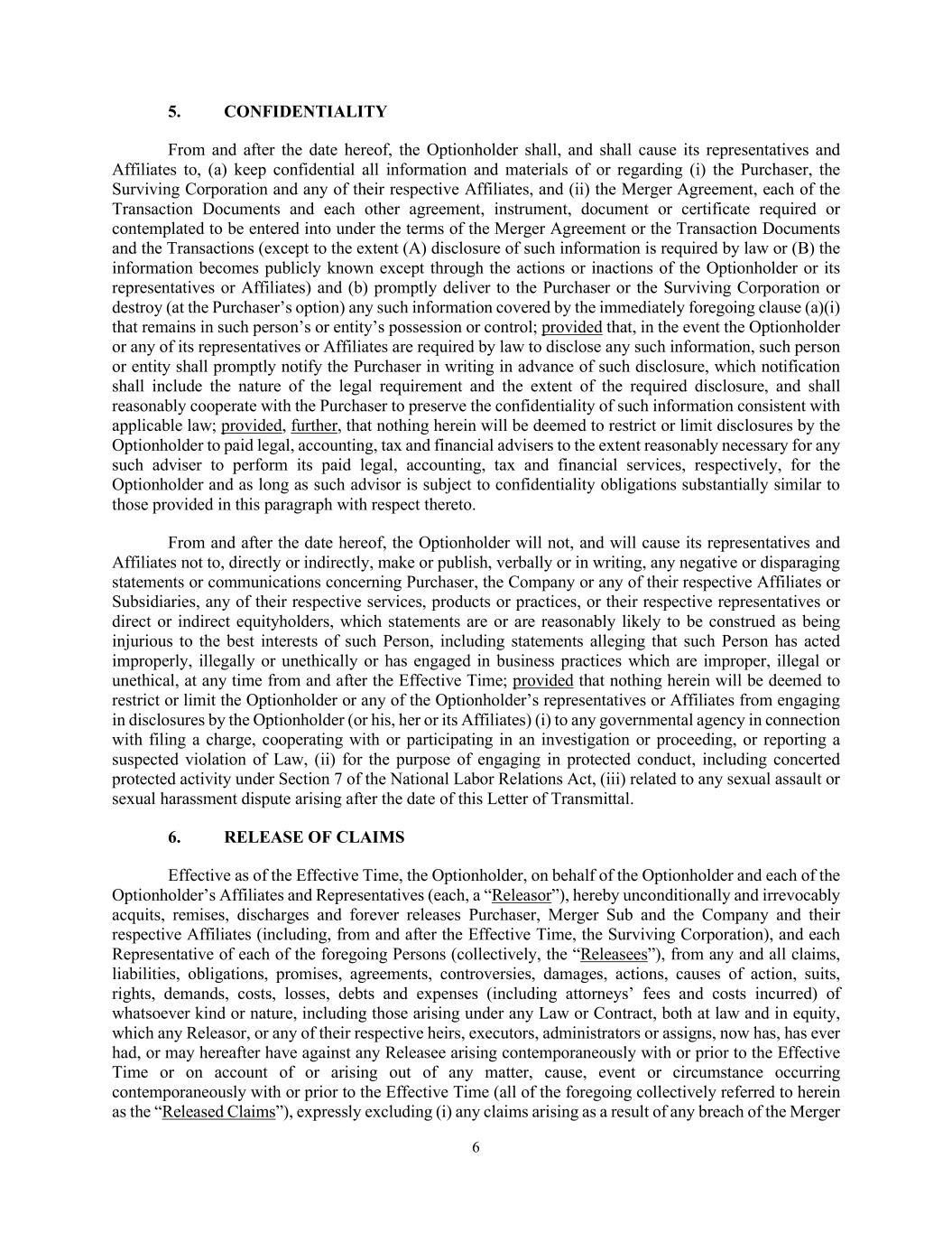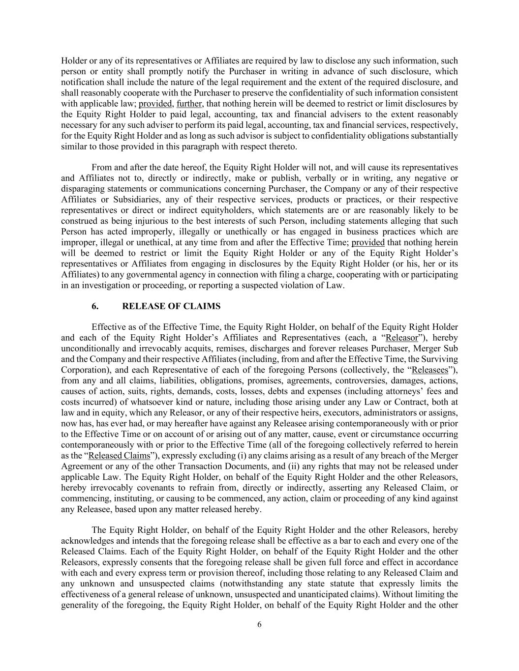 6 Holder or any of its representatives or Affiliates are required by law to disclose any such information, such person or entity shall promptly notify the Purchaser in writing in advance of such disclosure, which notification shall include the nature of the legal requirement and the extent of the required disclosure, and shall reasonably cooperate with the Purchaser to preserve the confidentiality of such information consistent with applicable law; provided, further, that nothing herein will be deemed to restrict or limit disclosures by the Equity Right Holder to paid legal, accounting, tax and financial advisers to the extent reasonably necessary for any such adviser to perform its paid legal, accounting, tax and financial services, respectively, for the Equity Right Holder and as long as such advisor is subject to confidentiality obligations substantially similar to those provided in this paragraph with respect thereto. From and after the date hereof, the Equity Right Holder will not, and will cause its representatives and Affiliates not to, directly or indirectly, make or publish, verbally or in writing, any negative or disparaging statements or communications concerning Purchaser, the Company or any of their respective Affiliates or Subsidiaries, any of their respective services, products or practices, or their respective representatives or direct or indirect equityholders, which statements are or are reasonably likely to be construed as being injurious to the best interests of such Person, including statements alleging that such Person has acted improperly, illegally or unethically or has engaged in business practices which are improper, illegal or unethical, at any time from and after the Effective Time; provided that nothing herein will be deemed to restrict or limit the Equity Right Holder or any of the Equity Right Holder’s representatives or Affiliates from engaging in disclosures by the Equity Right Holder (or his, her or its Affiliates) to any governmental agency in connection with filing a charge, cooperating with or participating in an investigation or proceeding, or reporting a suspected violation of Law. 6. RELEASE OF CLAIMS Effective as of the Effective Time, the Equity Right Holder, on behalf of the Equity Right Holder and each of the Equity Right Holder’s Affiliates and Representatives (each, a “Releasor”), hereby unconditionally and irrevocably acquits, remises, discharges and forever releases Purchaser, Merger Sub and the Company and their respective Affiliates (including, from and after the Effective Time, the Surviving Corporation), and each Representative of each of the foregoing Persons (collectively, the “Releasees”), from any and all claims, liabilities, obligations, promises, agreements, controversies, damages, actions, causes of action, suits, rights, demands, costs, losses, debts and expenses (including attorneys’ fees and costs incurred) of whatsoever kind or nature, including those arising under any Law or Contract, both at law and in equity, which any Releasor, or any of their respective heirs, executors, administrators or assigns, now has, has ever had, or may hereafter have against any Releasee arising contemporaneously with or prior to the Effective Time or on account of or arising out of any matter, cause, event or circumstance occurring contemporaneously with or prior to the Effective Time (all of the foregoing collectively referred to herein as the “Released Claims”), expressly excluding (i) any claims arising as a result of any breach of the Merger Agreement or any of the other Transaction Documents, and (ii) any rights that may not be released under applicable Law. The Equity Right Holder, on behalf of the Equity Right Holder and the other Releasors, hereby irrevocably covenants to refrain from, directly or indirectly, asserting any Released Claim, or commencing, instituting, or causing to be commenced, any action, claim or proceeding of any kind against any Releasee, based upon any matter released hereby. The Equity Right Holder, on behalf of the Equity Right Holder and the other Releasors, hereby acknowledges and intends that the foregoing release shall be effective as a bar to each and every one of the Released Claims. Each of the Equity Right Holder, on behalf of the Equity Right Holder and the other Releasors, expressly consents that the foregoing release shall be given full force and effect in accordance with each and every express term or provision thereof, including those relating to any Released Claim and any unknown and unsuspected claims (notwithstanding any state statute that expressly limits the effectiveness of a general release of unknown, unsuspected and unanticipated claims). Without limiting the generality of the foregoing, the Equity Right Holder, on behalf of the Equity Right Holder and the other