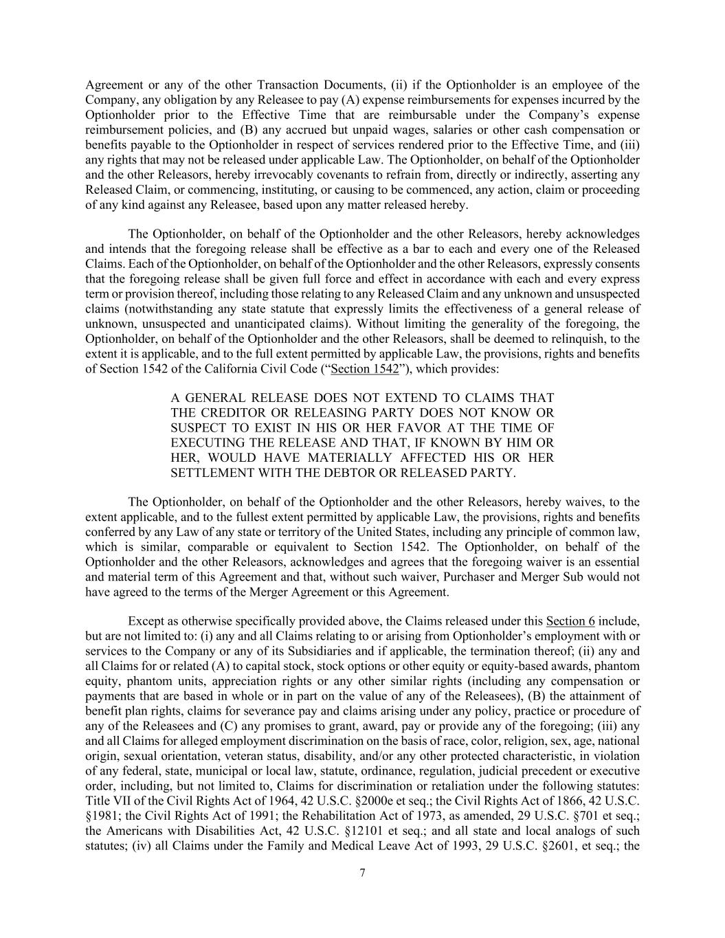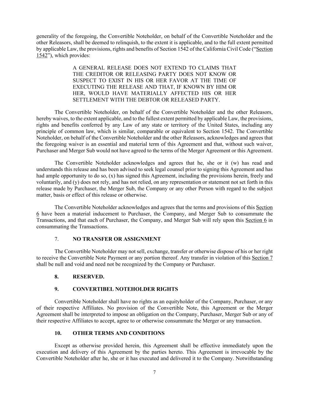 7 generality of the foregoing, the Convertible Noteholder, on behalf of the Convertible Noteholder and the other Releasors, shall be deemed to relinquish, to the extent it is applicable, and to the full extent permitted by applicable Law, the provisions, rights and benefits of Section 1542 of the California Civil Code (“Section 1542”), which provides: A GENERAL RELEASE DOES NOT EXTEND TO CLAIMS THAT THE CREDITOR OR RELEASING PARTY DOES NOT KNOW OR SUSPECT TO EXIST IN HIS OR HER FAVOR AT THE TIME OF EXECUTING THE RELEASE AND THAT, IF KNOWN BY HIM OR HER, WOULD HAVE MATERIALLY AFFECTED HIS OR HER SETTLEMENT WITH THE DEBTOR OR RELEASED PARTY. The Convertible Noteholder, on behalf of the Convertible Noteholder and the other Releasors, hereby waives, to the extent applicable, and to the fullest extent permitted by applicable Law, the provisions, rights and benefits conferred by any Law of any state or territory of the United States, including any principle of common law, which is similar, comparable or equivalent to Section 1542. The Convertible Noteholder, on behalf of the Convertible Noteholder and the other Releasors, acknowledges and agrees that the foregoing waiver is an essential and material term of this Agreement and that, without such waiver, Purchaser and Merger Sub would not have agreed to the terms of the Merger Agreement or this Agreement. The Convertible Noteholder acknowledges and agrees that he, she or it (w) has read and understands this release and has been advised to seek legal counsel prior to signing this Agreement and has had ample opportunity to do so, (x) has signed this Agreement, including the provisions herein, freely and voluntarily, and (y) does not rely, and has not relied, on any representation or statement not set forth in this release made by Purchaser, the Merger Sub, the Company or any other Person with regard to the subject matter, basis or effect of this release or otherwise. The Convertible Noteholder acknowledges and agrees that the terms and provisions of this Section 6 have been a material inducement to Purchaser, the Company, and Merger Sub to consummate the Transactions, and that each of Purchaser, the Company, and Merger Sub will rely upon this Section 6 in consummating the Transactions. 7. NO TRANSFER OR ASSIGNMENT The Convertible Noteholder may not sell, exchange, transfer or otherwise dispose of his or her right to receive the Convertible Note Payment or any portion thereof. Any transfer in violation of this Section 7 shall be null and void and need not be recognized by the Company or Purchaser. 8. RESERVED. 9. CONVERTIBEL NOTEHOLDER RIGHTS Convertible Noteholder shall have no rights as an equityholder of the Company, Purchaser, or any of their respective Affiliates. No provision of the Convertible Note, this Agreement or the Merger Agreement shall be interpreted to impose an obligation on the Company, Purchaser, Merger Sub or any of their respective Affiliates to accept, agree to or otherwise consummate the Merger or any transaction. 10. OTHER TERMS AND CONDITIONS Except as otherwise provided herein, this Agreement shall be effective immediately upon the execution and delivery of this Agreement by the parties hereto. This Agreement is irrevocable by the Convertible Noteholder after he, she or it has executed and delivered it to the Company. Notwithstanding