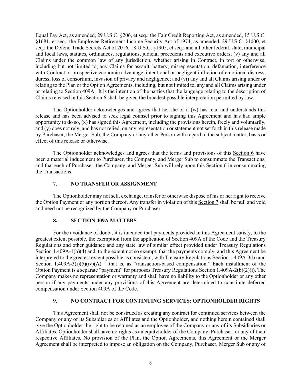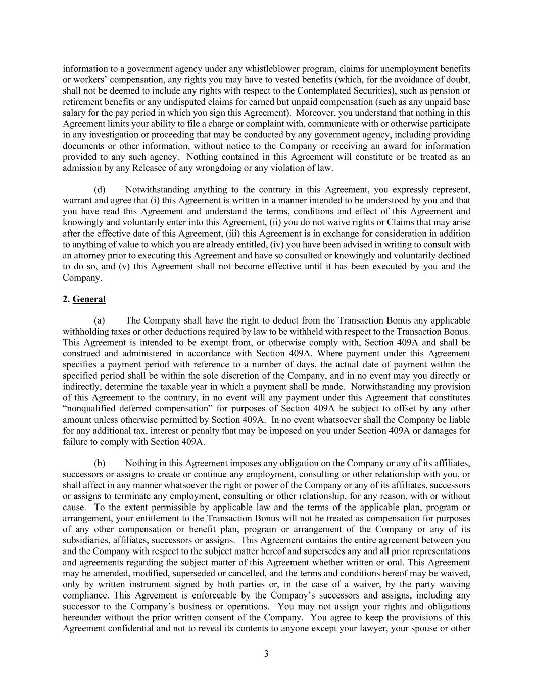3 information to a government agency under any whistleblower program, claims for unemployment benefits or workers’ compensation, any rights you may have to vested benefits (which, for the avoidance of doubt, shall not be deemed to include any rights with respect to the Contemplated Securities), such as pension or retirement benefits or any undisputed claims for earned but unpaid compensation (such as any unpaid base salary for the pay period in which you sign this Agreement). Moreover, you understand that nothing in this Agreement limits your ability to file a charge or complaint with, communicate with or otherwise participate in any investigation or proceeding that may be conducted by any government agency, including providing documents or other information, without notice to the Company or receiving an award for information provided to any such agency. Nothing contained in this Agreement will constitute or be treated as an admission by any Releasee of any wrongdoing or any violation of law. (d) Notwithstanding anything to the contrary in this Agreement, you expressly represent, warrant and agree that (i) this Agreement is written in a manner intended to be understood by you and that you have read this Agreement and understand the terms, conditions and effect of this Agreement and knowingly and voluntarily enter into this Agreement, (ii) you do not waive rights or Claims that may arise after the effective date of this Agreement, (iii) this Agreement is in exchange for consideration in addition to anything of value to which you are already entitled, (iv) you have been advised in writing to consult with an attorney prior to executing this Agreement and have so consulted or knowingly and voluntarily declined to do so, and (v) this Agreement shall not become effective until it has been executed by you and the Company. 2. General (a) The Company shall have the right to deduct from the Transaction Bonus any applicable withholding taxes or other deductions required by law to be withheld with respect to the Transaction Bonus. This Agreement is intended to be exempt from, or otherwise comply with, Section 409A and shall be construed and administered in accordance with Section 409A. Where payment under this Agreement specifies a payment period with reference to a number of days, the actual date of payment within the specified period shall be within the sole discretion of the Company, and in no event may you directly or indirectly, determine the taxable year in which a payment shall be made. Notwithstanding any provision of this Agreement to the contrary, in no event will any payment under this Agreement that constitutes “nonqualified deferred compensation” for purposes of Section 409A be subject to offset by any other amount unless otherwise permitted by Section 409A. In no event whatsoever shall the Company be liable for any additional tax, interest or penalty that may be imposed on you under Section 409A or damages for failure to comply with Section 409A. (b) Nothing in this Agreement imposes any obligation on the Company or any of its affiliates, successors or assigns to create or continue any employment, consulting or other relationship with you, or shall affect in any manner whatsoever the right or power of the Company or any of its affiliates, successors or assigns to terminate any employment, consulting or other relationship, for any reason, with or without cause. To the extent permissible by applicable law and the terms of the applicable plan, program or arrangement, your entitlement to the Transaction Bonus will not be treated as compensation for purposes of any other compensation or benefit plan, program or arrangement of the Company or any of its subsidiaries, affiliates, successors or assigns. This Agreement contains the entire agreement between you and the Company with respect to the subject matter hereof and supersedes any and all prior representations and agreements regarding the subject matter of this Agreement whether written or oral. This Agreement may be amended, modified, superseded or cancelled, and the terms and conditions hereof may be waived, only by written instrument signed by both parties or, in the case of a waiver, by the party waiving compliance. This Agreement is enforceable by the Company’s successors and assigns, including any successor to the Company’s business or operations. You may not assign your rights and obligations hereunder without the prior written consent of the Company. You agree to keep the provisions of this Agreement confidential and not to reveal its contents to anyone except your lawyer, your spouse or other