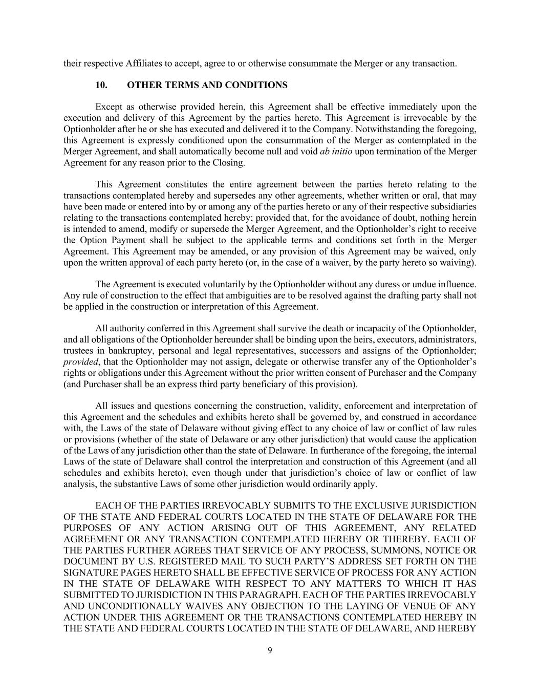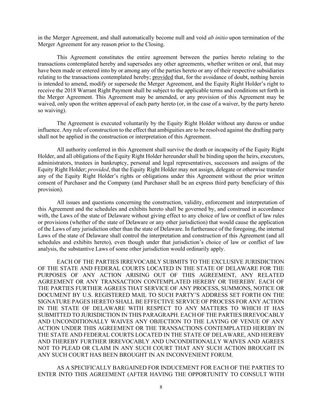 8 in the Merger Agreement, and shall automatically become null and void ab initio upon termination of the Merger Agreement for any reason prior to the Closing. This Agreement constitutes the entire agreement between the parties hereto relating to the transactions contemplated hereby and supersedes any other agreements, whether written or oral, that may have been made or entered into by or among any of the parties hereto or any of their respective subsidiaries relating to the transactions contemplated hereby; provided that, for the avoidance of doubt, nothing herein is intended to amend, modify or supersede the Merger Agreement, and the Equity Right Holder’s right to receive the 2018 Warrant Right Payment shall be subject to the applicable terms and conditions set forth in the Merger Agreement. This Agreement may be amended, or any provision of this Agreement may be waived, only upon the written approval of each party hereto (or, in the case of a waiver, by the party hereto so waiving). The Agreement is executed voluntarily by the Equity Right Holder without any duress or undue influence. Any rule of construction to the effect that ambiguities are to be resolved against the drafting party shall not be applied in the construction or interpretation of this Agreement. All authority conferred in this Agreement shall survive the death or incapacity of the Equity Right Holder, and all obligations of the Equity Right Holder hereunder shall be binding upon the heirs, executors, administrators, trustees in bankruptcy, personal and legal representatives, successors and assigns of the Equity Right Holder; provided, that the Equity Right Holder may not assign, delegate or otherwise transfer any of the Equity Right Holder’s rights or obligations under this Agreement without the prior written consent of Purchaser and the Company (and Purchaser shall be an express third party beneficiary of this provision). All issues and questions concerning the construction, validity, enforcement and interpretation of this Agreement and the schedules and exhibits hereto shall be governed by, and construed in accordance with, the Laws of the state of Delaware without giving effect to any choice of law or conflict of law rules or provisions (whether of the state of Delaware or any other jurisdiction) that would cause the application of the Laws of any jurisdiction other than the state of Delaware. In furtherance of the foregoing, the internal Laws of the state of Delaware shall control the interpretation and construction of this Agreement (and all schedules and exhibits hereto), even though under that jurisdiction’s choice of law or conflict of law analysis, the substantive Laws of some other jurisdiction would ordinarily apply. EACH OF THE PARTIES IRREVOCABLY SUBMITS TO THE EXCLUSIVE JURISDICTION OF THE STATE AND FEDERAL COURTS LOCATED IN THE STATE OF DELAWARE FOR THE PURPOSES OF ANY ACTION ARISING OUT OF THIS AGREEMENT, ANY RELATED AGREEMENT OR ANY TRANSACTION CONTEMPLATED HEREBY OR THEREBY. EACH OF THE PARTIES FURTHER AGREES THAT SERVICE OF ANY PROCESS, SUMMONS, NOTICE OR DOCUMENT BY U.S. REGISTERED MAIL TO SUCH PARTY’S ADDRESS SET FORTH ON THE SIGNATURE PAGES HERETO SHALL BE EFFECTIVE SERVICE OF PROCESS FOR ANY ACTION IN THE STATE OF DELAWARE WITH RESPECT TO ANY MATTERS TO WHICH IT HAS SUBMITTED TO JURISDICTION IN THIS PARAGRAPH. EACH OF THE PARTIES IRREVOCABLY AND UNCONDITIONALLY WAIVES ANY OBJECTION TO THE LAYING OF VENUE OF ANY ACTION UNDER THIS AGREEMENT OR THE TRANSACTIONS CONTEMPLATED HEREBY IN THE STATE AND FEDERAL COURTS LOCATED IN THE STATE OF DELAWARE, AND HEREBY AND THEREBY FURTHER IRREVOCABLY AND UNCONDITIONALLY WAIVES AND AGREES NOT TO PLEAD OR CLAIM IN ANY SUCH COURT THAT ANY SUCH ACTION BROUGHT IN ANY SUCH COURT HAS BEEN BROUGHT IN AN INCONVENIENT FORUM. AS A SPECIFICALLY BARGAINED FOR INDUCEMENT FOR EACH OF THE PARTIES TO ENTER INTO THIS AGREEMENT (AFTER HAVING THE OPPORTUNITY TO CONSULT WITH